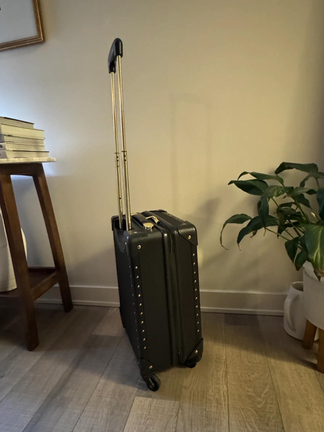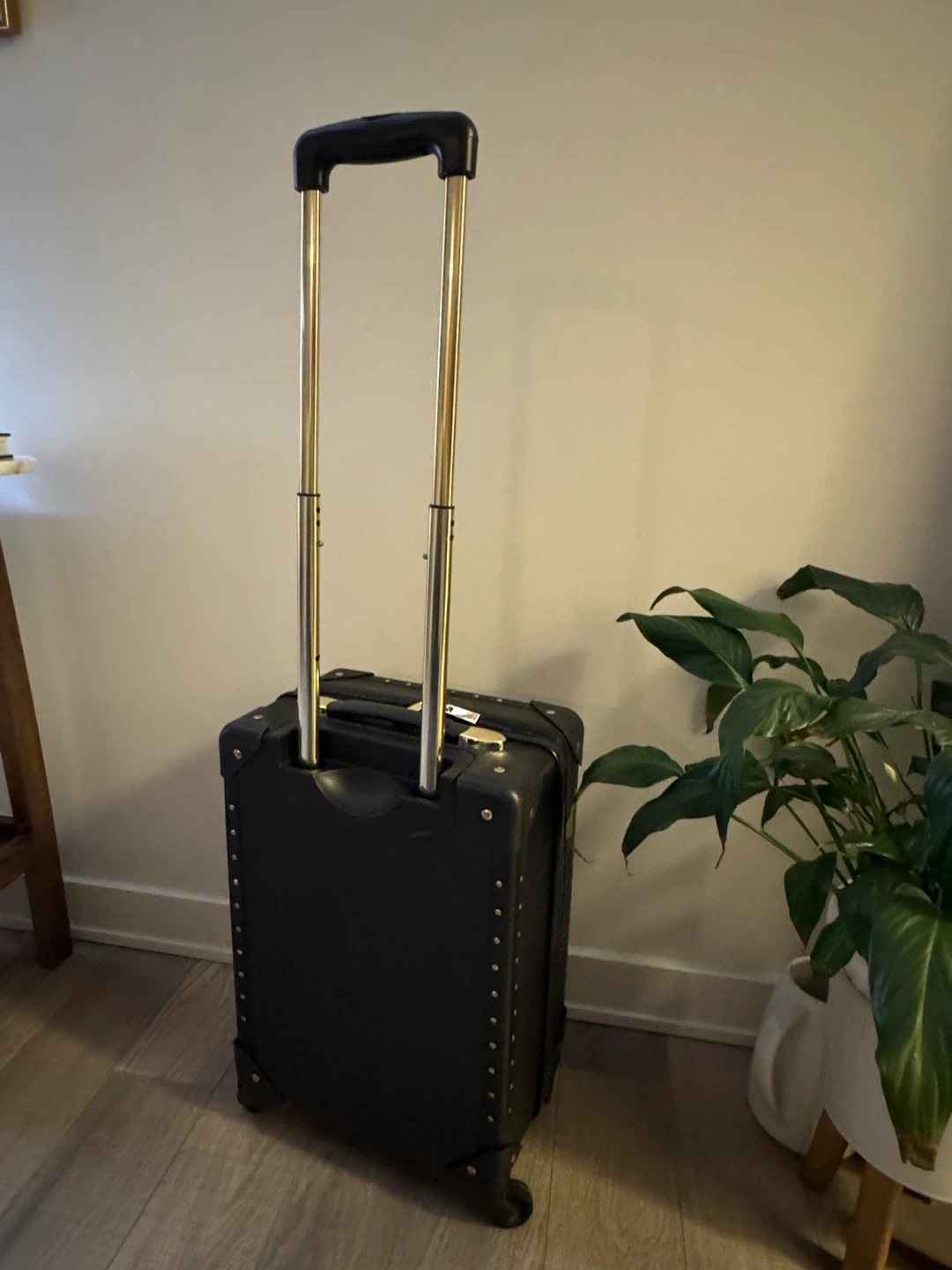 Telescoping handle and spinner wheels for easy manoeuvrability.