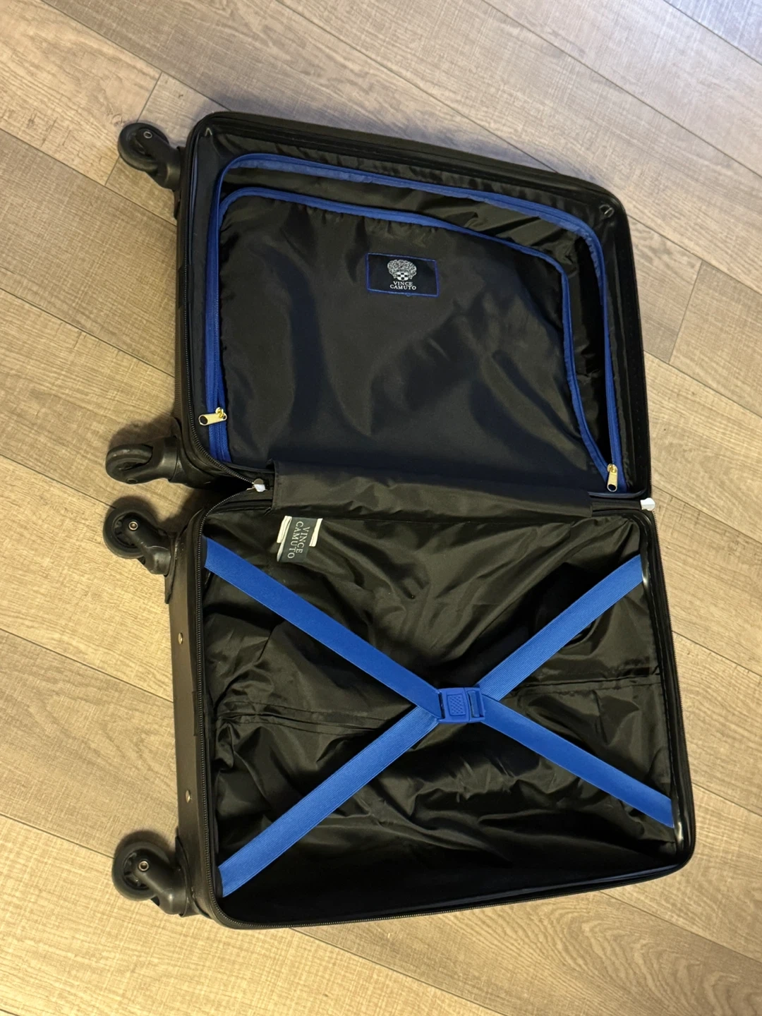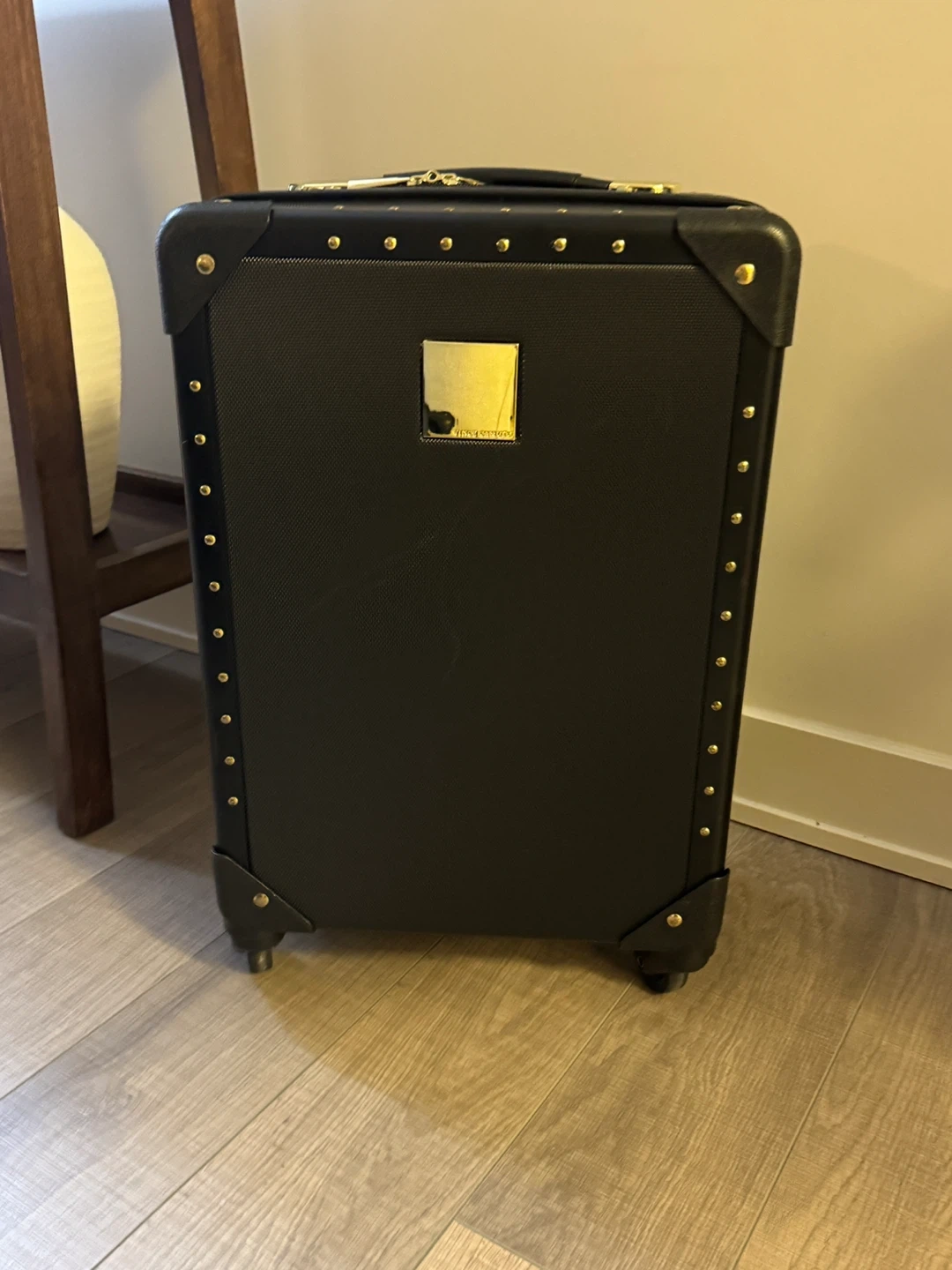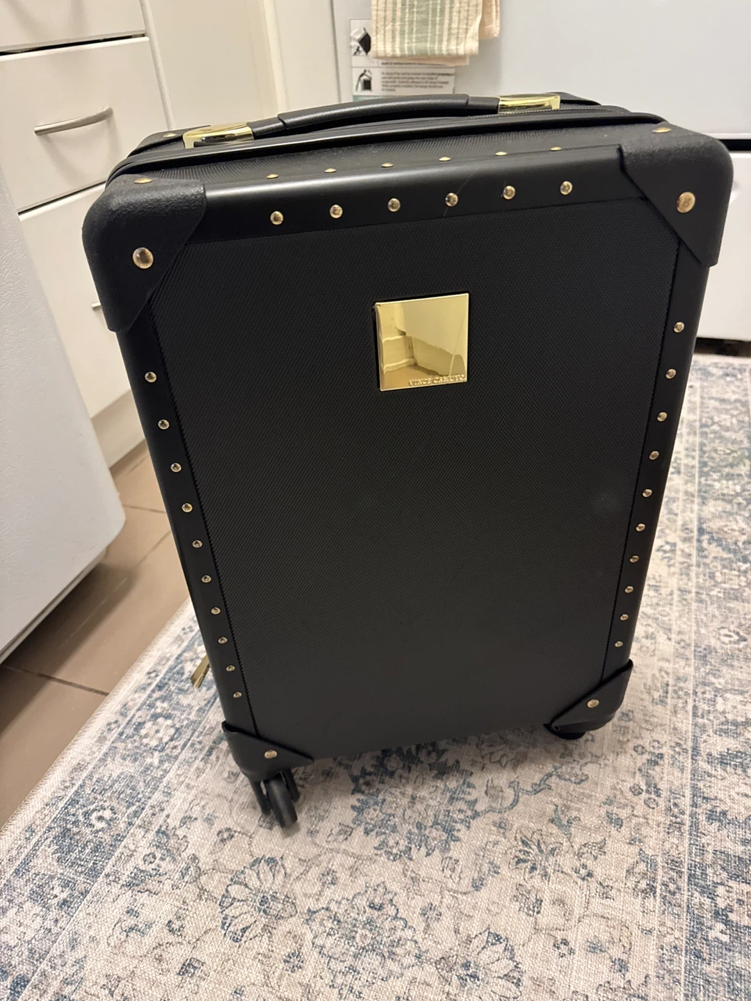 Features a durable exterior with gold-tone hardware and TSA-approved locks. Interior includes cross straps and zippered compartments for organized packing.