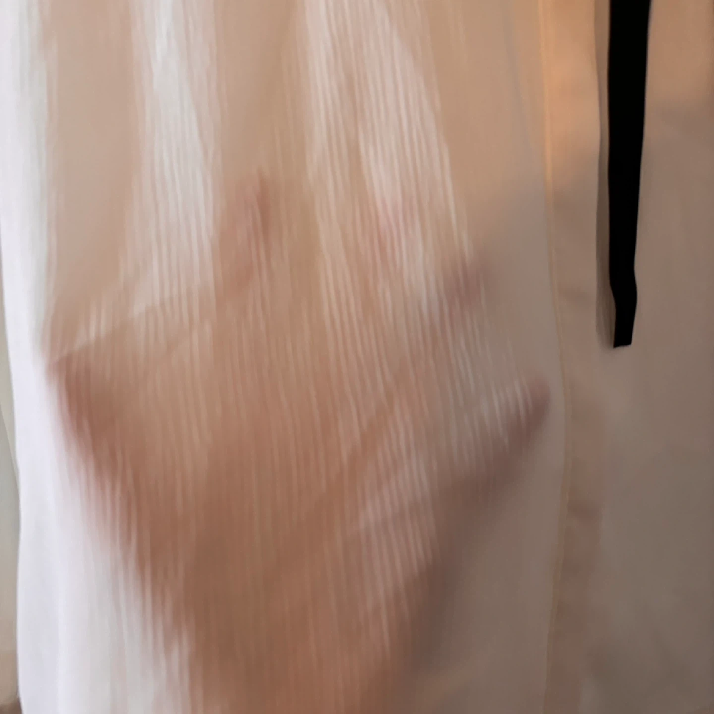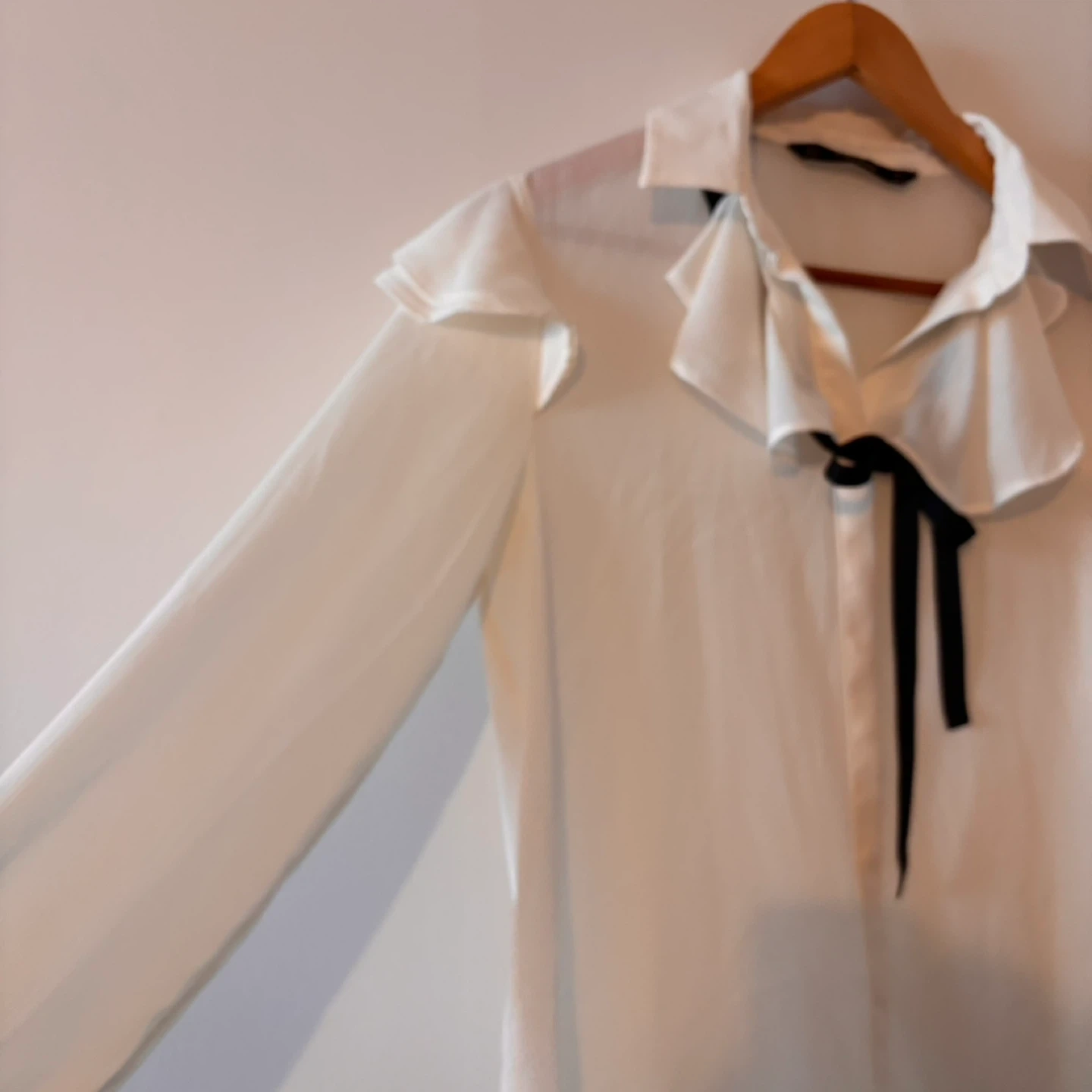Sheer white long-sleeved blouse from Zara Basic. It has a ruffled collar and a black ribbon tie. Material is lightweight and flowy. Size M.