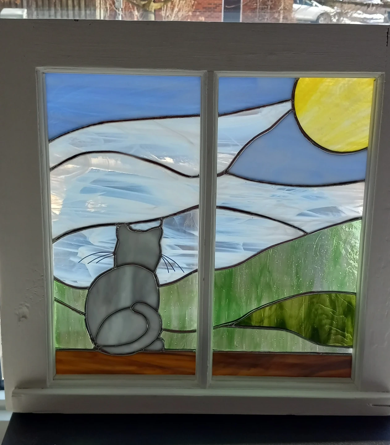 Hand designed and crafted stained glass window. Vintage white refinished wooden frame with rings for hanging. New handcrafted panels copper foiled and soldered glass held in with points and window glazing. Different t textures and colour's of glass, beautiful in sunlight. Frame size 17 H by 18 W inches.