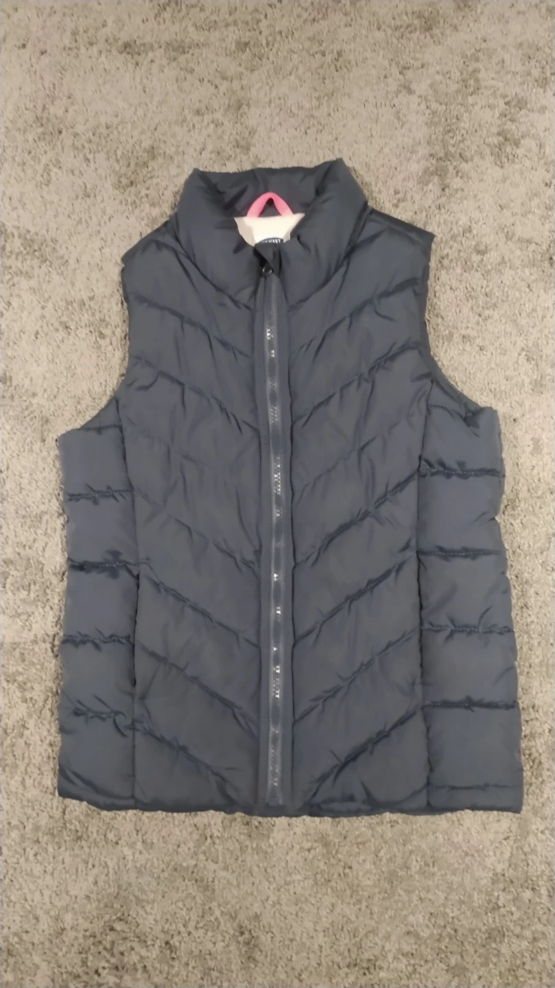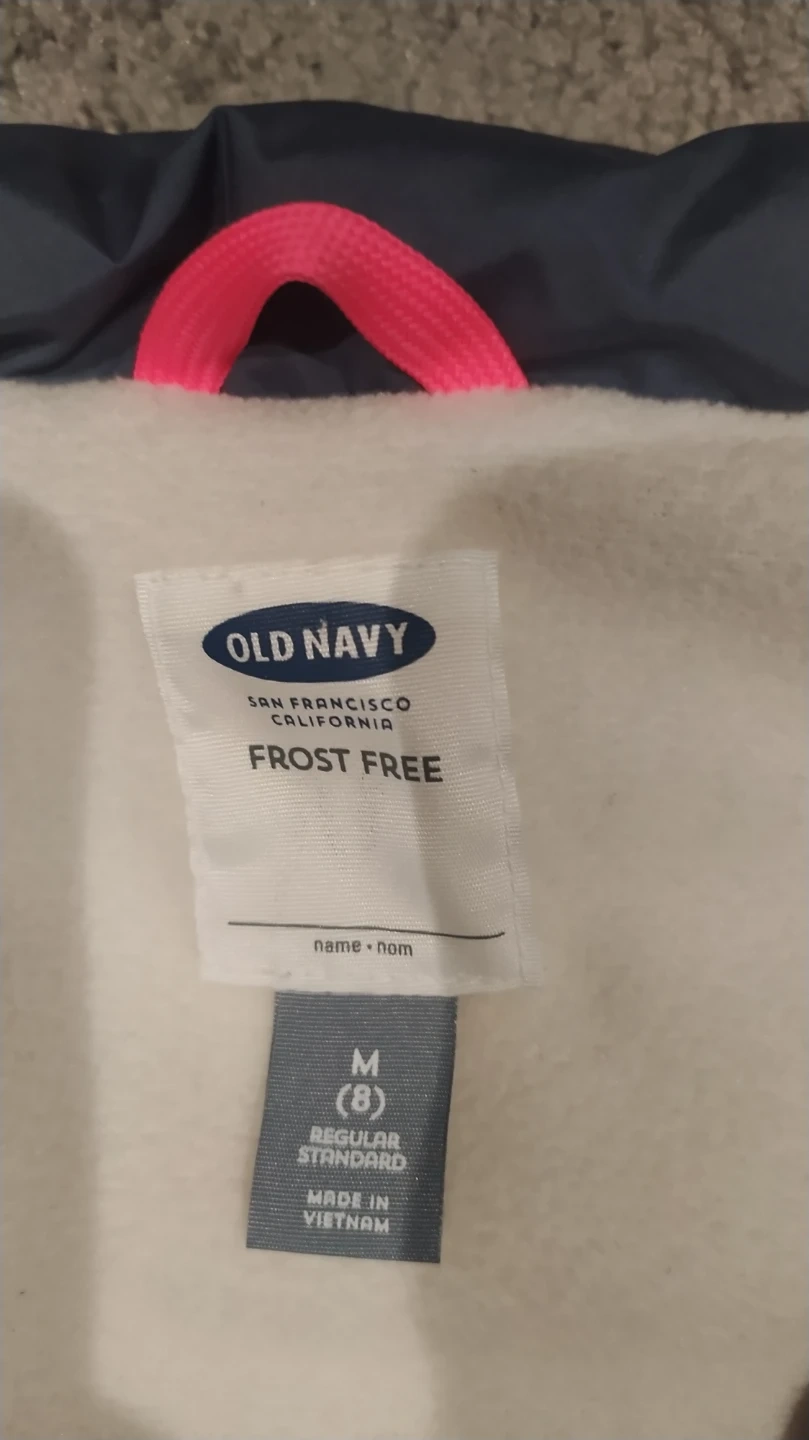 This is an Old Navy Frost Free puffer vest. It's a girls' size medium, which is equivalent to a size 8. The vest is grey with a pink loop inside for hanging.