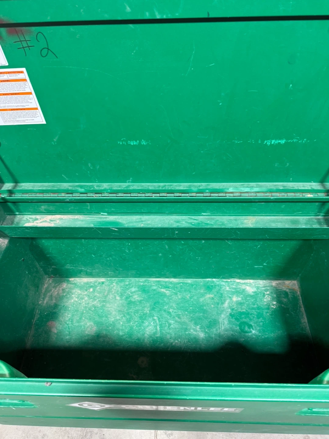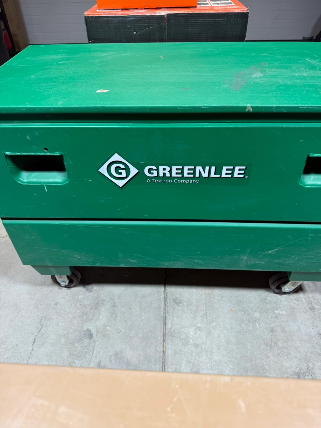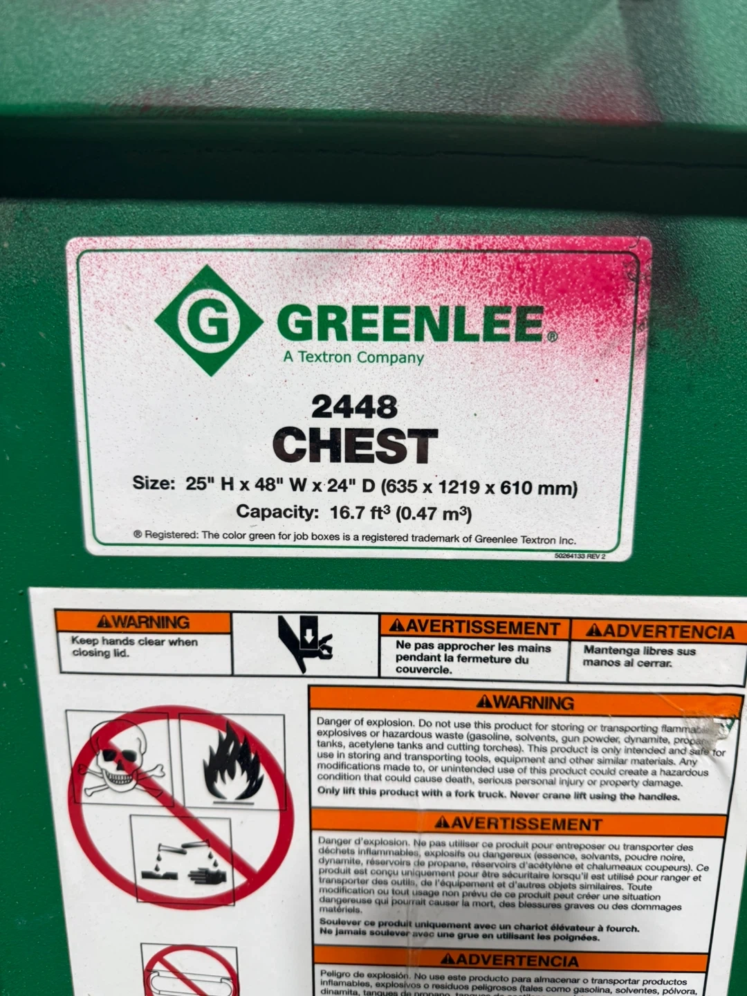 This is a Greenlee 2448 chest. It measures 25" H x 48" W x 24" D and has a capacity of 16.7 ft³ (0.47 m³). This chest is green and made of plastic. It has wheels for easy transport. $850 OBO