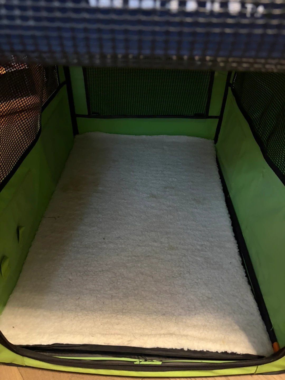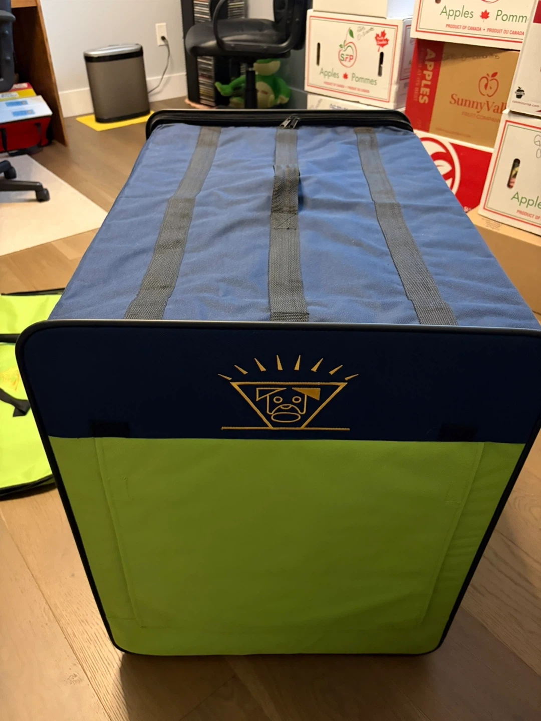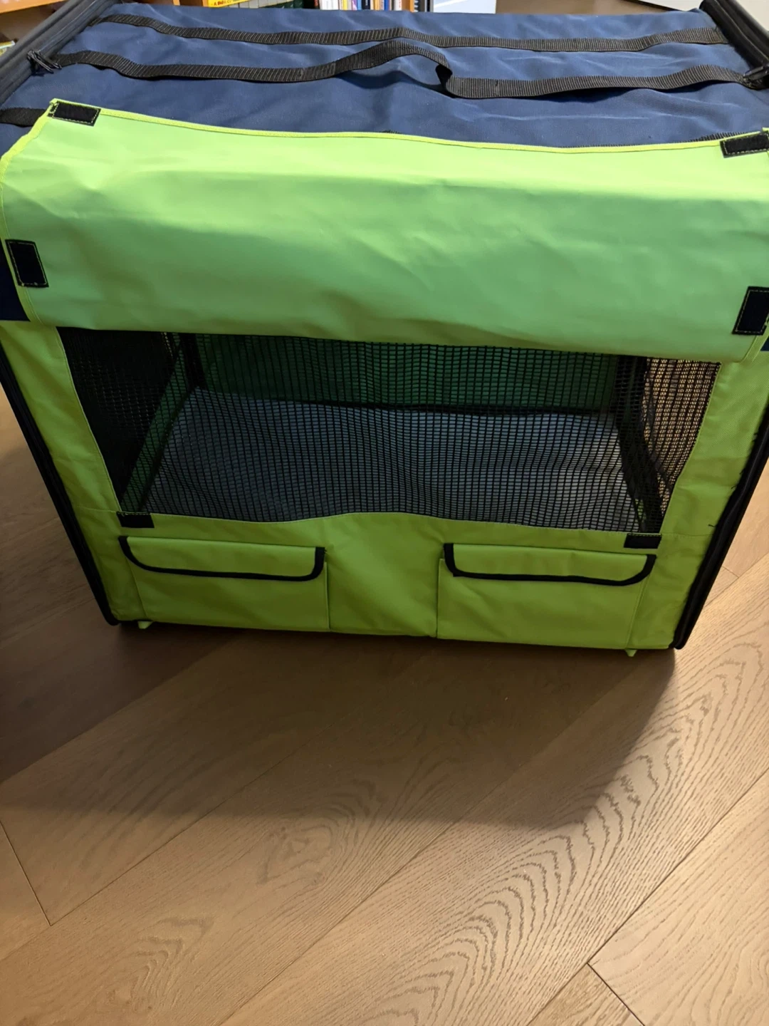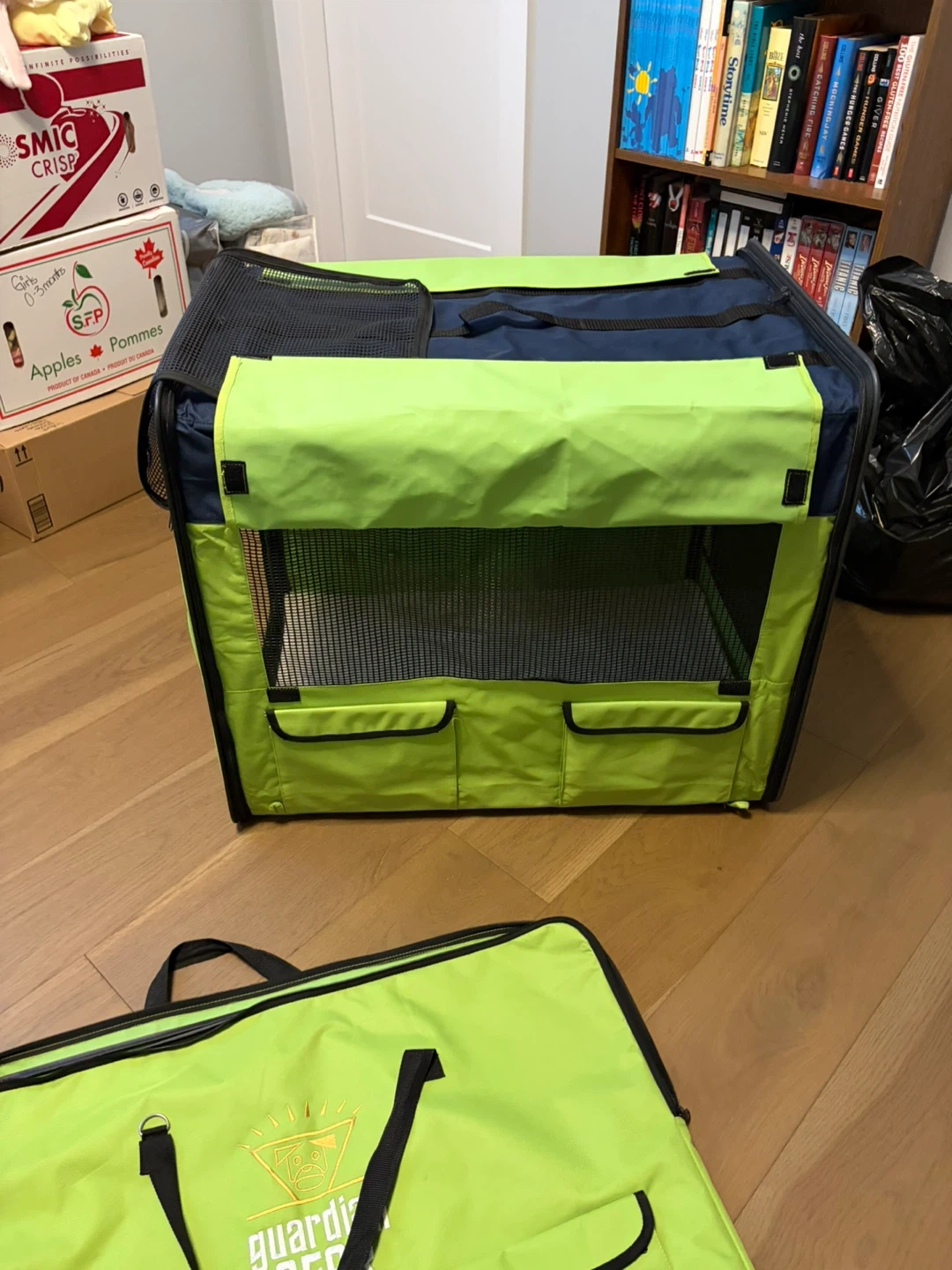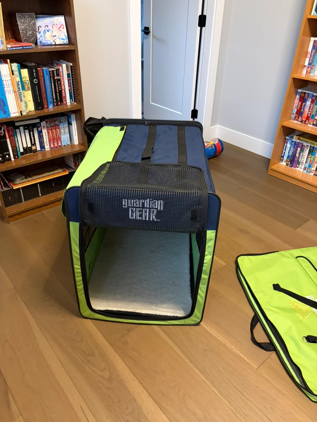 This is a blue and green Guardian Gear soft-sided pet carrier. It's made of durable fabric with mesh ventilation panels. It also includes a foldable mat that zips into a separate carrying case. Great if for transporting pets safely!