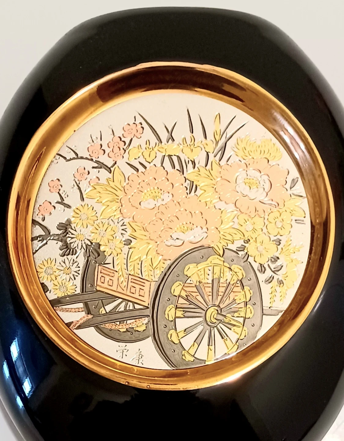 The central design features a traditional floral cart (or wagon) overflowing with flowers, created using the ancient art of Chokin. This technique involves engraving copper and then gilding it with gold and silver