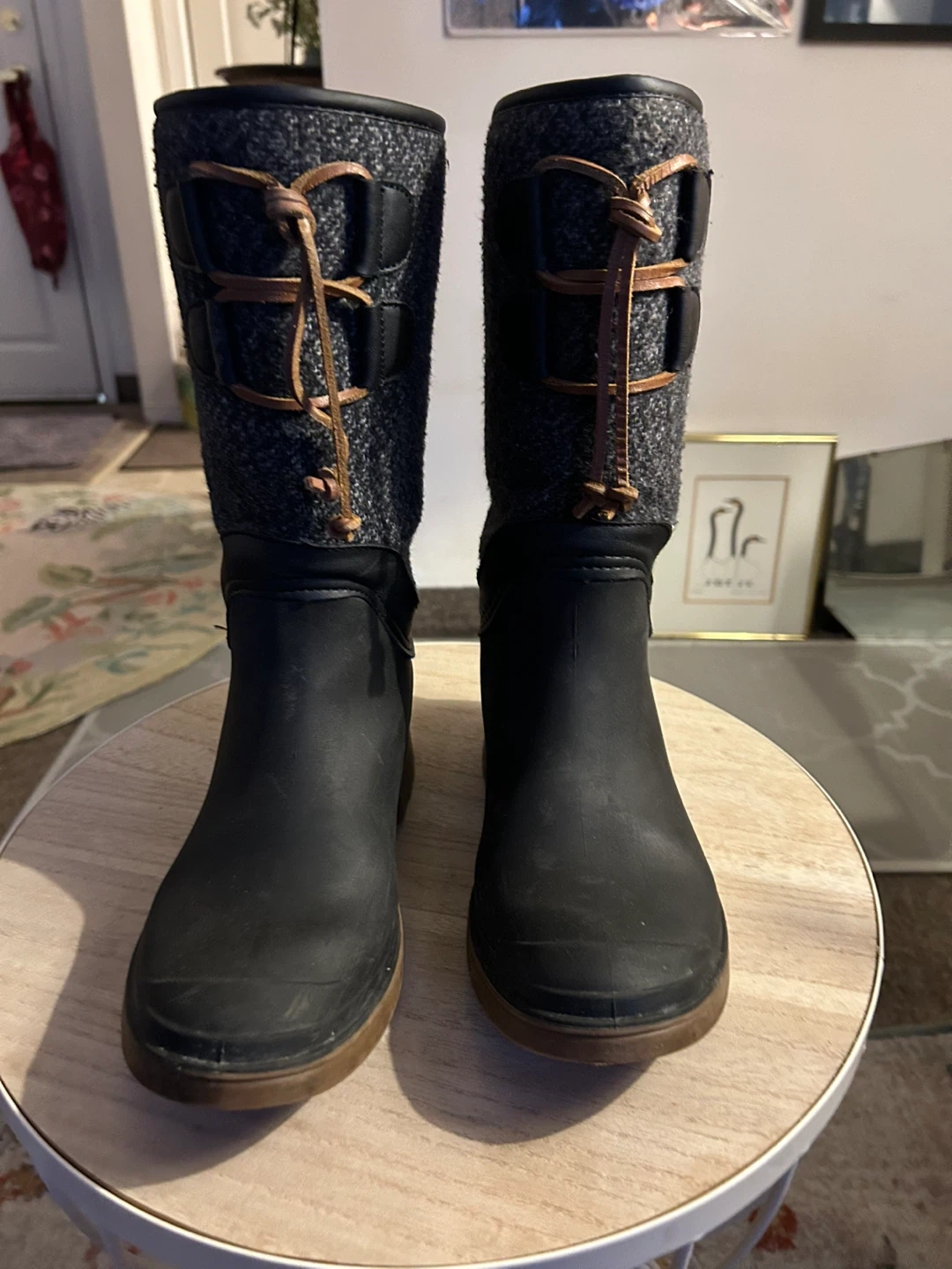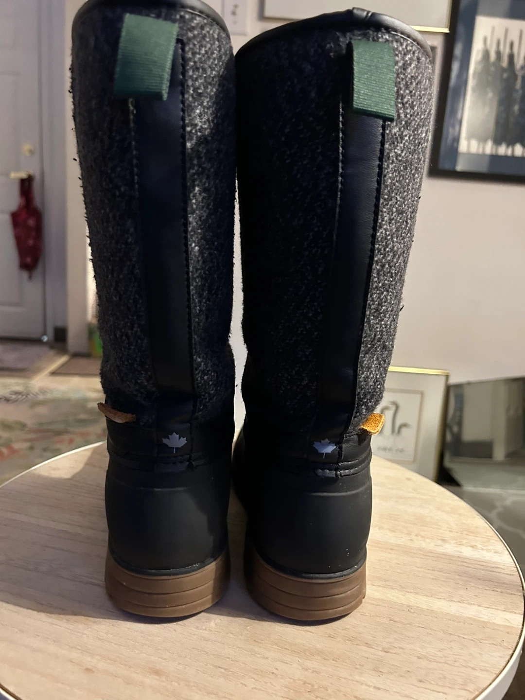 These Kamik boots are designed for warmth and comfort. They feature a durable rubber lower with a cozy knit shaft and faux leather accents. The treaded sole provides good traction. Great for keeping your feet warm on chilly days!