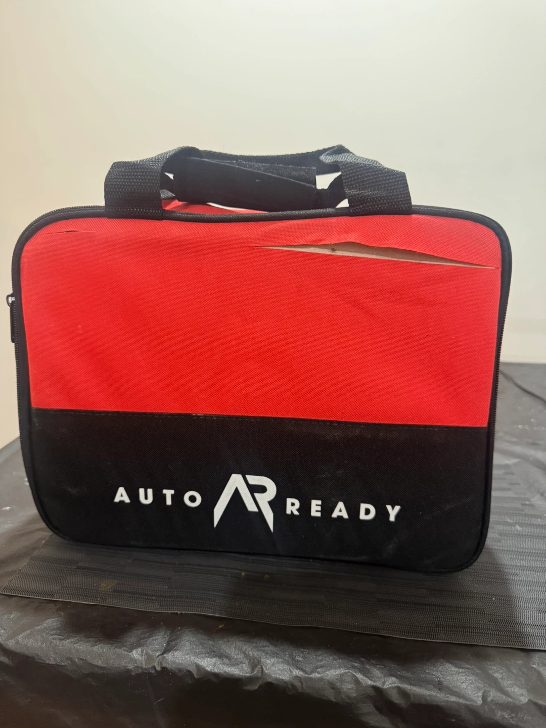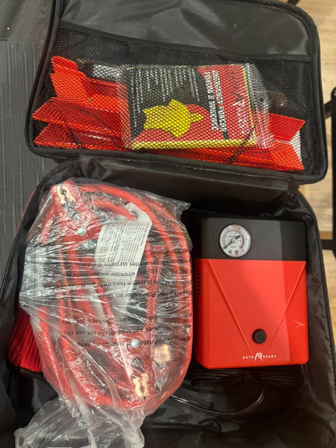 Selling an Auto Ready car emergency kit. It includes jumper cables, an air compressor, and a reflective safety triangle. Great to keep in your car for emergencies!