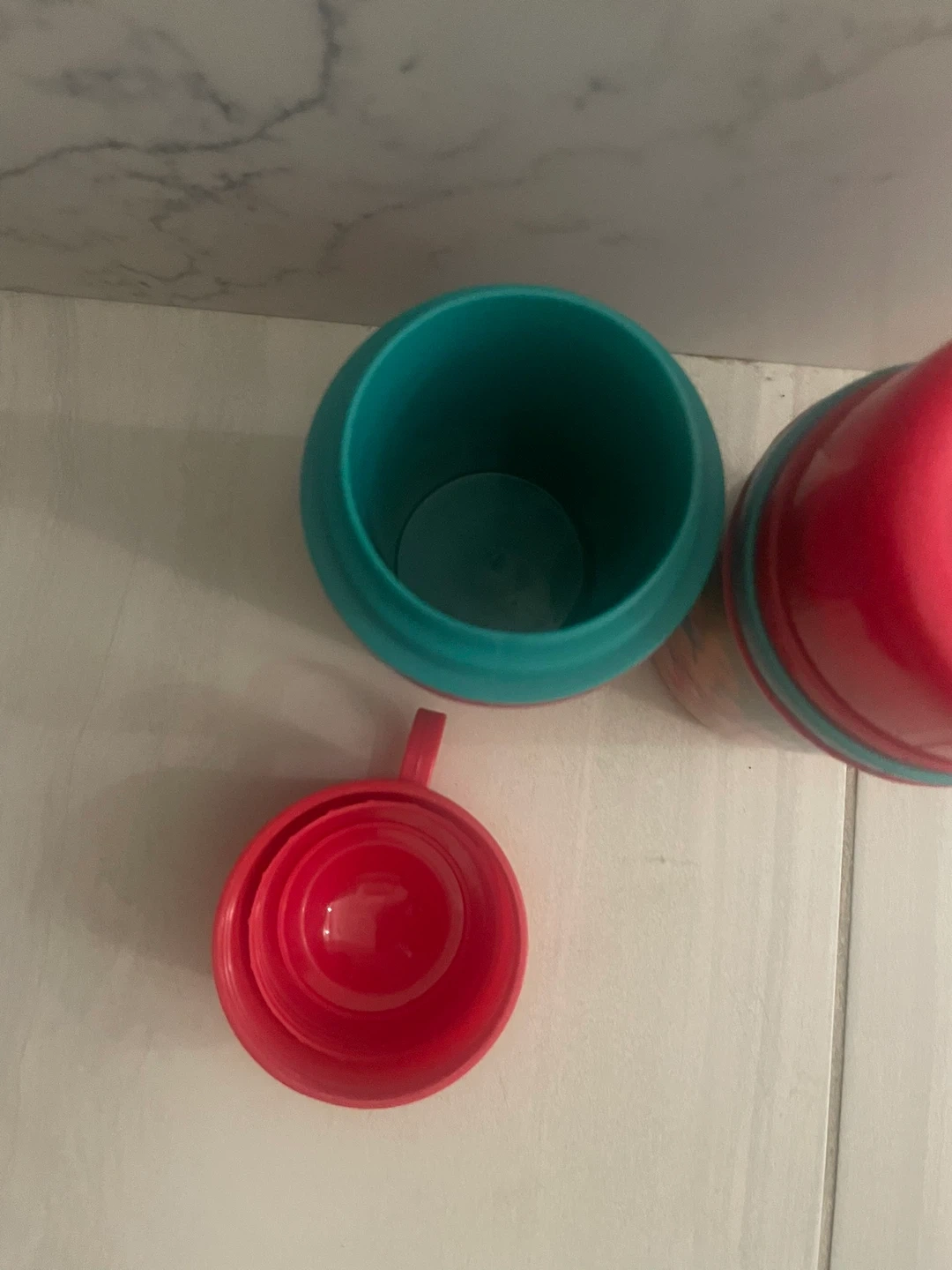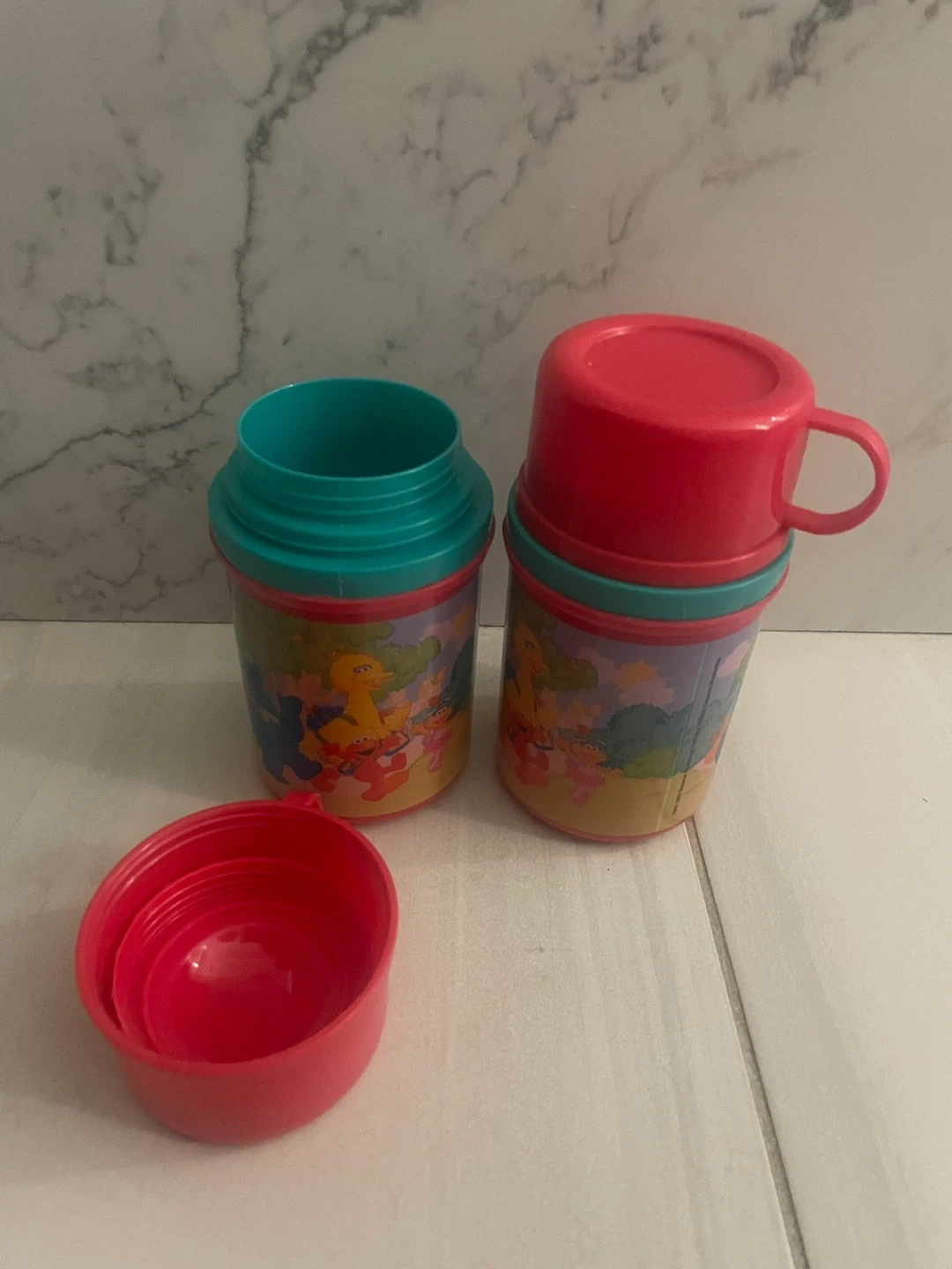 These are two fun plastic cups or small containers featuring Sesame Street characters. Each has a teal and pink design with characters printed on the sides. One lid and one separate smaller cup are also included.