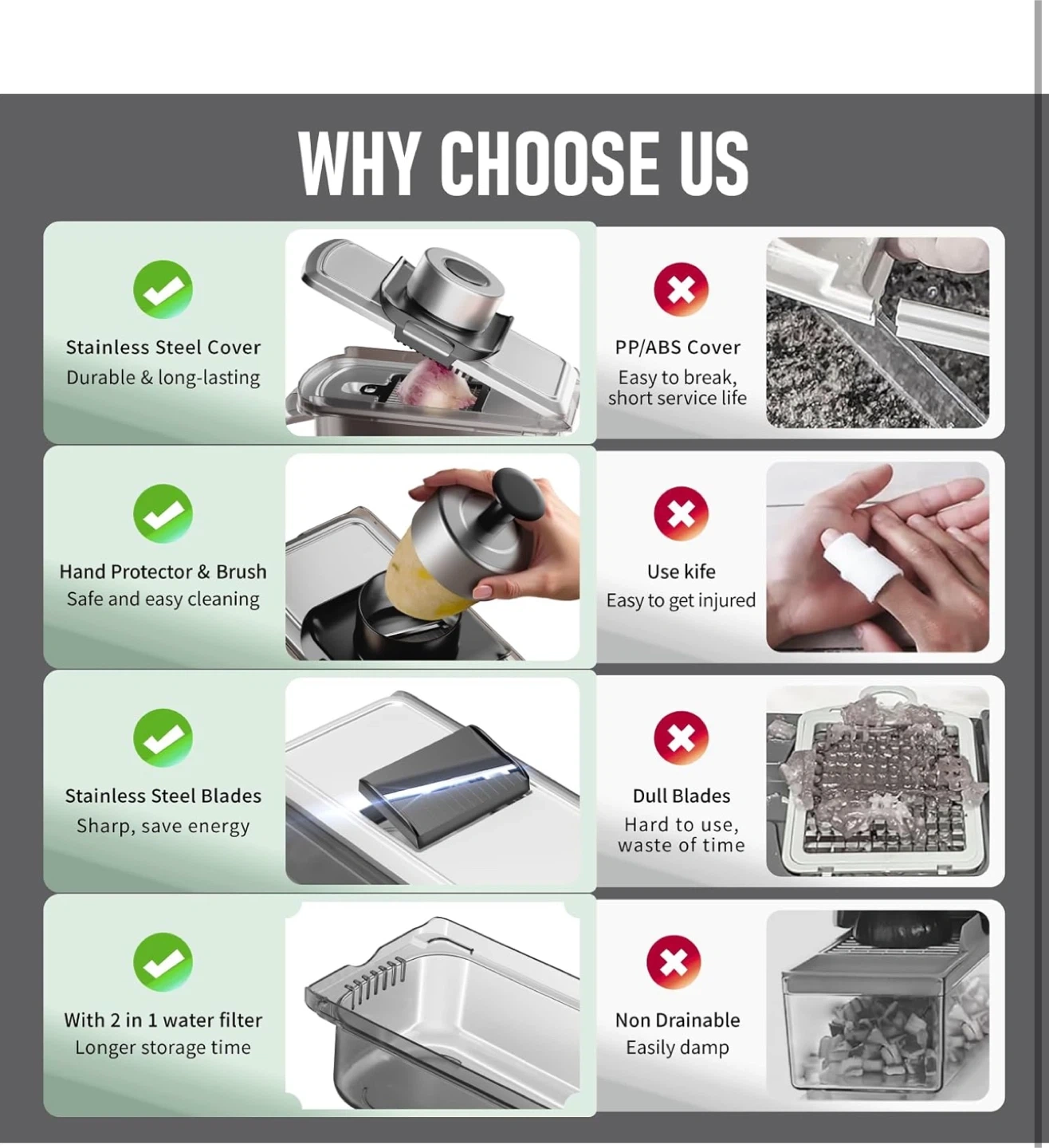 This 9 in 1 stainless steel vegetable chopper is designed to last and makes food prep a breeze! It's BPA free and features premium quality 304 stainless steel. It comes with various chopper blades, including medium dicer (6x6) and small dicer (12x12), as well as a mandoline slicer. The mandoline slicer has extremely sharp blades, so please take care when using and cleaning them! There are also grater blades, including fine julienne (3mm) and a grater