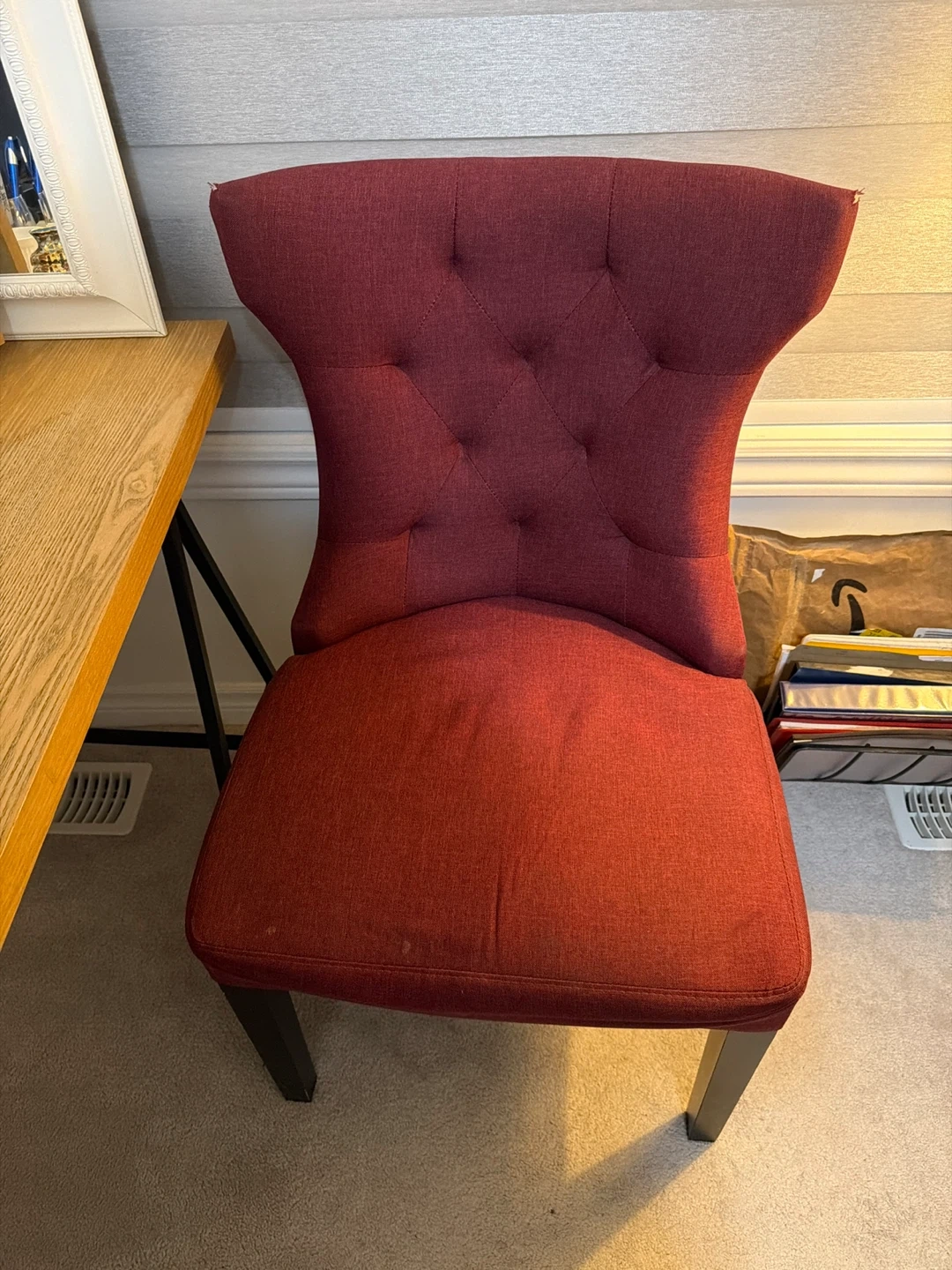 This upholstered chair features a rich red fabric with diamond tufting on the back. Its dark wooden legs provide sturdy support. Some minor marks are visible on the seat cushion.