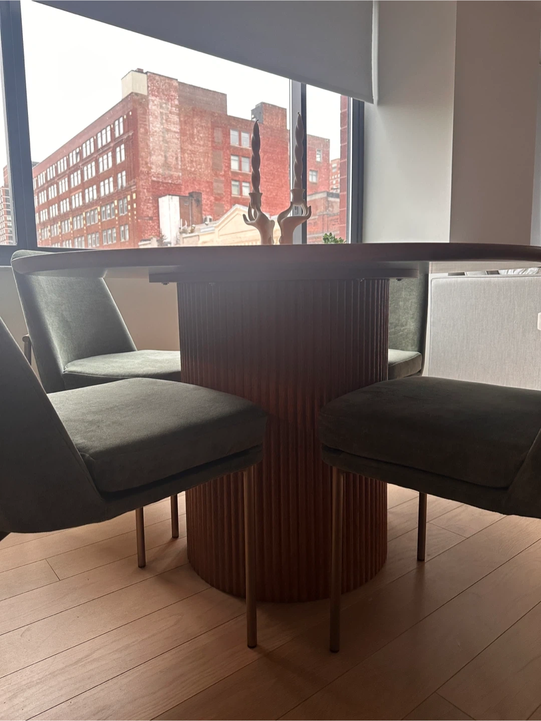Circular dining table with dining chairs feature plush velvet upholstery in a muted green hue. Their slim, gold-toned metal legs add a touch of modern elegance. The seat and back are softly cushioned for comfort.