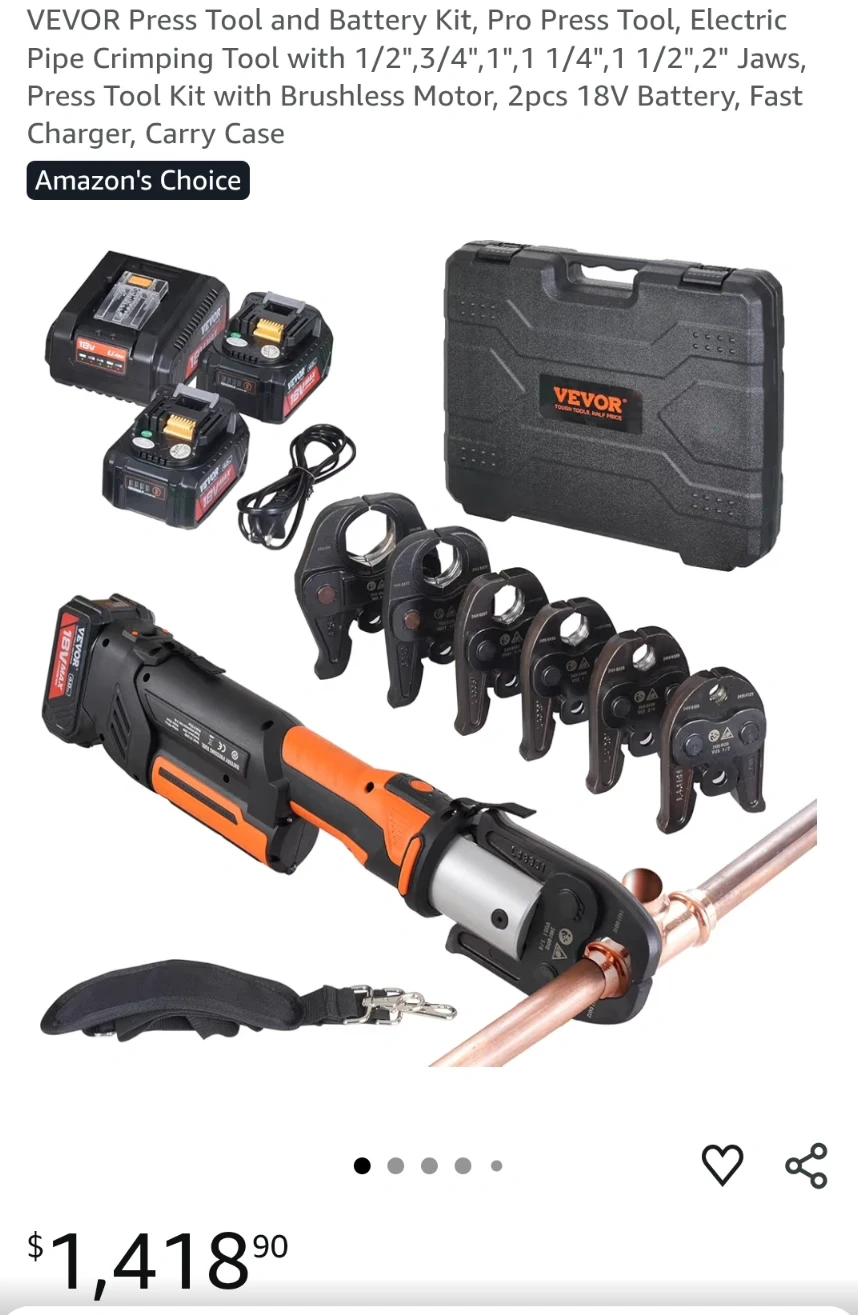 VEVOR electric pipe crimping tool kit. Includes a brushless motor press tool, two 18V batteries, a fast charger, and a carry case. Comes with 1/2", 3/4", 1", 1 1/4", 1 1/2", and 2" jaws.