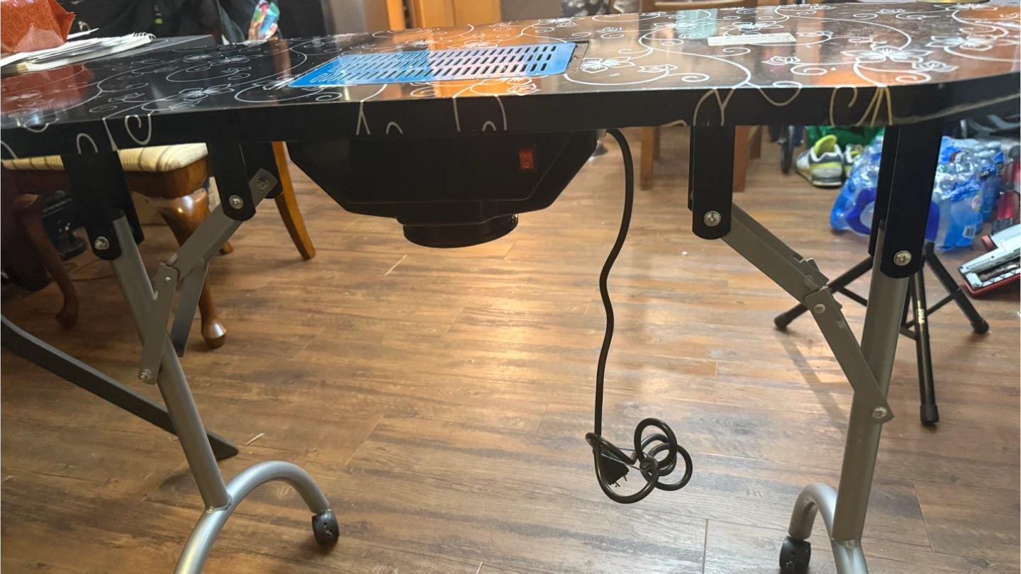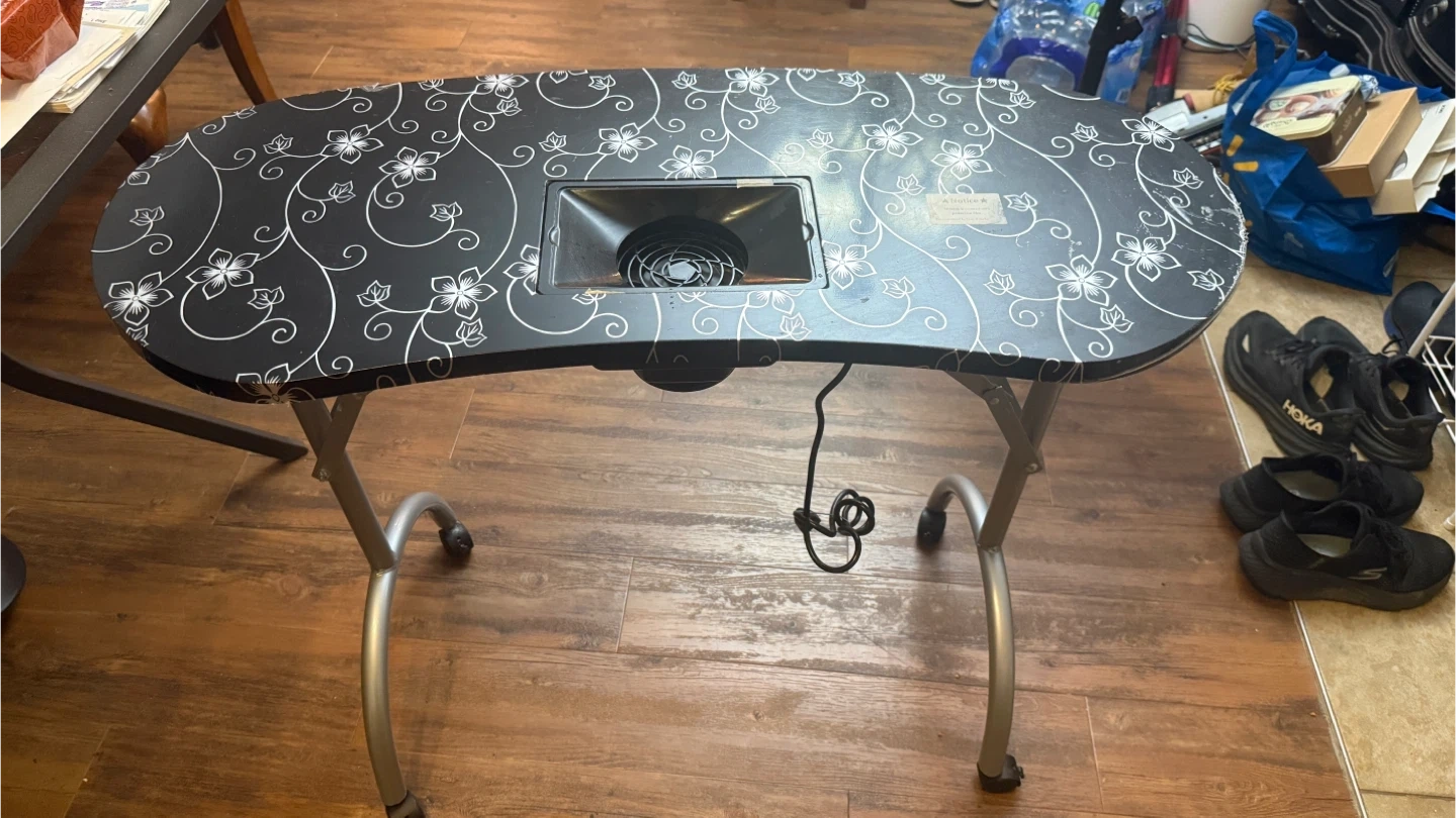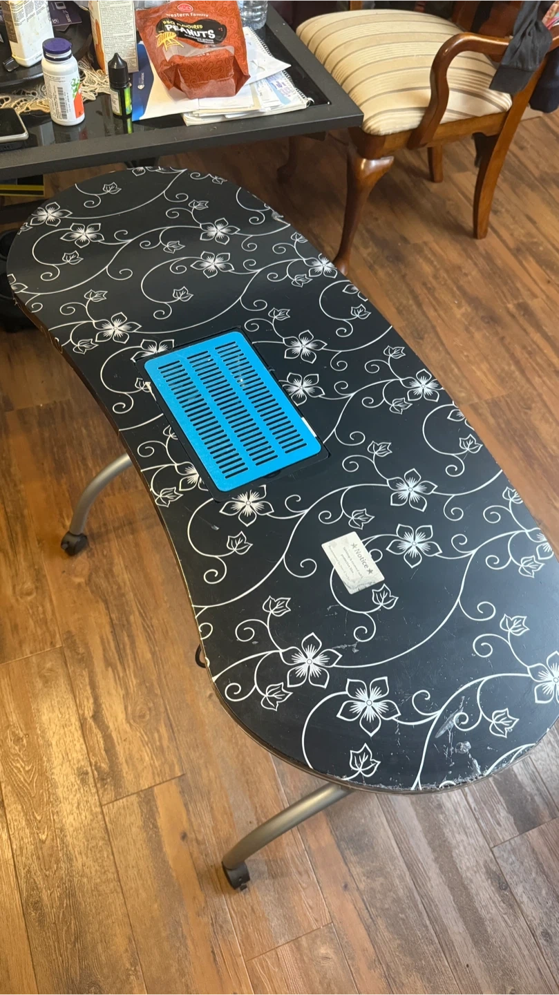This portable nail table features a built-in fan to collect dust. It has a decorative floral pattern on the tabletop. The legs fold for easy storage. Includes a blue dust collector grate.plus it’s bag
