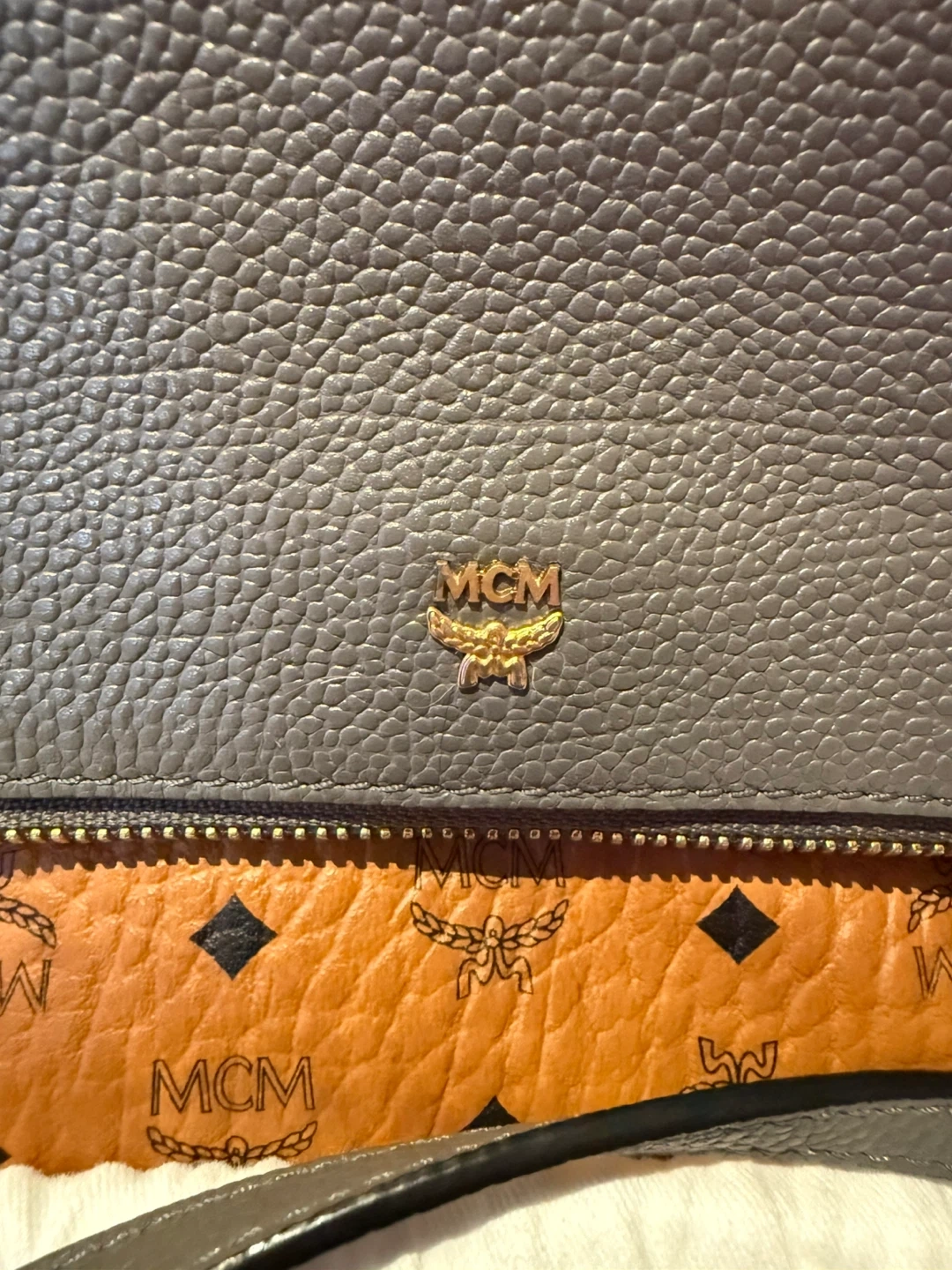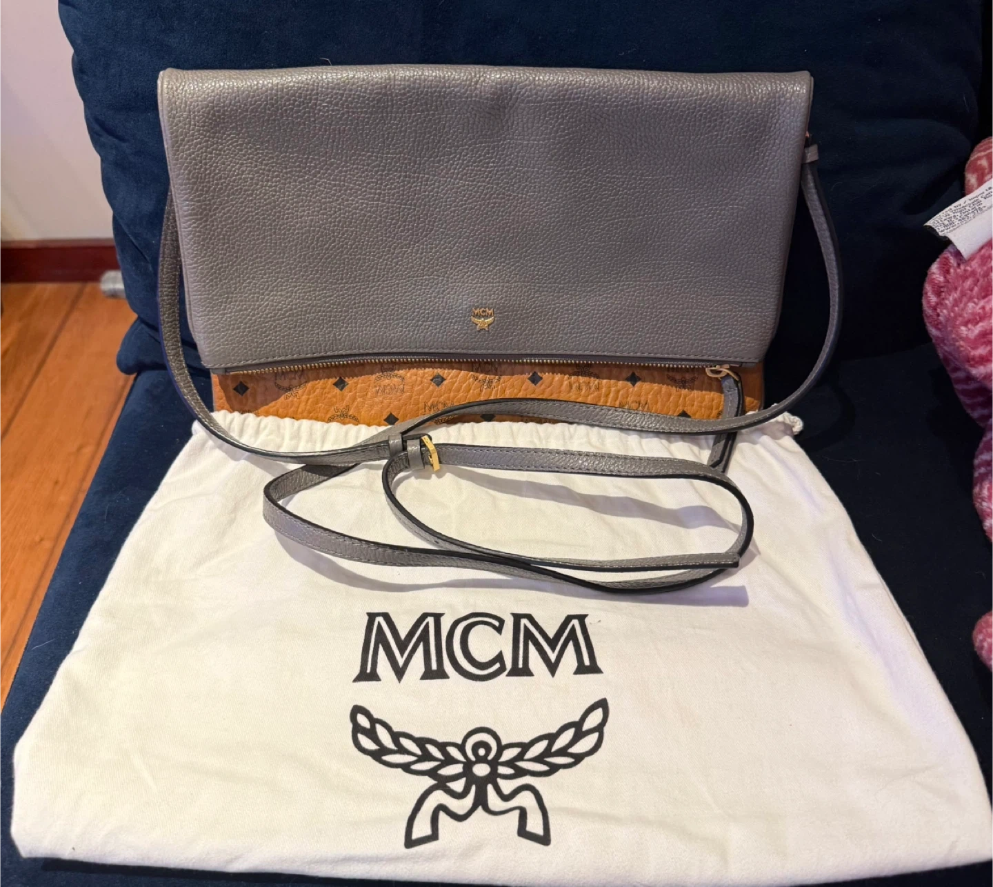This MCM bag is a stylish clutch or shoulder bag. It features the signature Visetos print in cognac and has a grey leather flap. Includes dust bag.