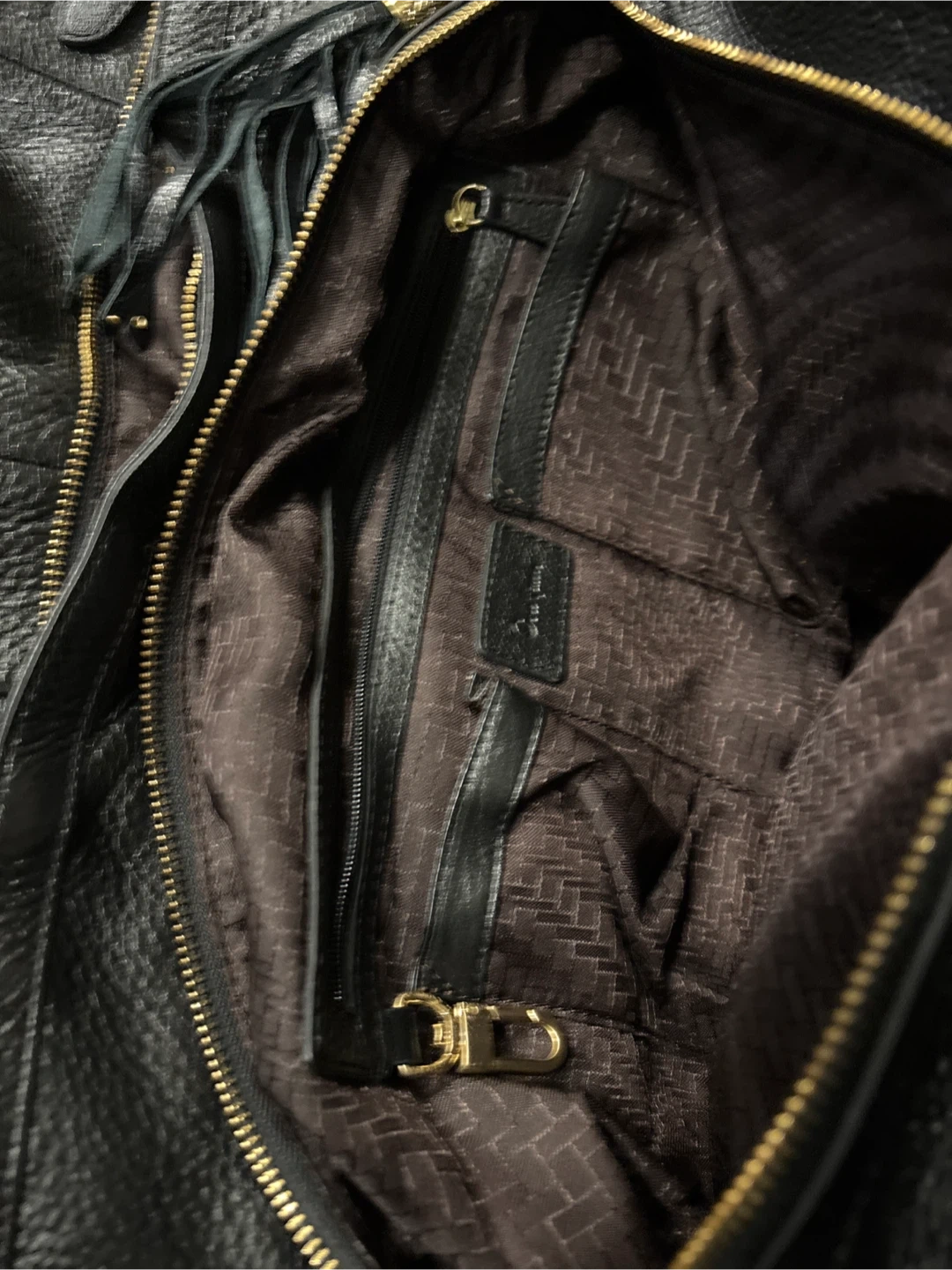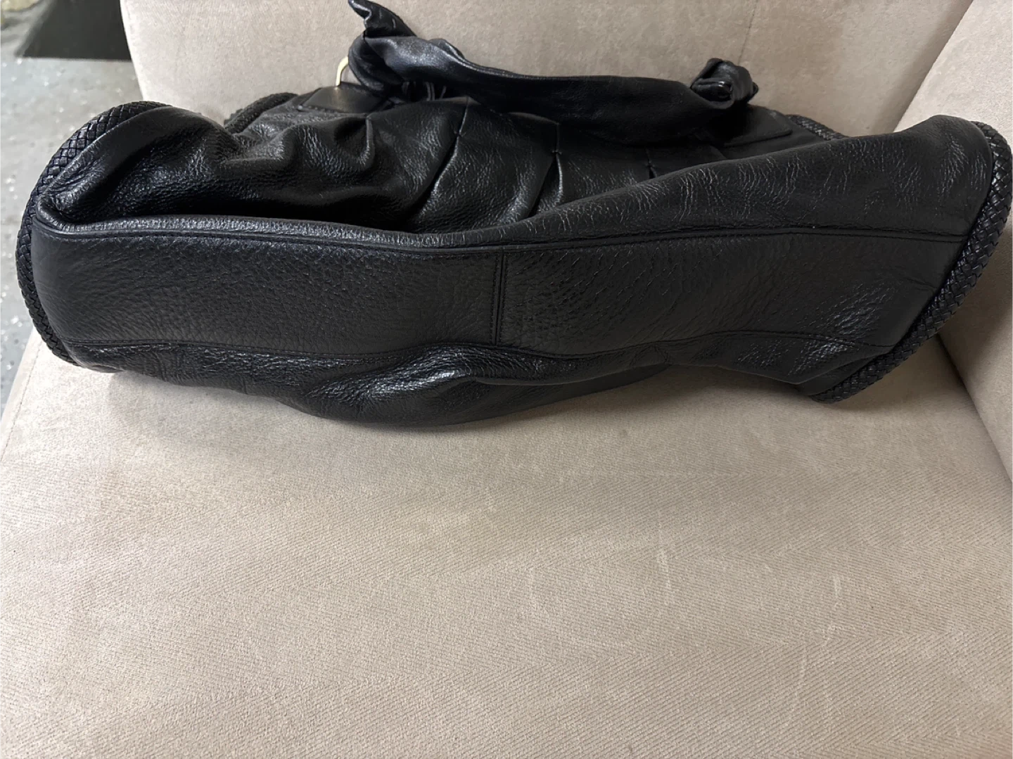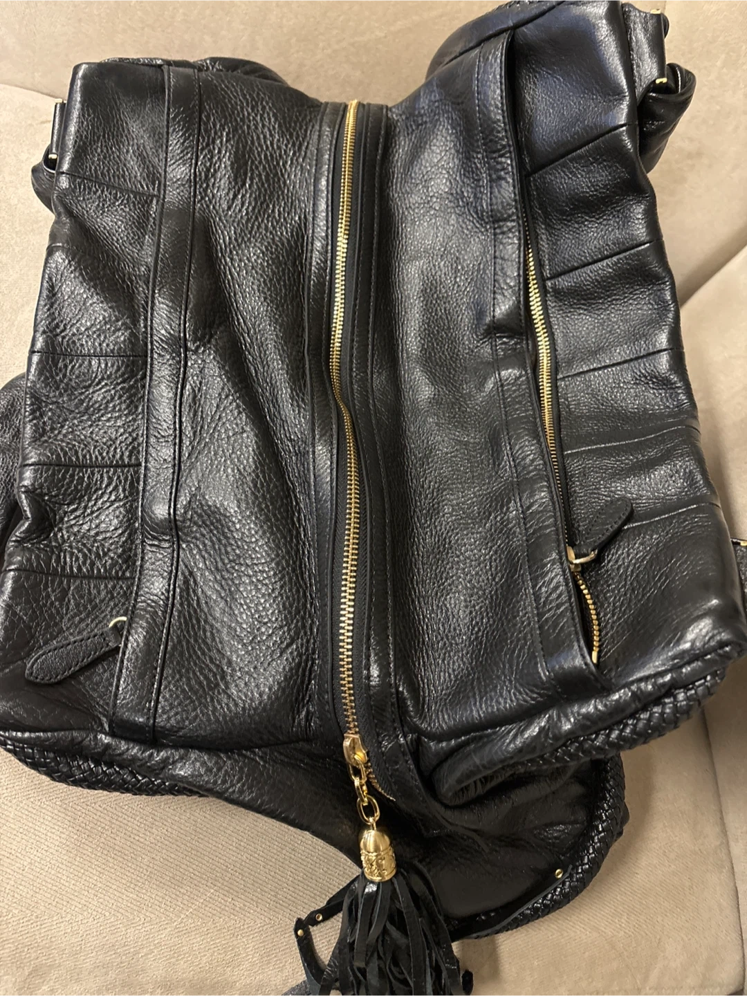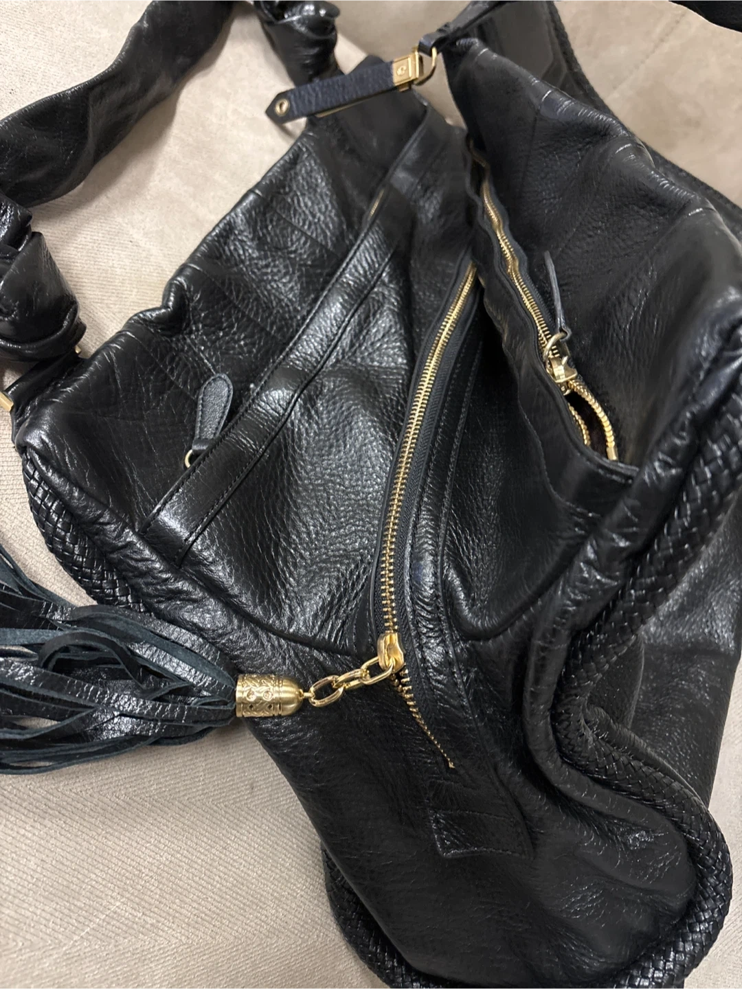 This black leather hobo handbag is from Cole Haan. It features a textured leather body with braided accents on the sides and a decorative tassel detail. The bag has 2 shoulder strap and a zip-top closure.