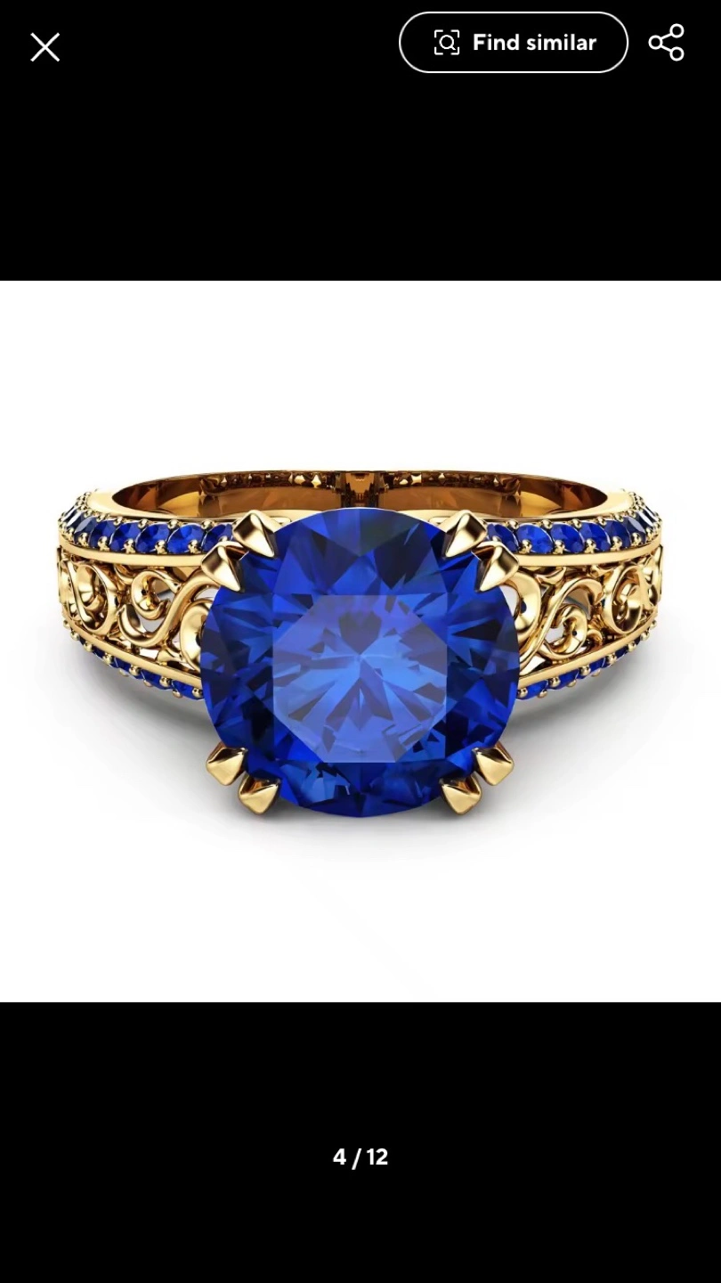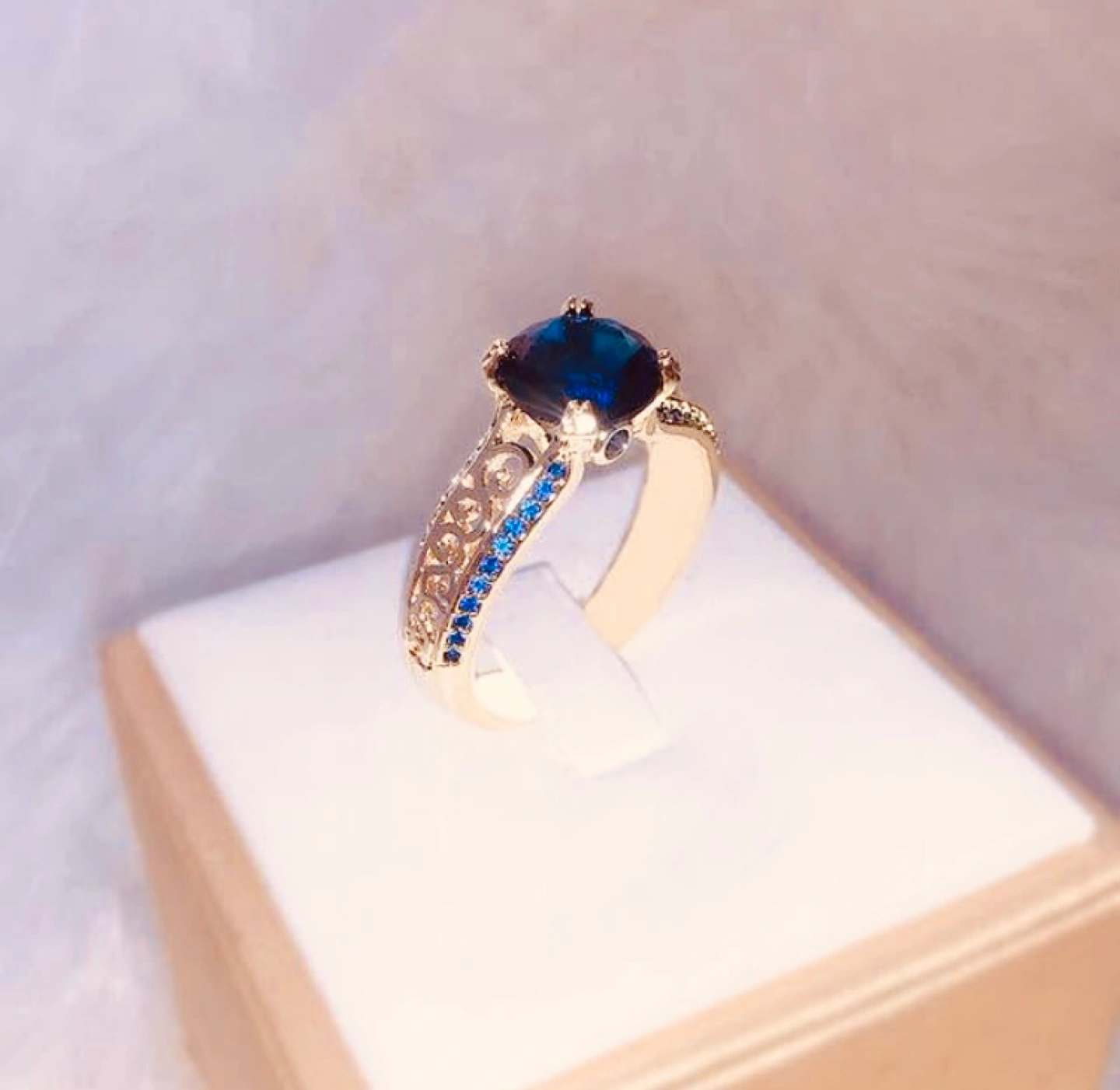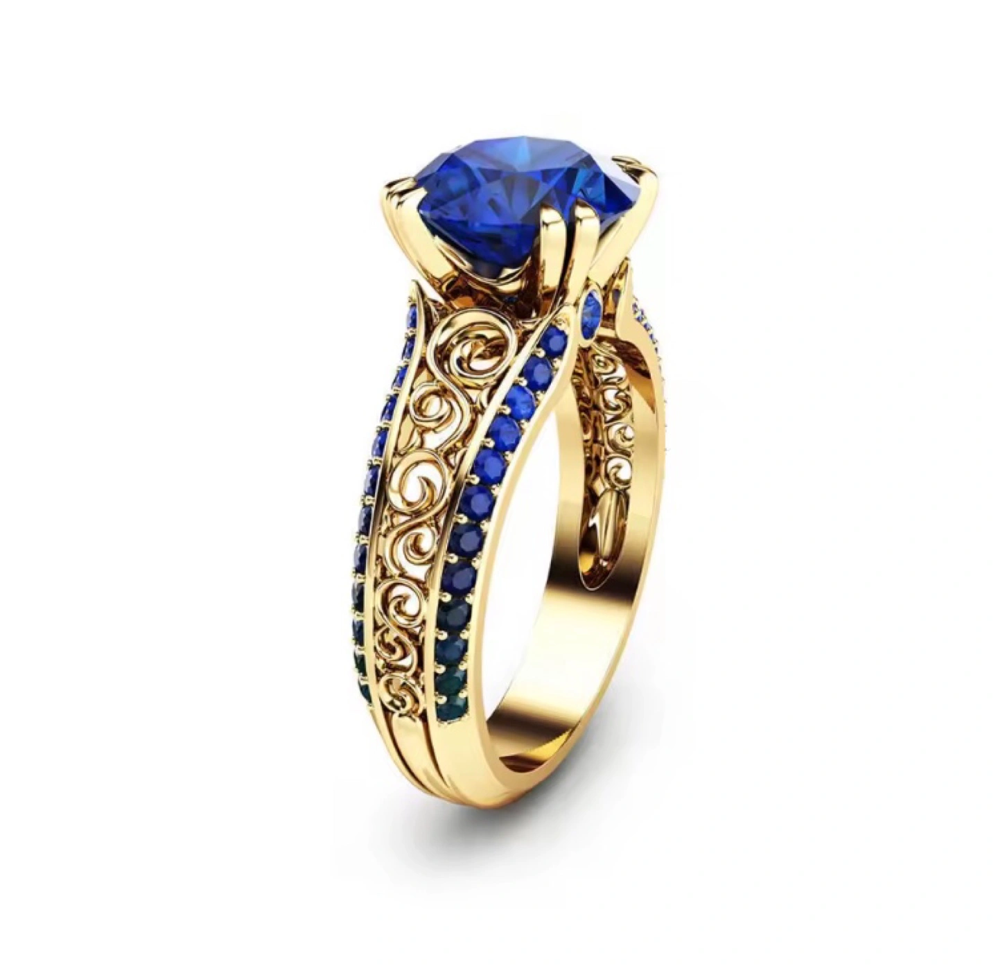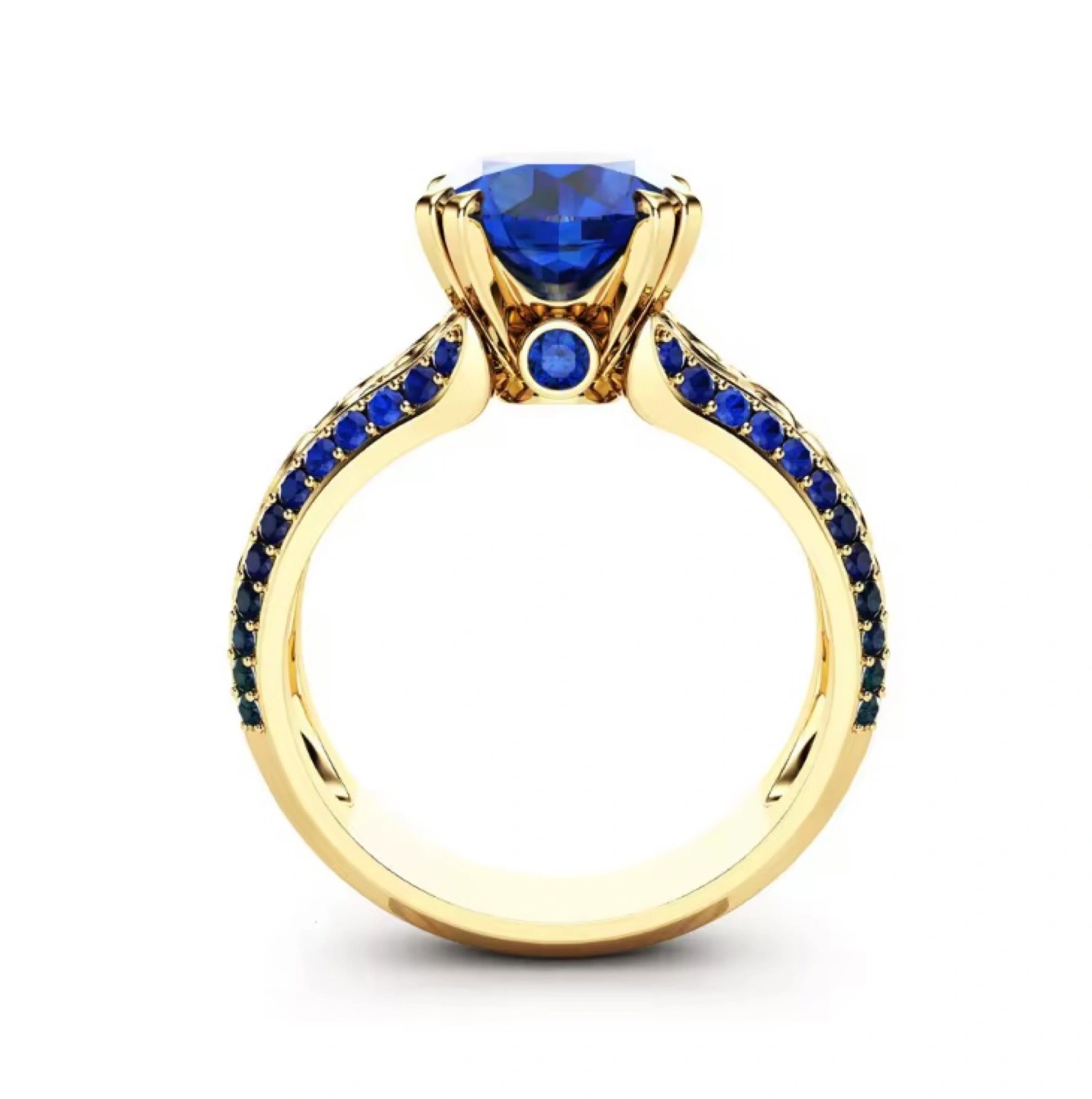-14k Gold colour ring with a large blue sapphire and smaller blue sapphires on the band.