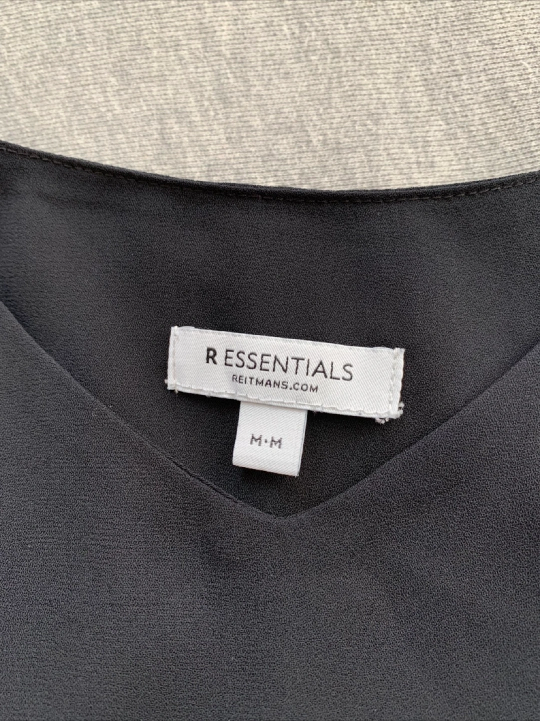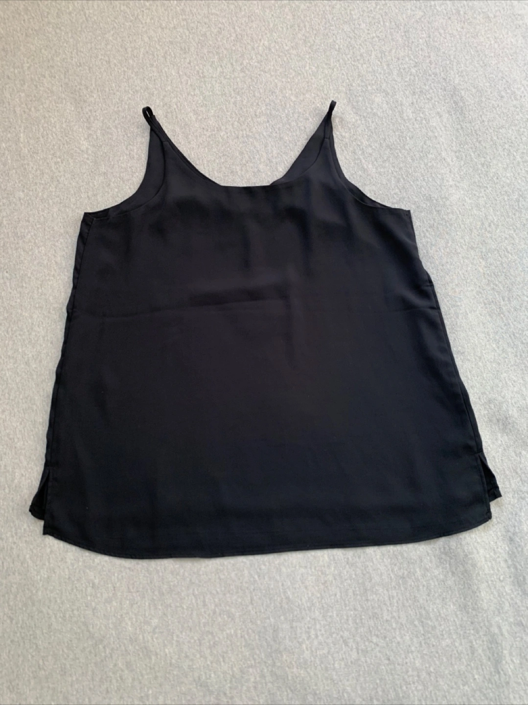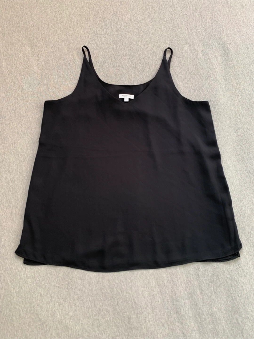 A 2 layered black tank top with v neck and thin straps. Great quality fabric, versatile piece that can be paired with many outfits, layered for the office or for a casual event.