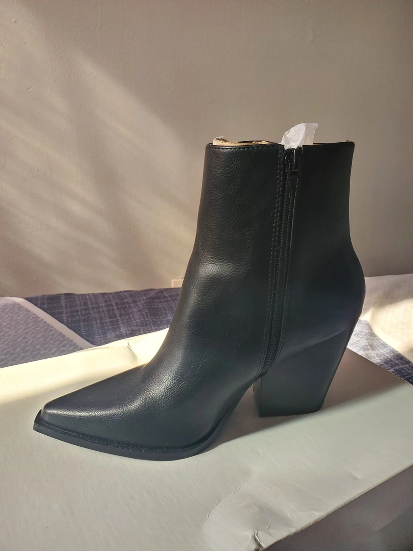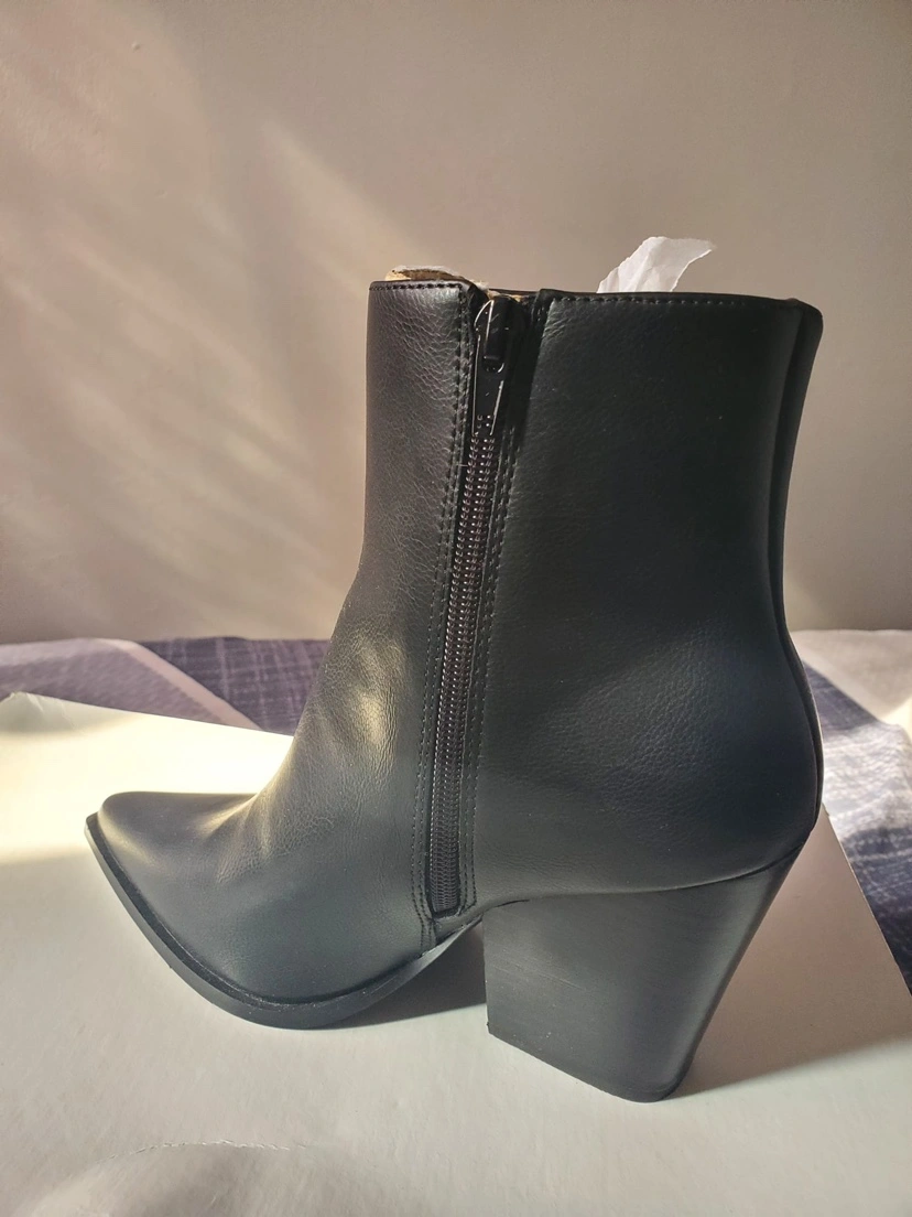 Black ankle boots with a pointed toe and block heel. They have a zipper closure on the inside of the ankle. The size is 6.5. They come with the original box.