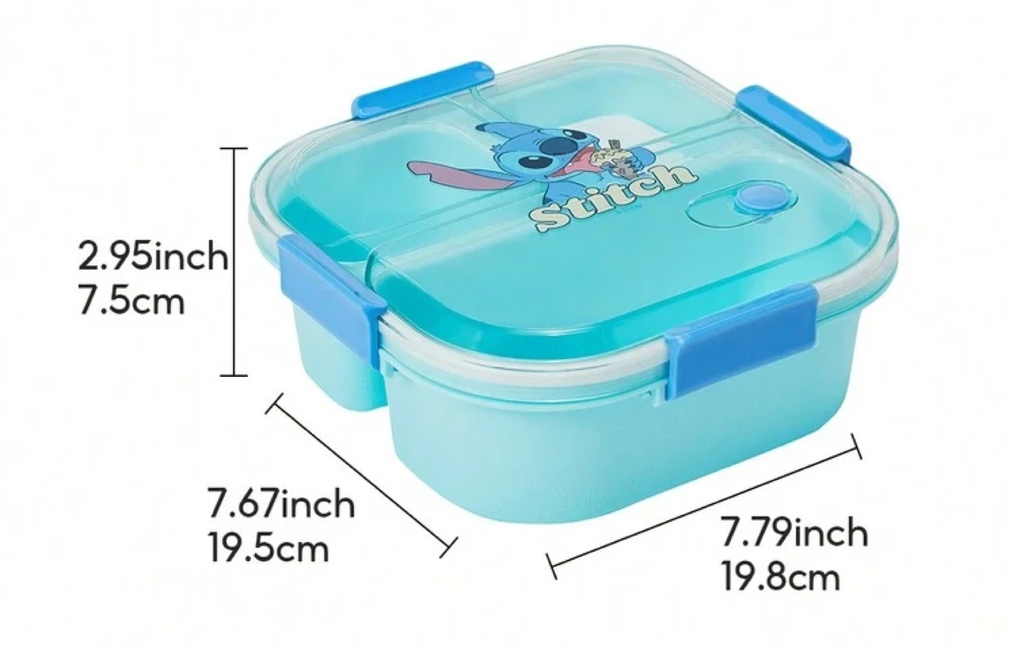 This is a pink Disney Stitch Collection bento box featuring Angel. It's made of PP material and includes a lid, sealing plug, locking clasps, a fork and a small sauce cup. It's suitable for temperatures from -20°C to 120°C and is BPA-free. It's perfect for packing lunches for kids or adults!