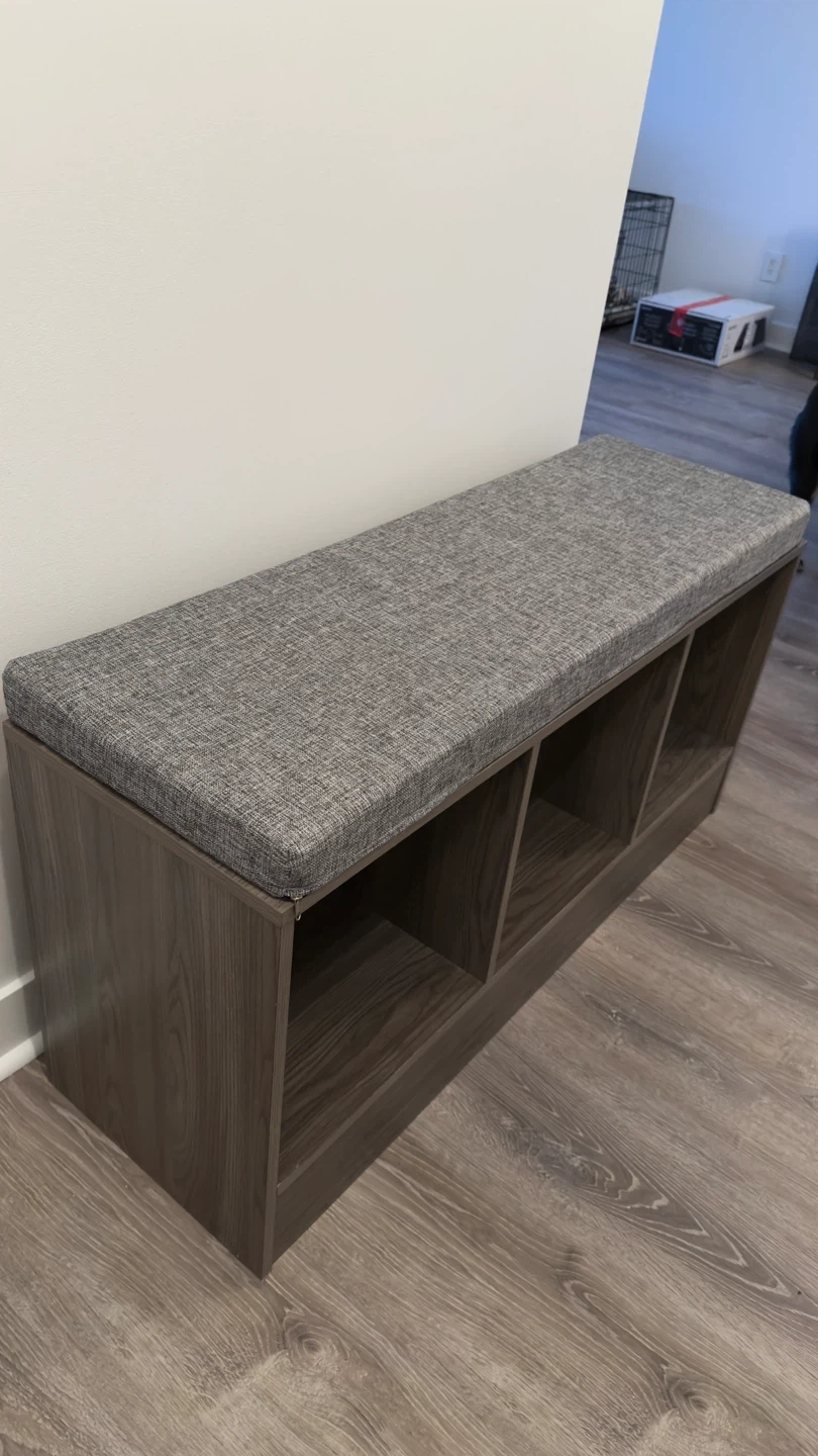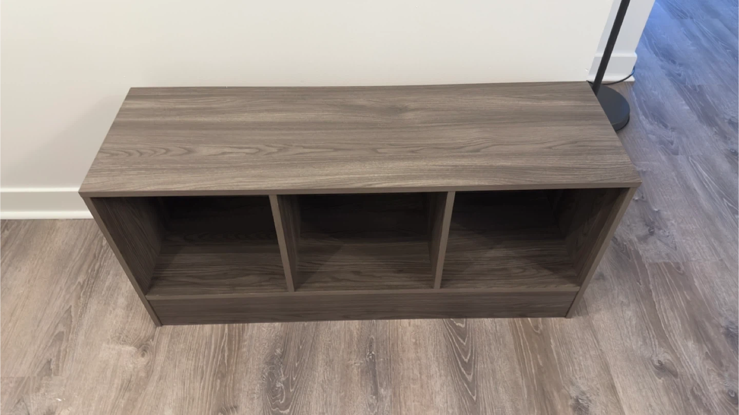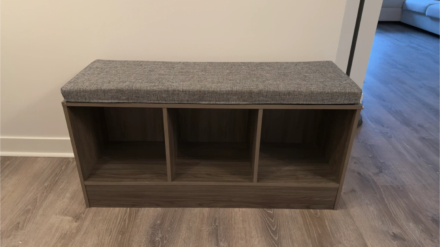This storage bench features a grey upholstered seat and a wood-grain finish with three open cubbies below. It's a practical piece for entryways or bedrooms. The bench offers seating and convenient storage for shoes, bags, or other items.