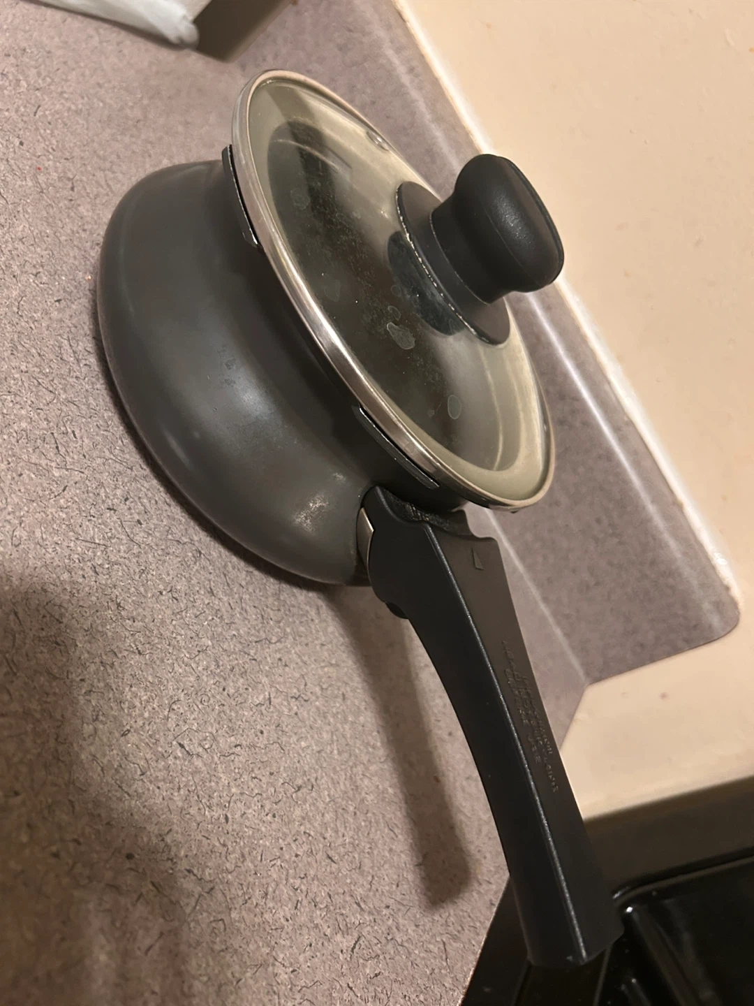 Saucepan with a black exterior and a glass lid. It features a sturdy black handle. This pot is suitable for everyday cooking tasks.