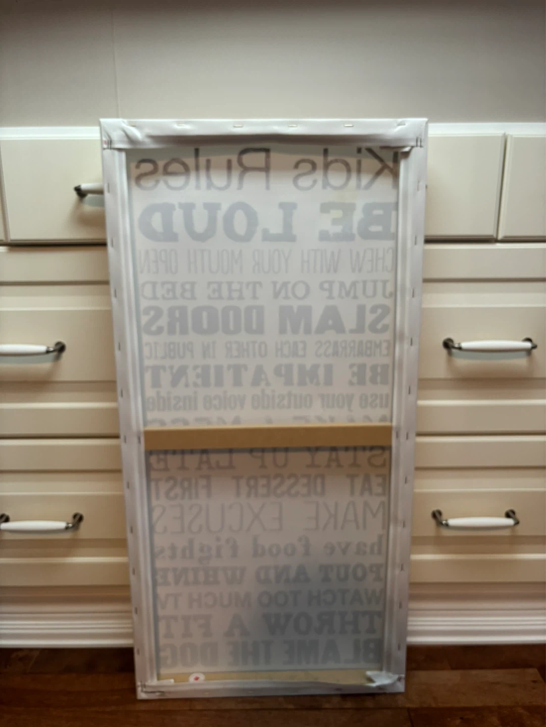 This canvas art lists humorous 'Kids Rules' like 'Be Loud' and 'Jump on the Bed'. It's a fun piece for a family home! The canvas is stretched over a wooden frame.