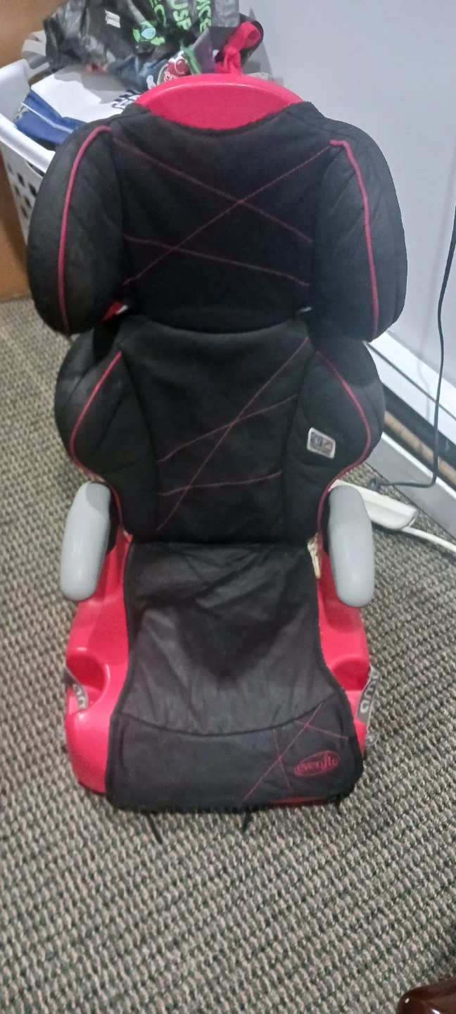 This is an Evenflo car seat booster. It's black and pink with red stitching. The seat cover is removable for washing. It's a booster for older kids who no longer need a full car seat.