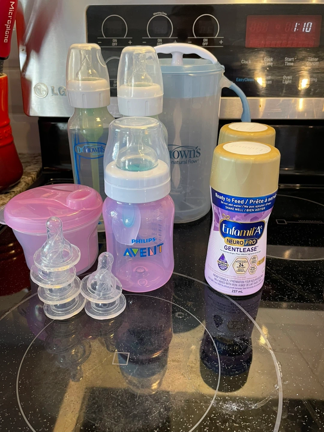 Formula mixing pitcher, formula serving compartment, 2 x Dr. Browns anti colic bottles with extra size 2 and 3 nipples, 1 x Philips Avent anti colic bottle (never used)