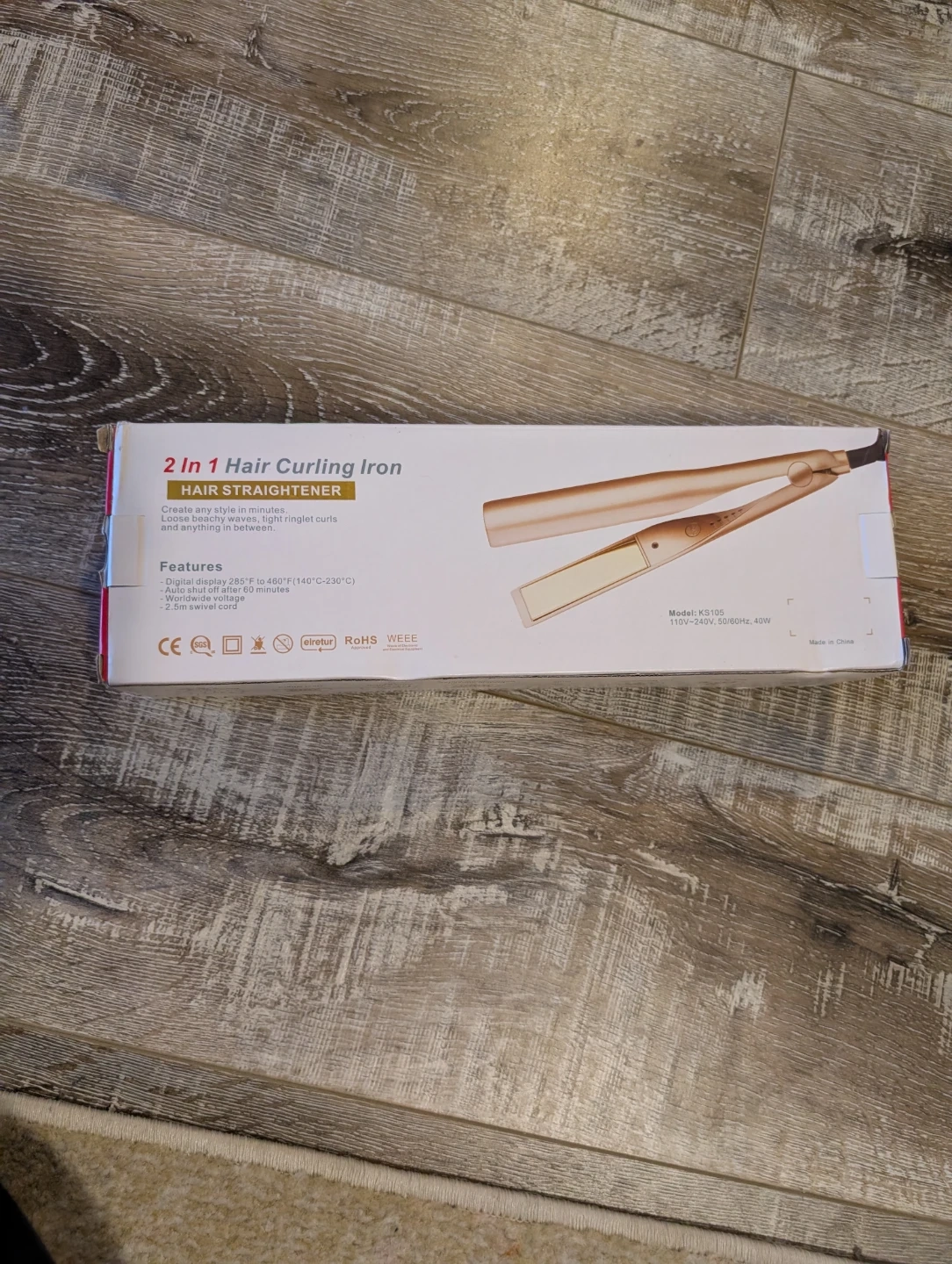 Create any style in minutes with this 2-in-1 hair curling iron and straightener. It features a digital display with temperatures from 285°F to 460°F and has an auto shut-off after 60 minutes. The worldwide voltage and 2.5m swivel cord offer convenience.