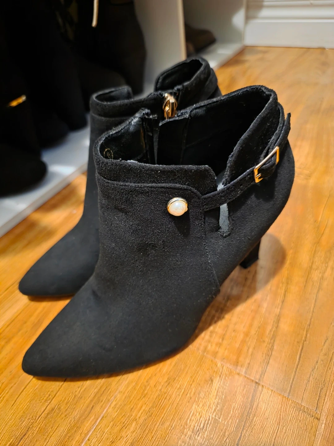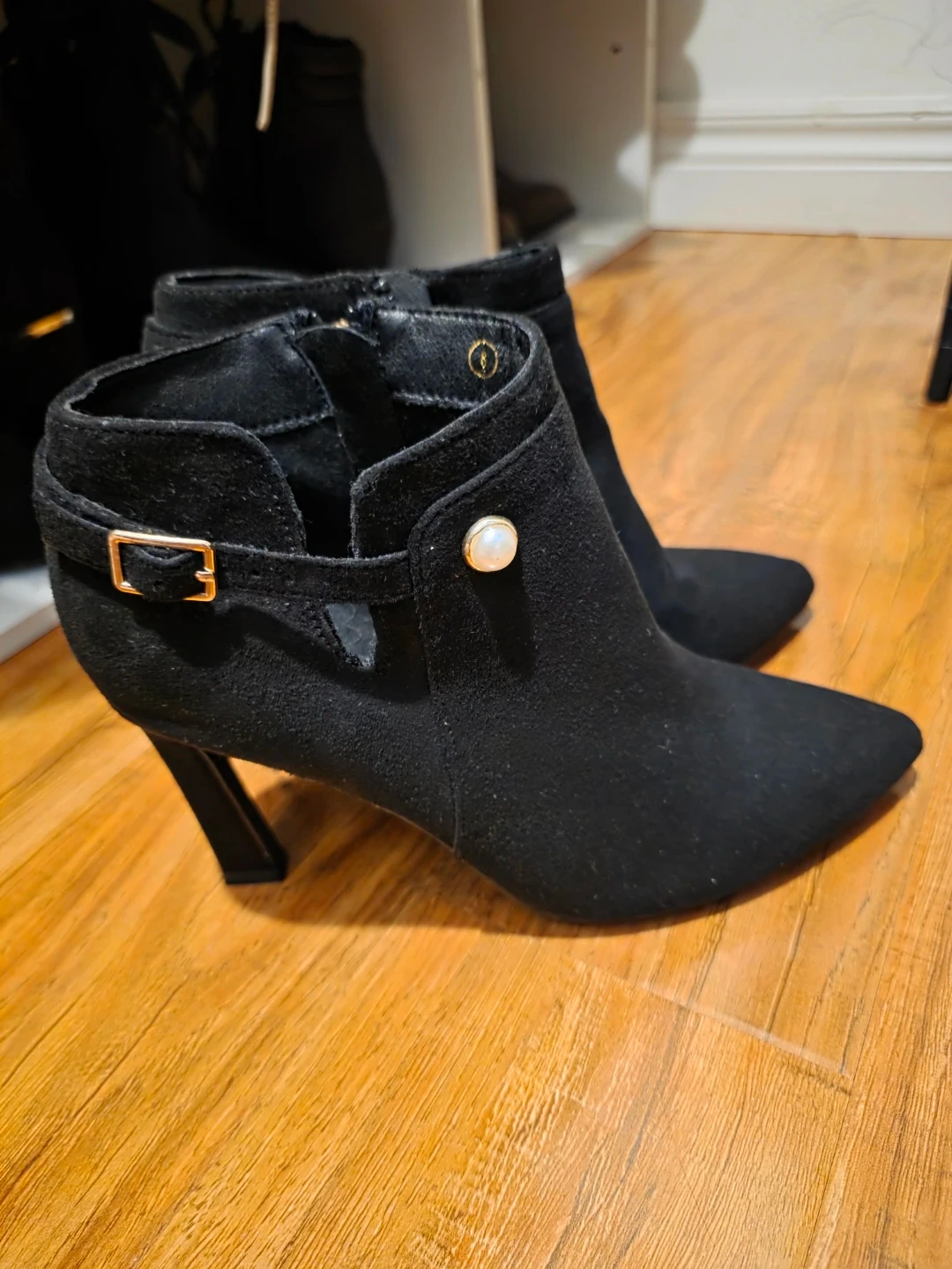 Selling a pair of black heeled ankle boots. They feature a side zipper and a decorative buckle and button. These boots are in great condition and ready for a new owner!