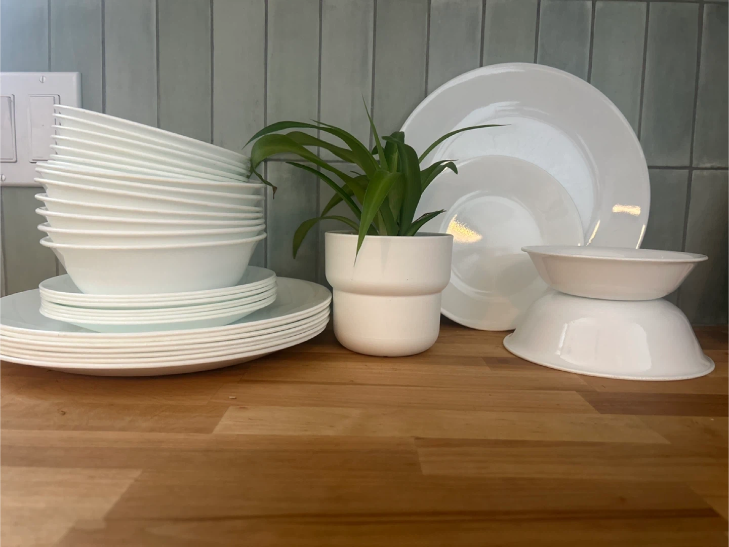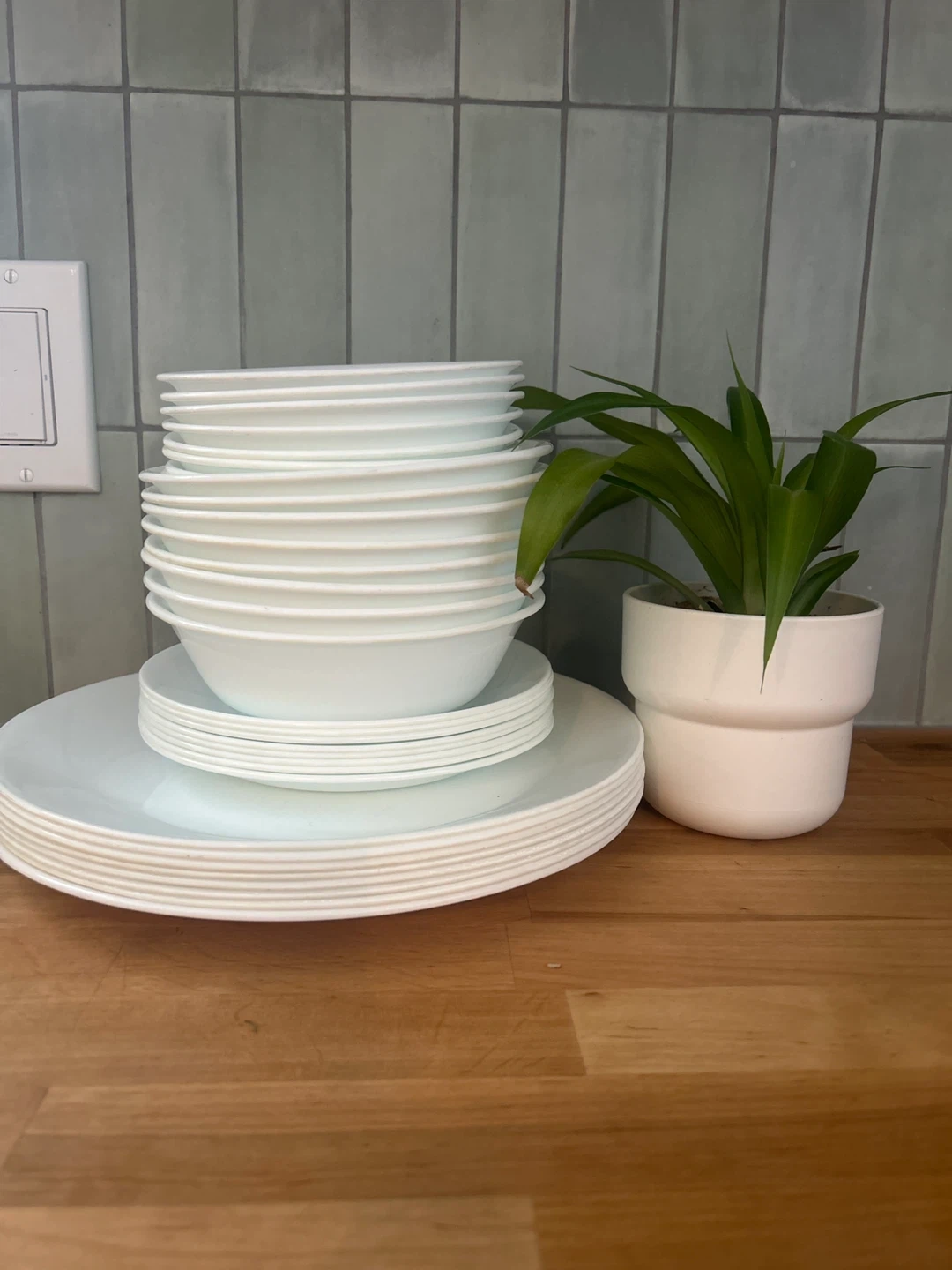 A set of 8 white Corelle dishes. This set includes dinner plates, salad plates, and cereal bowls and fruit bowls. Good used condition.