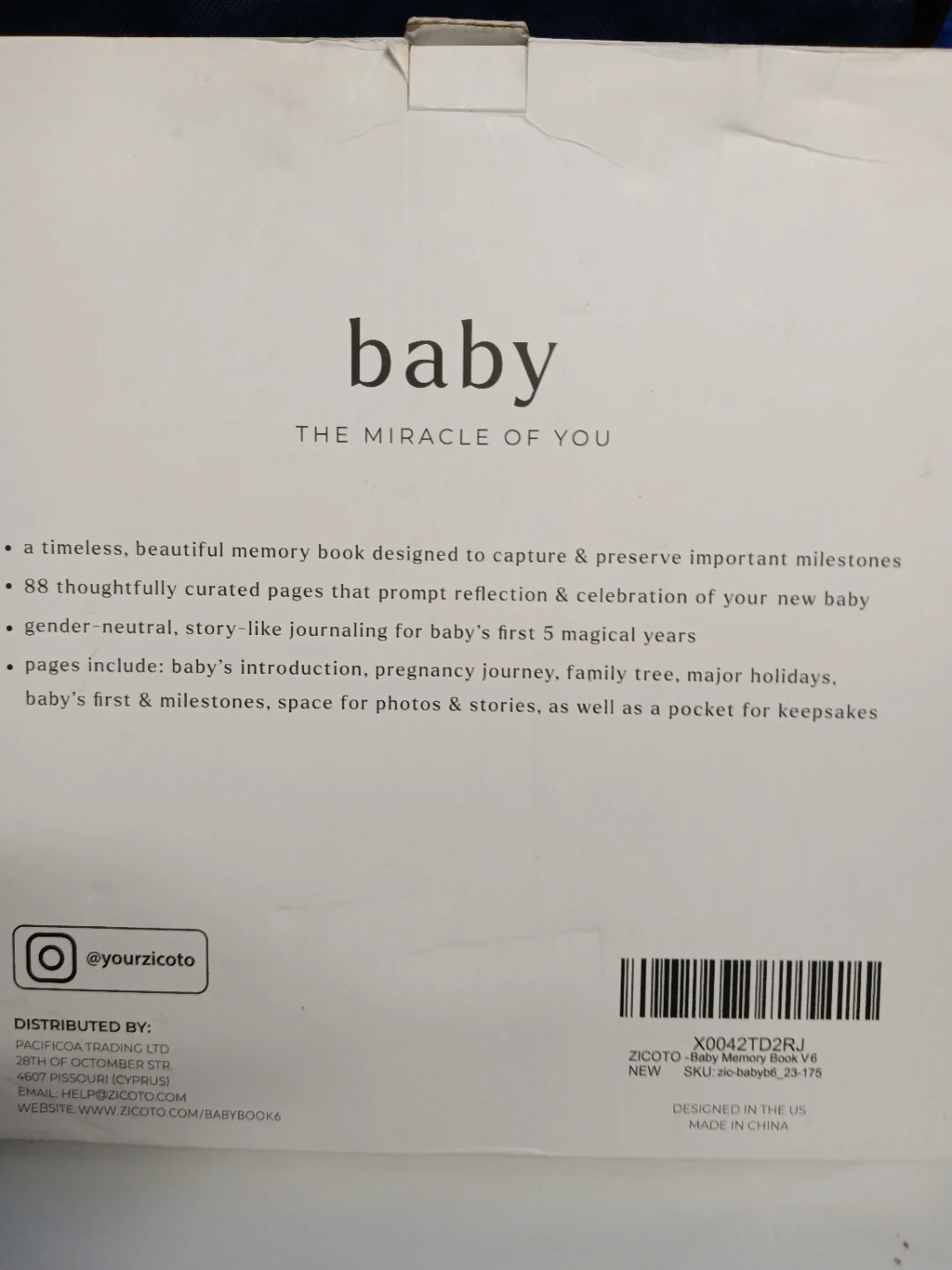 This is the Zicoto 'Baby, The Miracle of You' memory book. It's a timeless, beautiful book designed to capture and preserve important milestones. It includes 88 thoughtfully curated pages for journaling baby's first 5 magical years, pregnancy journey, and space for photos.