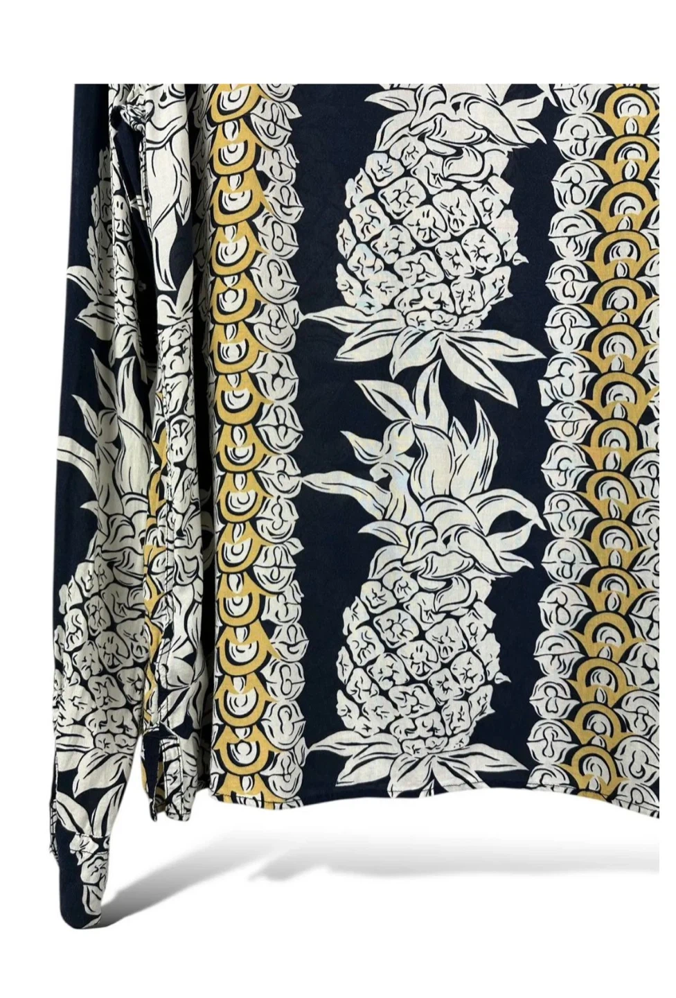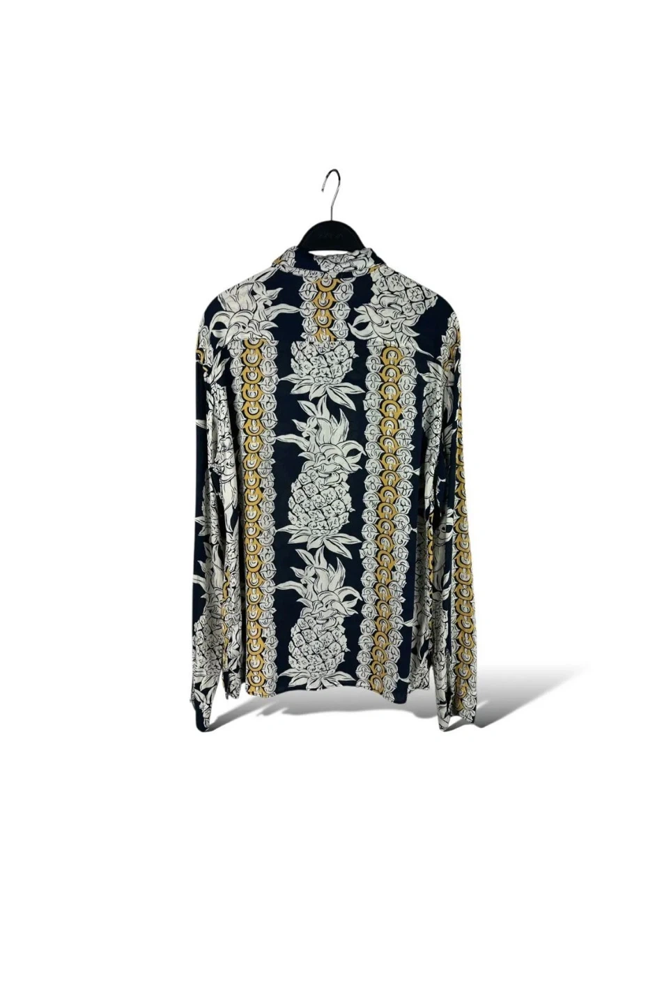 Cool button-up shirt with a fun pineapple and chain link pattern. It's a long-sleeve style with a classic collar and button closure. Great for adding some tropical flair to your outfit!