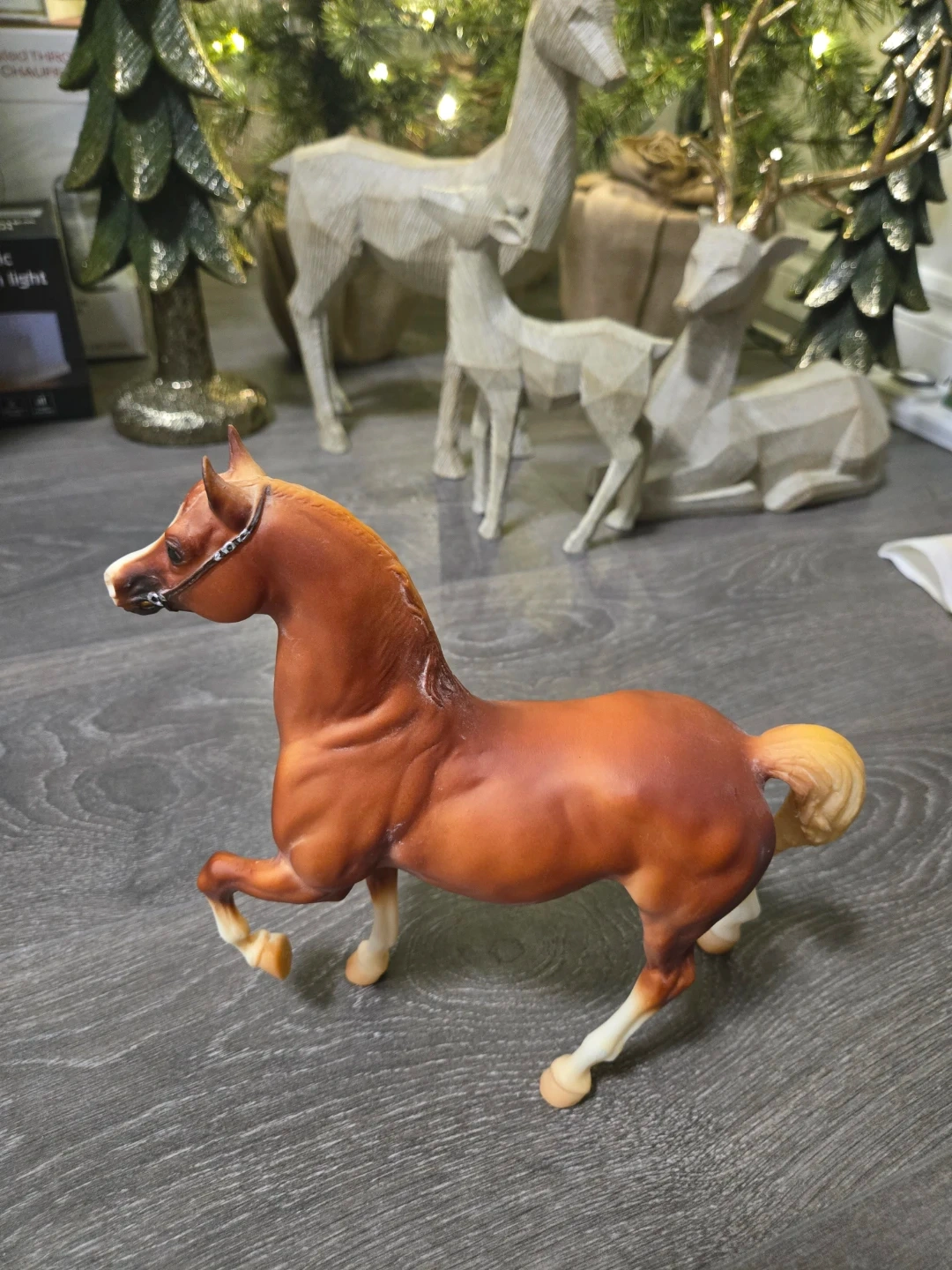 Selling a Breyer horse figurine. He is brown in colour with white markings and blondish hair. It's in good condition and would be a lovely addition to any collection! It's a model of a famous racing horse. Great gift for horse lovers or horse racing fans!