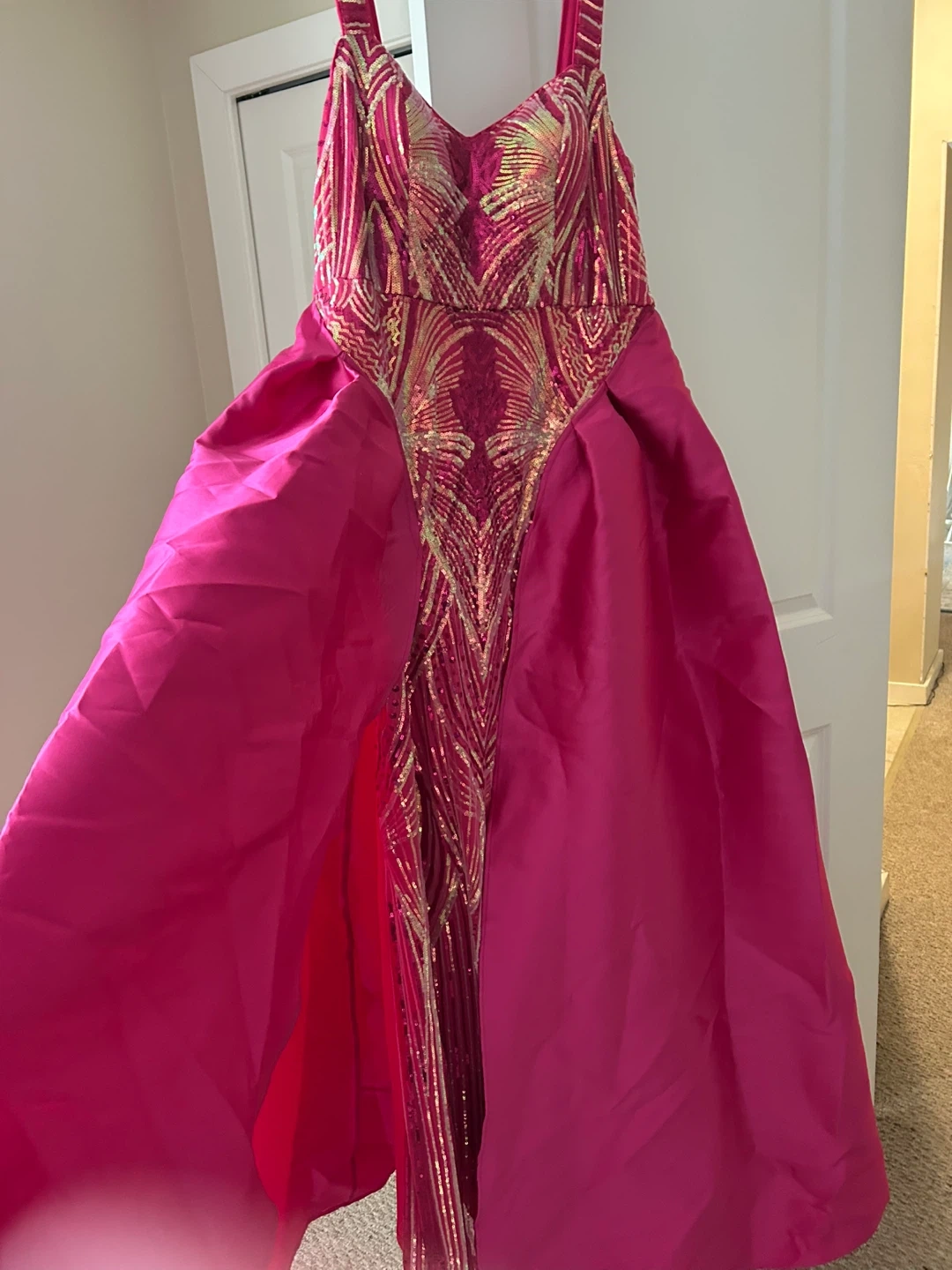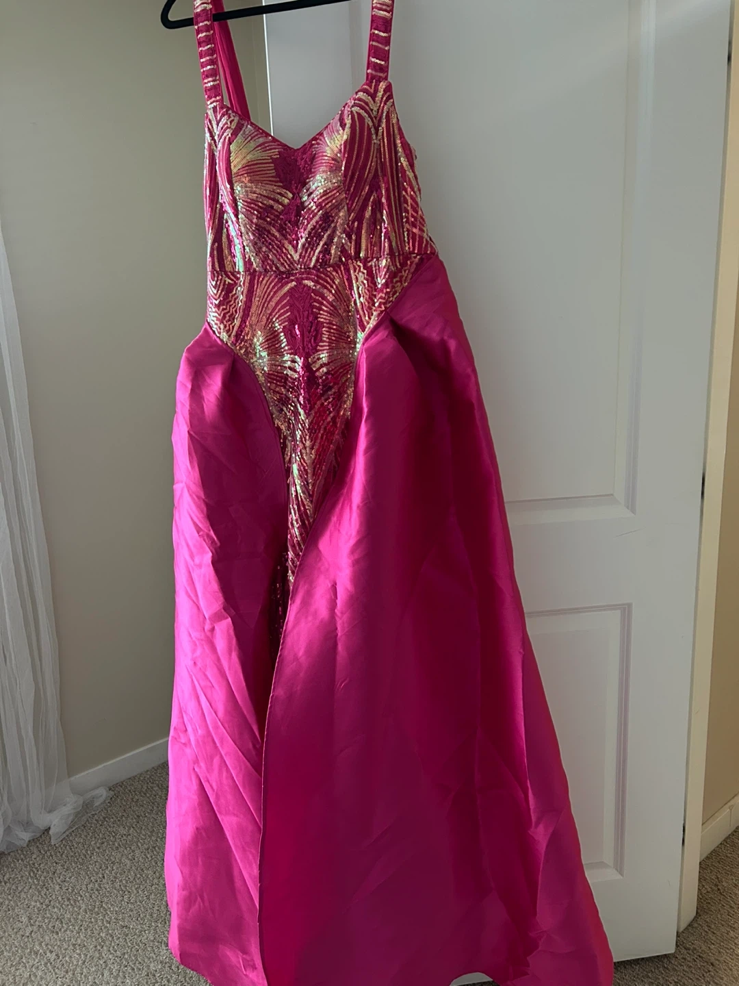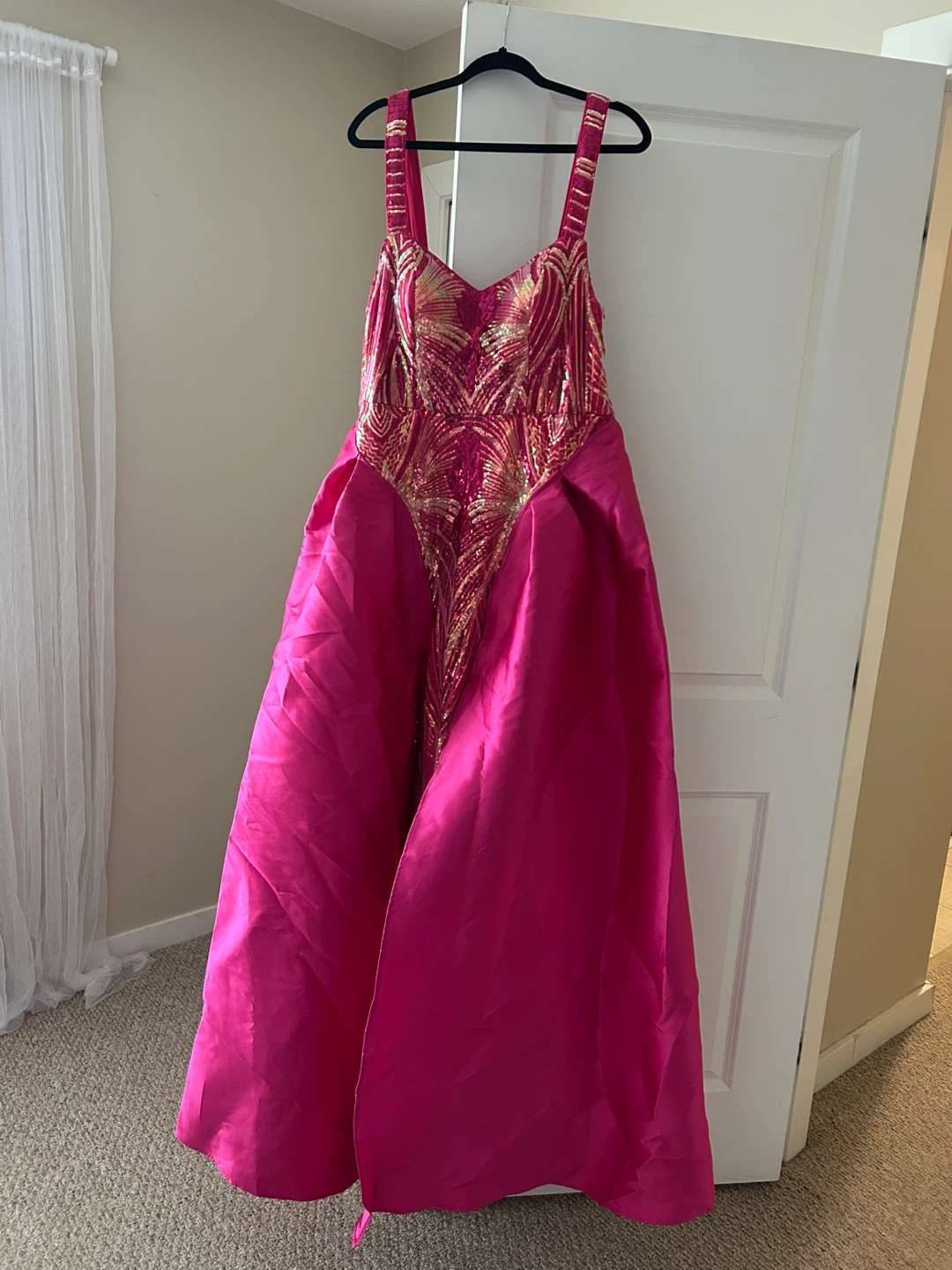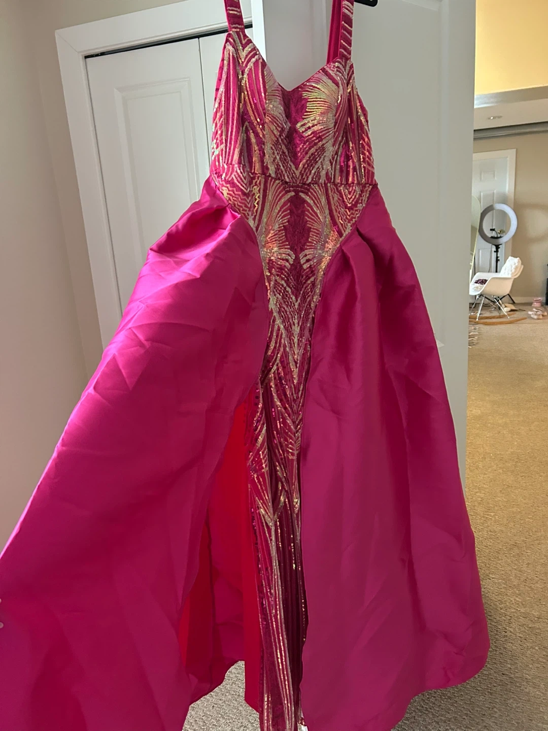 This is a beautiful pink gown featuring intricate gold sequin embellishments on the bodice. Size 2XL, It's a floor-length dress with wide shoulder straps. Perfect for a formal event or a special occasion!