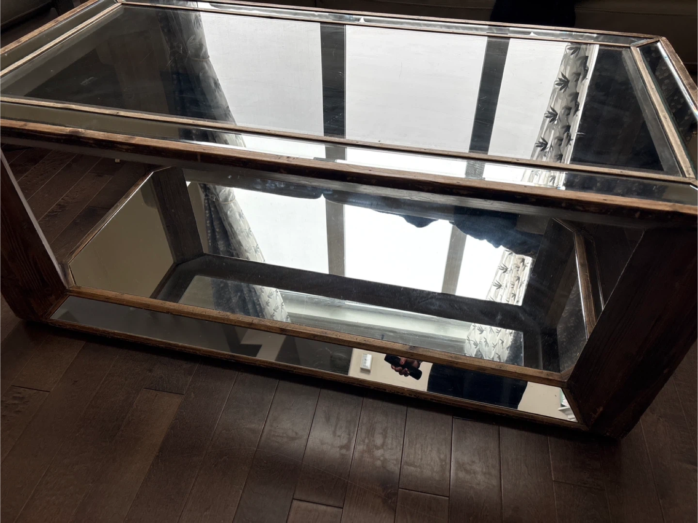 A stylish mirrored coffee table with a wooden frame. It features a spacious top and a lower shelf for storage or display. Great for a living room or den!