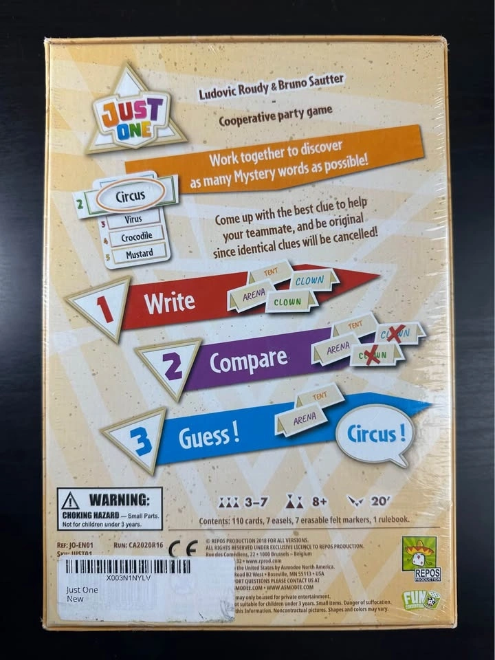 Just One is a cooperative party game where you work together to guess as many mystery words as possible. Try to give a unique clue, as identical clues will be cancelled! A full game is played over 13 rounds. The goal is to get a score as close to 13 as possible.
