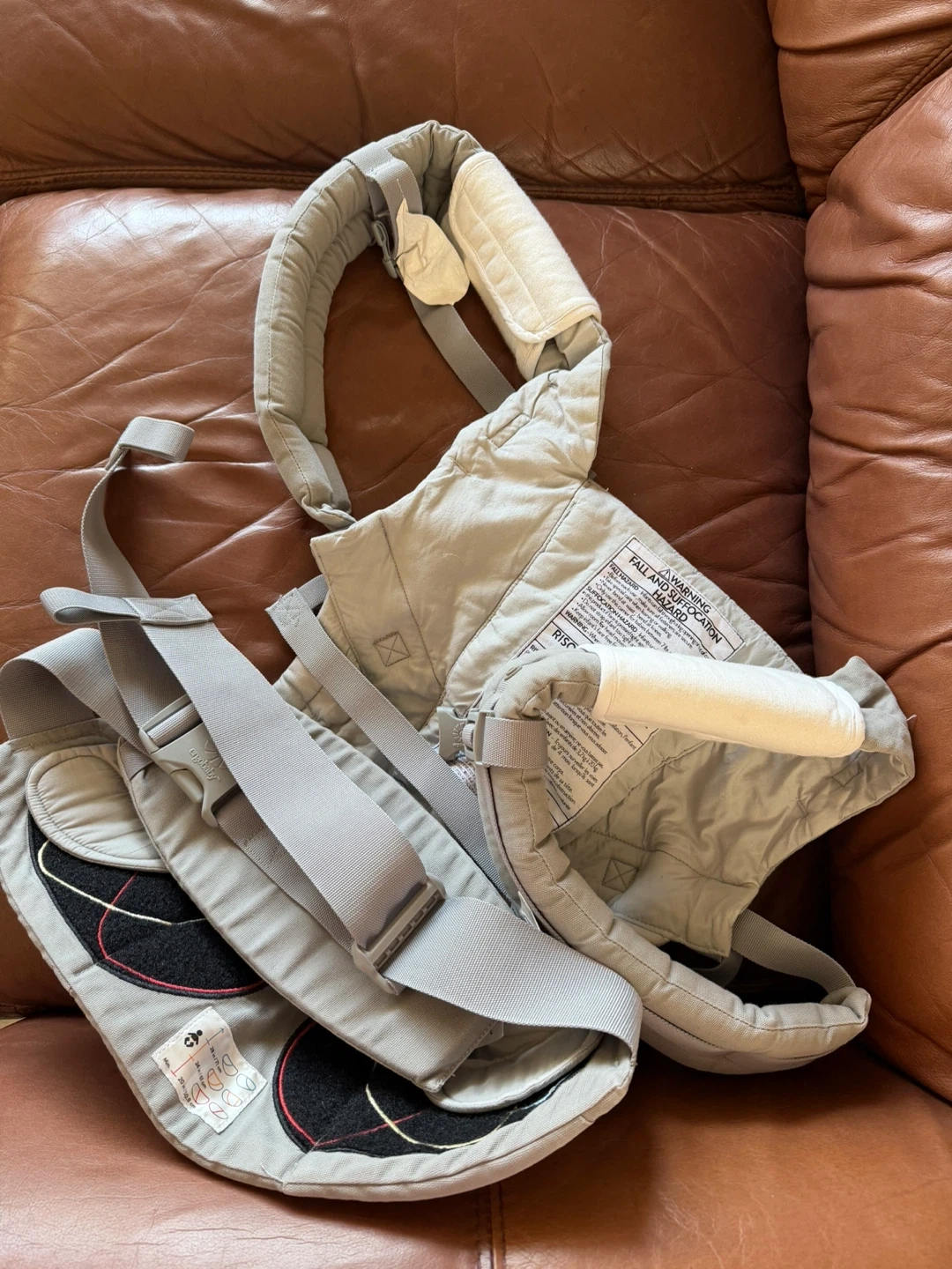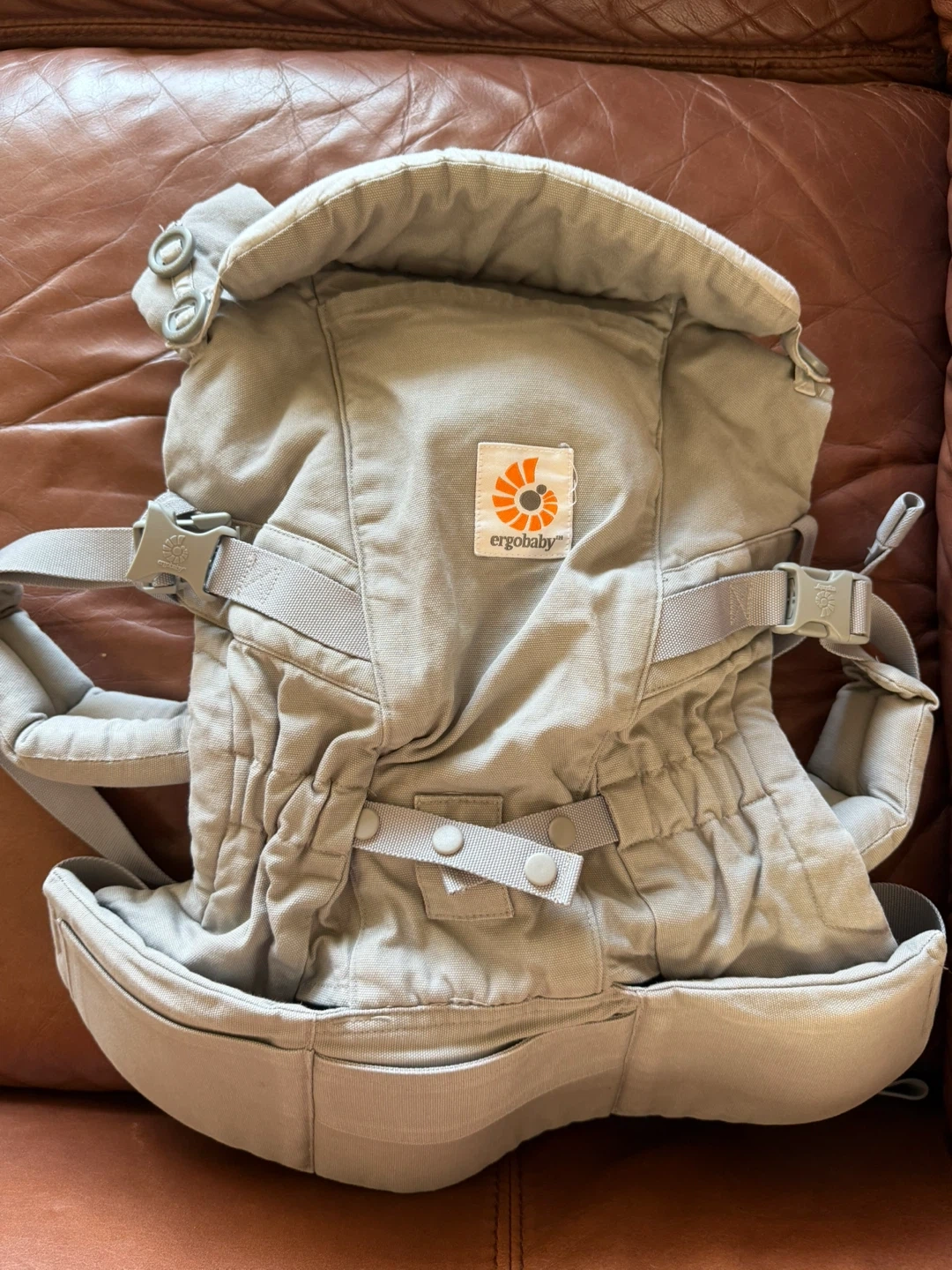 Ergobaby baby carrier in grey. It's made from durable fabric for comfort and support. This carrier is designed for babies and toddlers. It offers multiple carrying positions for versatility!