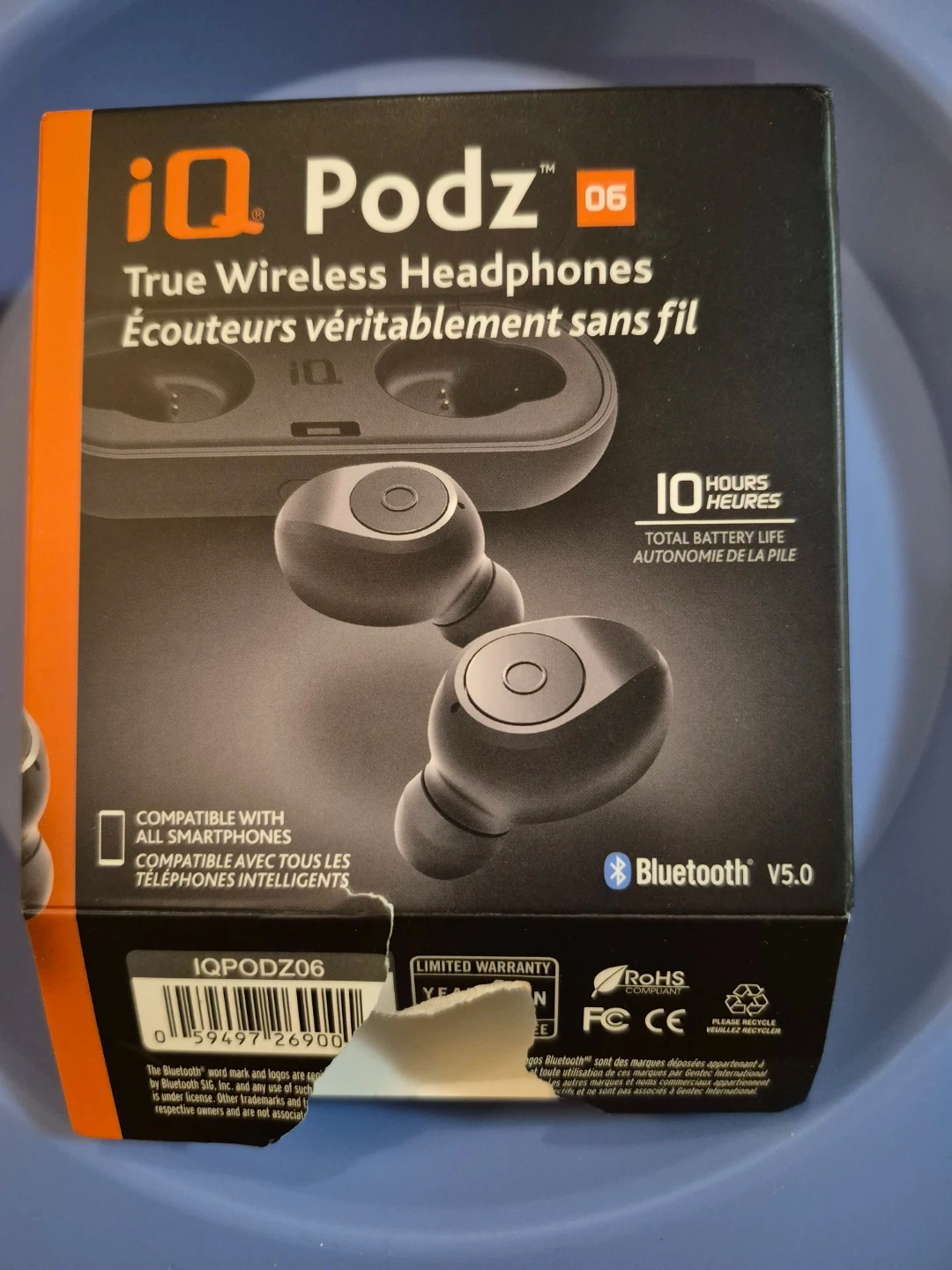 These iQ Podz 06 are true wireless headphones. They offer up to 2.5 hours of listening time on a single charge, with a total battery life of 10 hours when using the charging case. Includes charging case, micro USB cable, and 1 size of ear tips