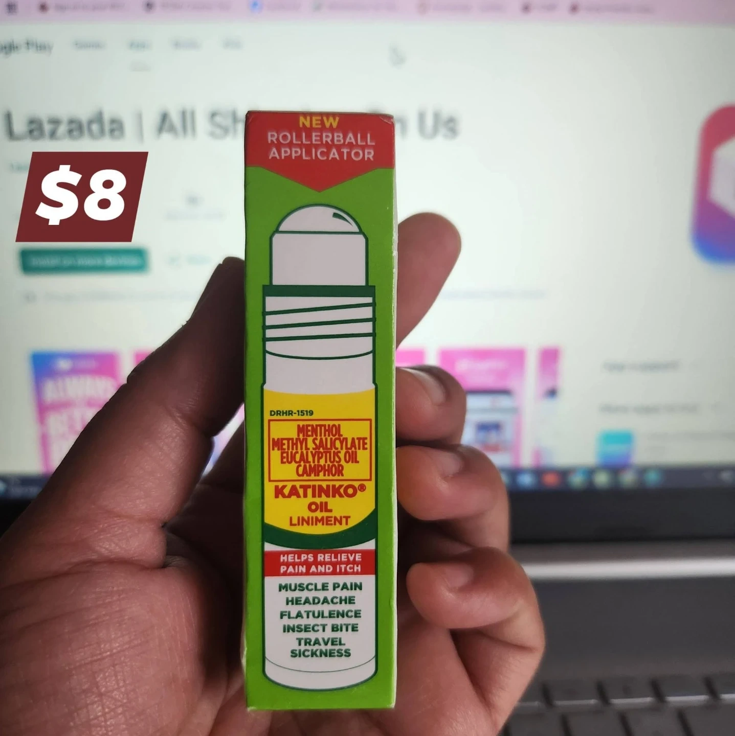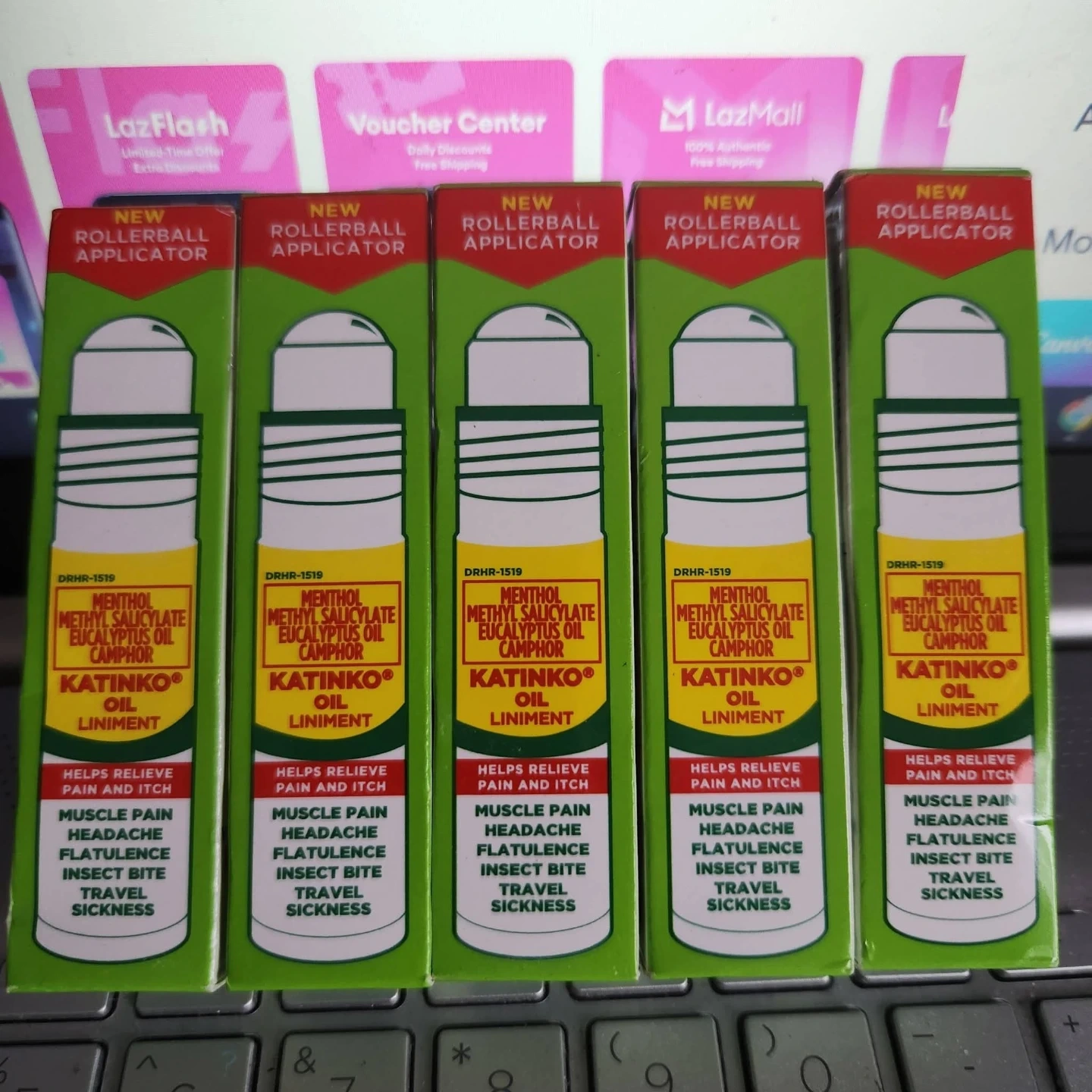 This is a five-pack of Katinko Oil Liniment with a new rollerball applicator. It helps relieve pain and itch from muscle pain, headache, flatulence, insect bites, and travel sickness. The formula contains menthol, methyl salicylate, eucalyptus oil, and camphor.