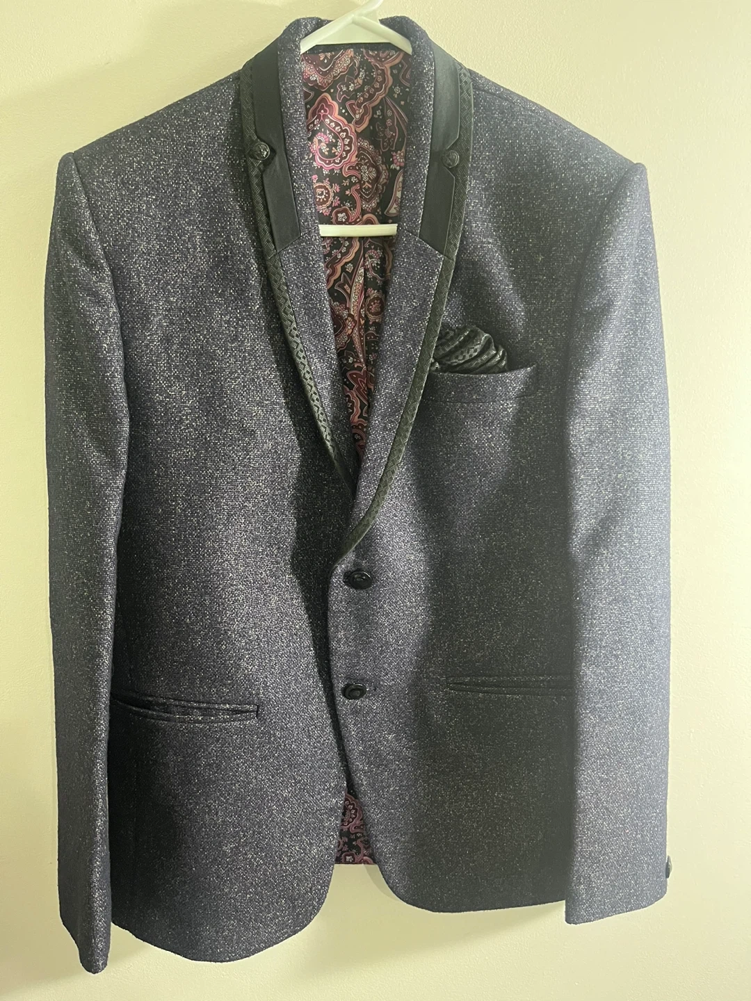 This men's blazer features a unique textured fabric in a deep navy hue. It has a contrasting paisley patterned lining in shades of pink and black, and a matching pocket square. The lapels are accented with black trim.