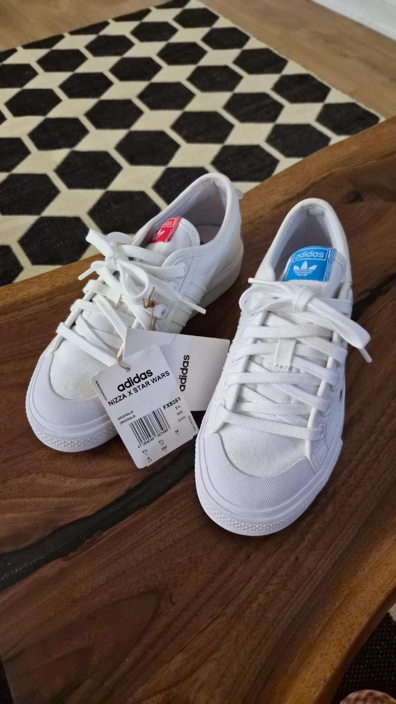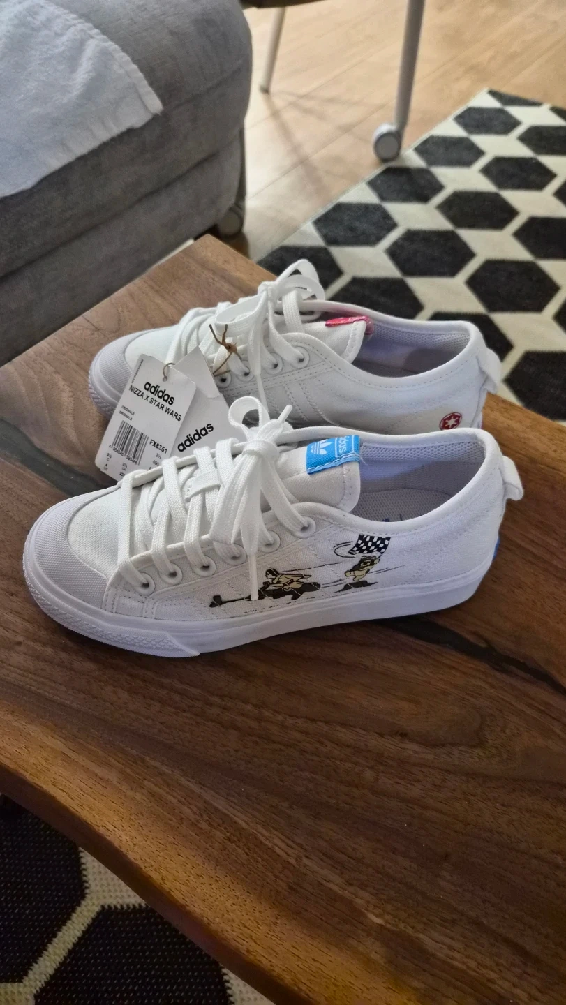 These white Adidas Nizza sneakers feature a fun Star Wars graphic print. They're a size 6 UK / 37 EU, made from durable canvas. Perfect for casual wear!