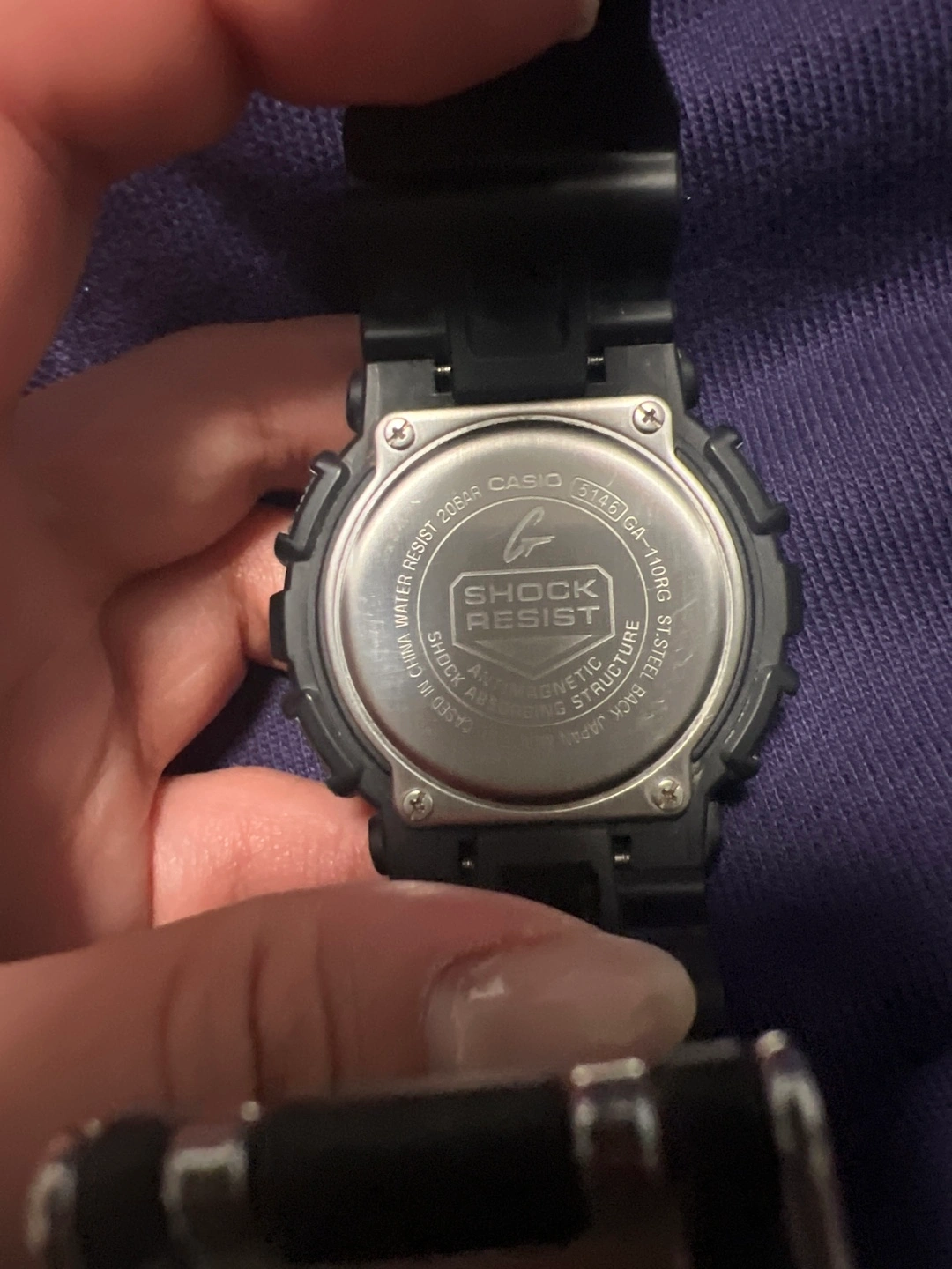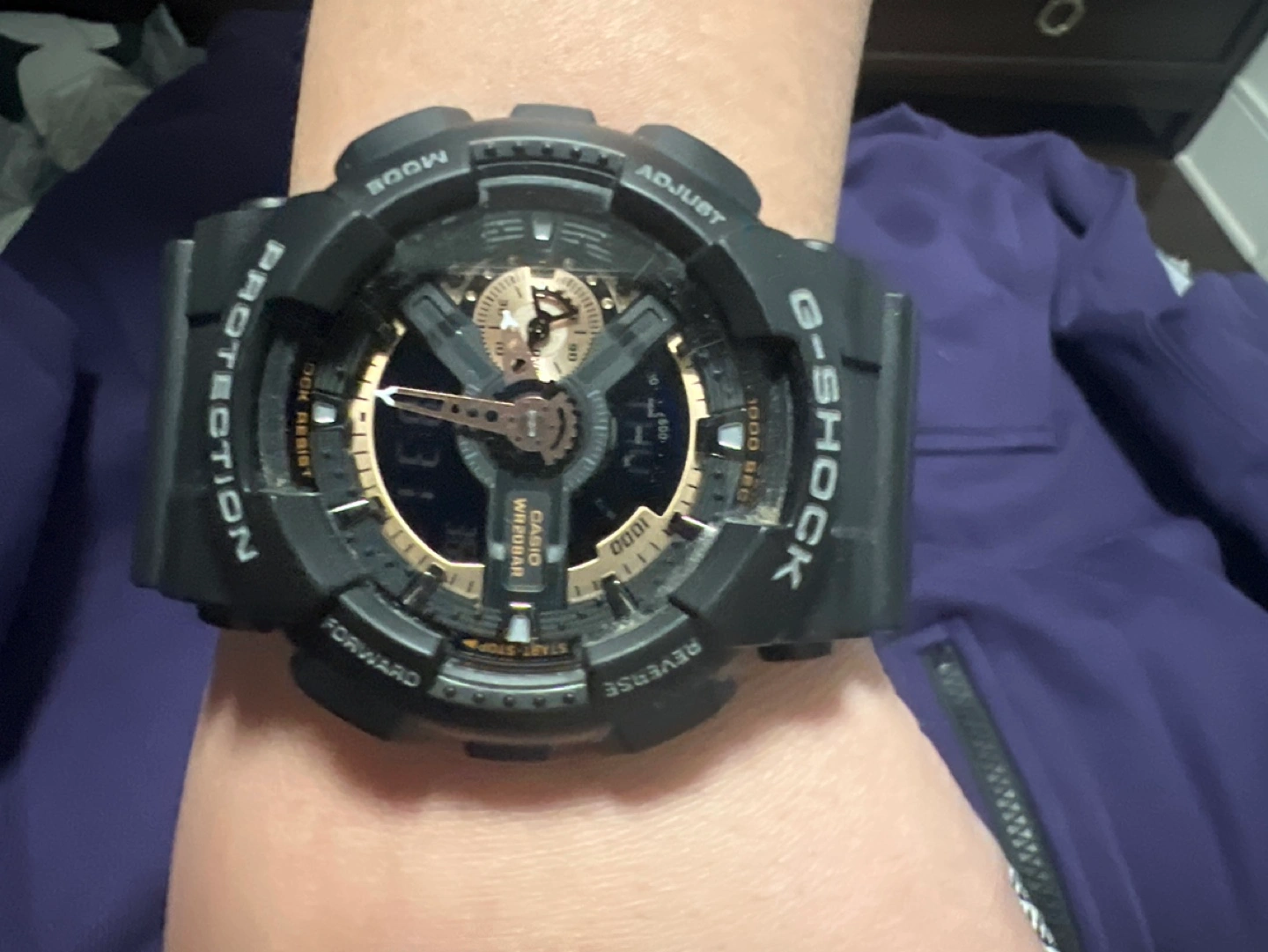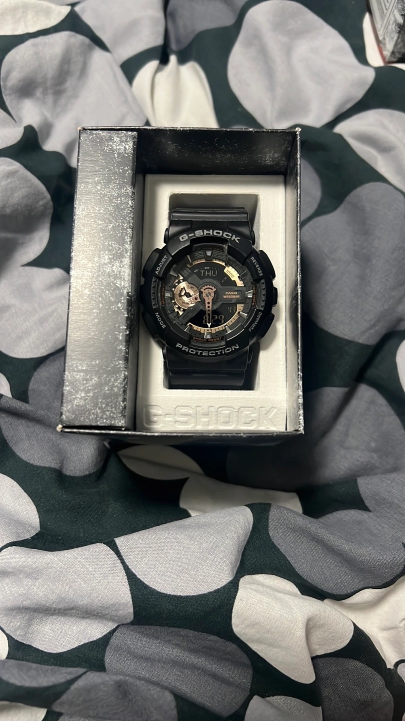 G-Shock watch, black resin band and bezel, rose gold accents. Shock resistant, water resistant. Includes original box.