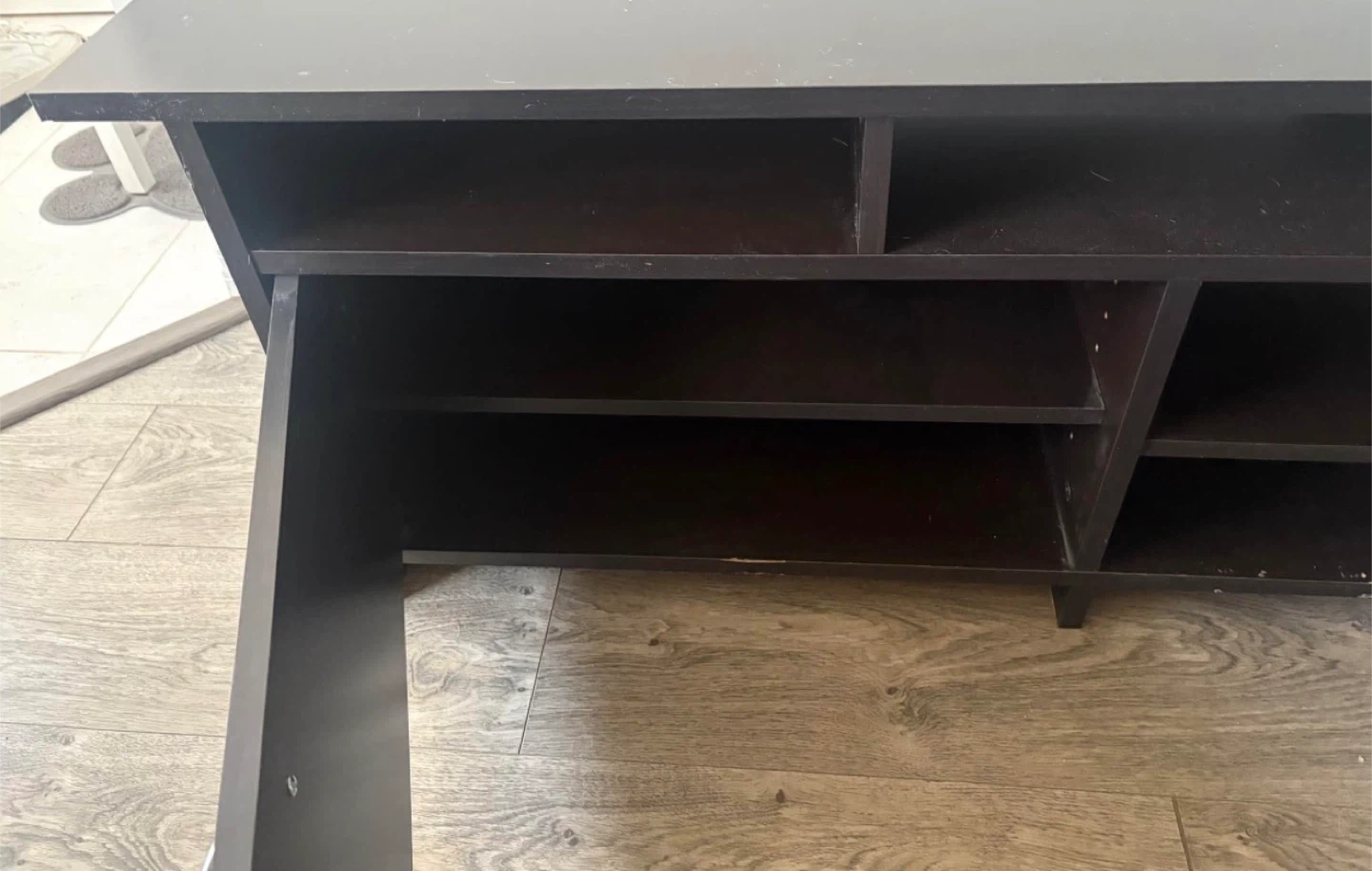 Dark brown TV stand with open shelving and two drawers for storage. It's great for organizing media consoles and accessories. Perfect for a living room or den!