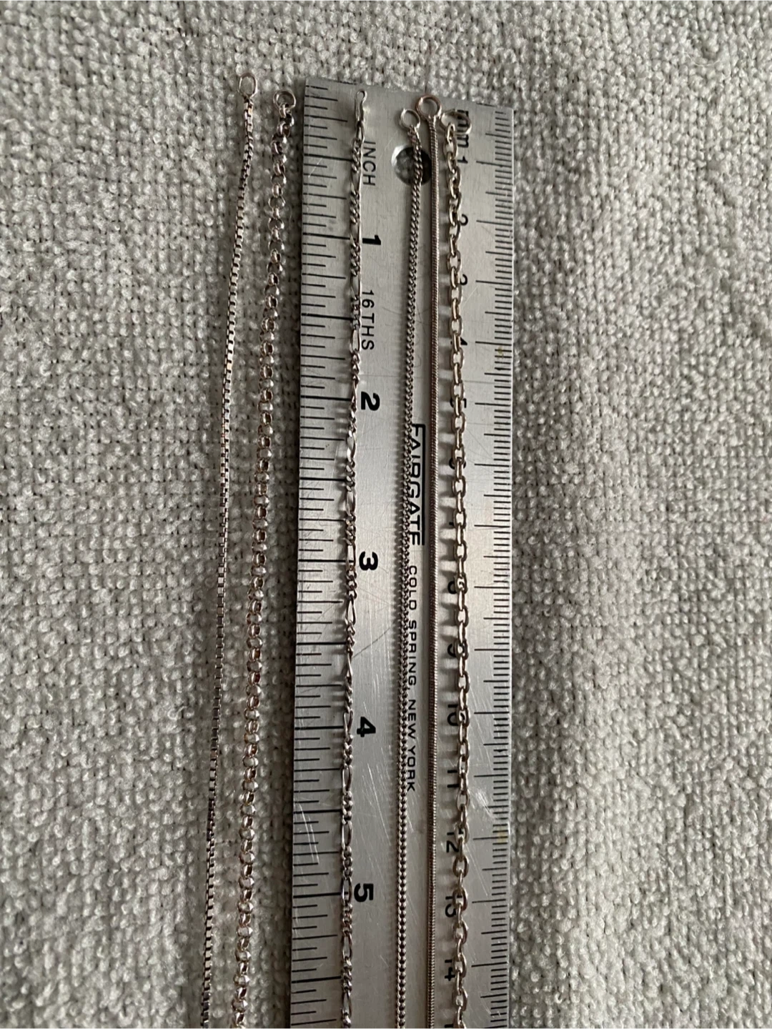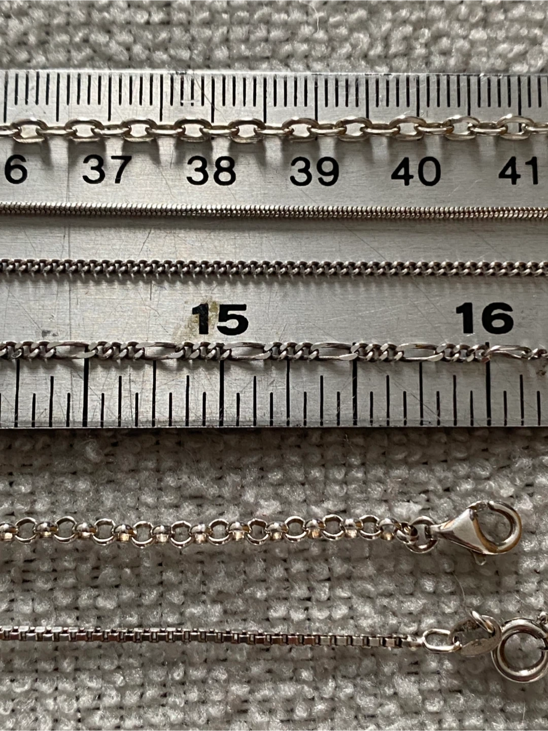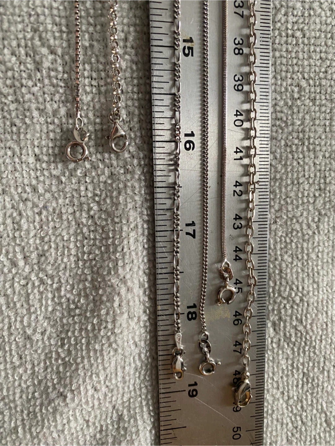 Five different 925 sterling silver chains, a box chain, a figaro chain, a snake chain, a rope chain, and a curb chain. Different lengths.$20 each