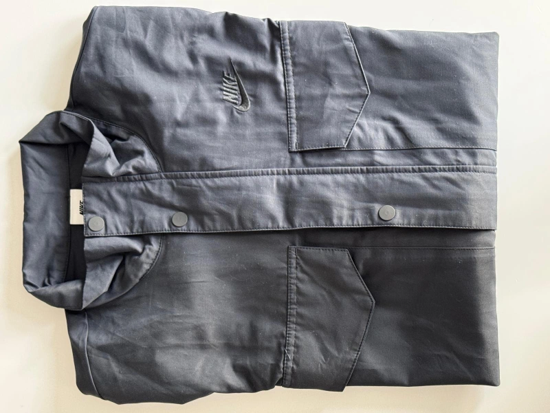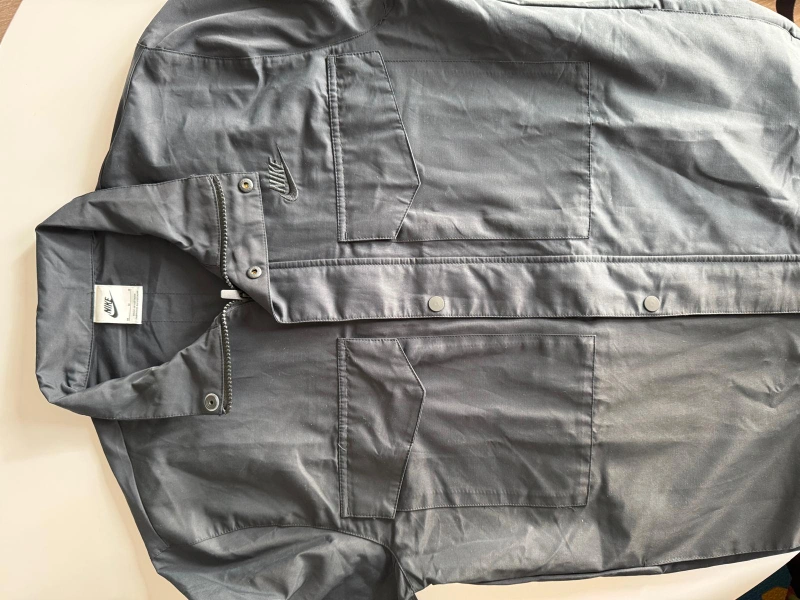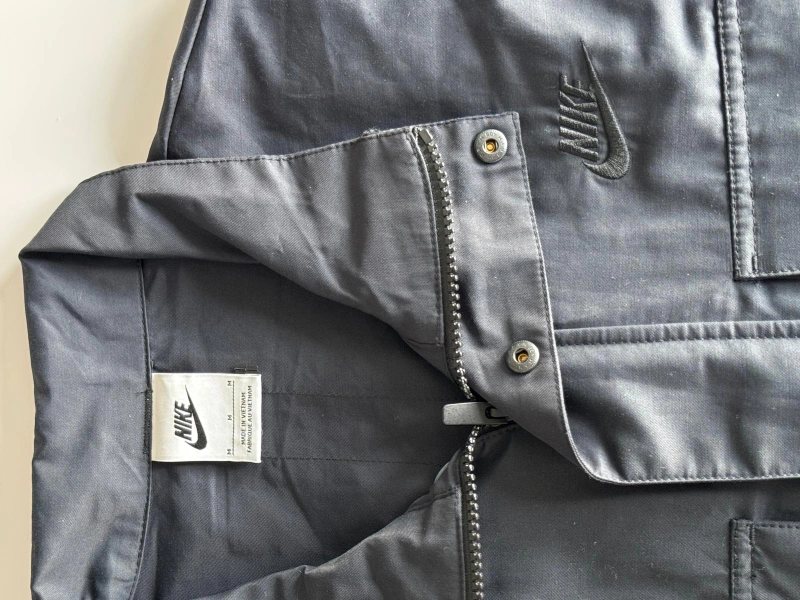 Black utility jacket. Features multiple pockets and a button-up front closure. Long sleeves with button cuffs. Has a zip-up collar.
