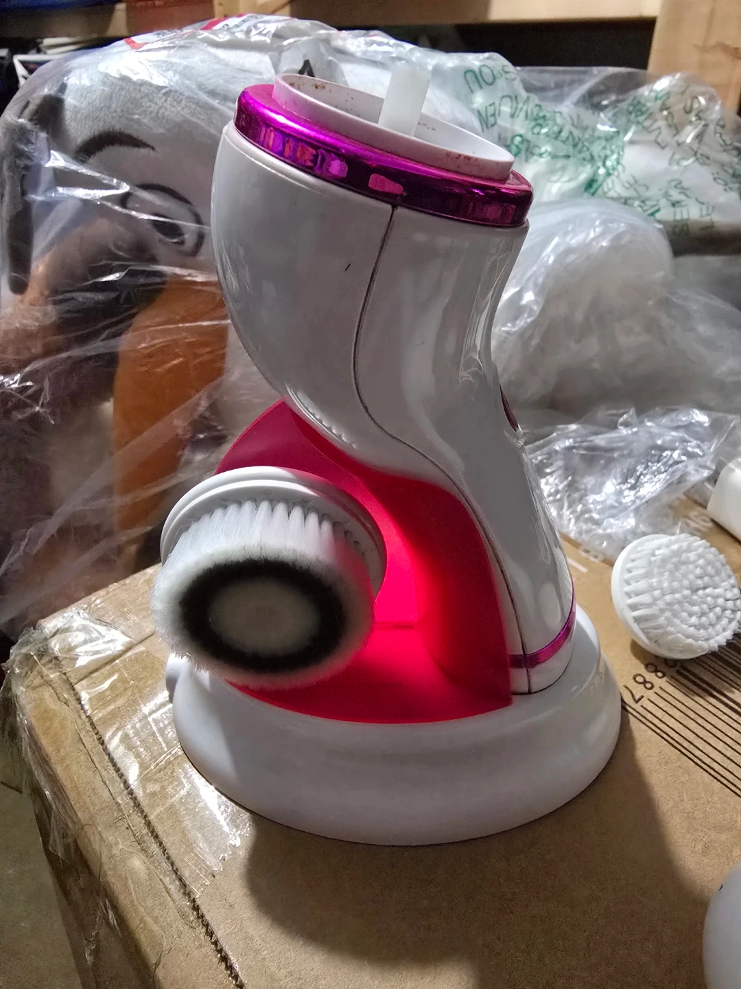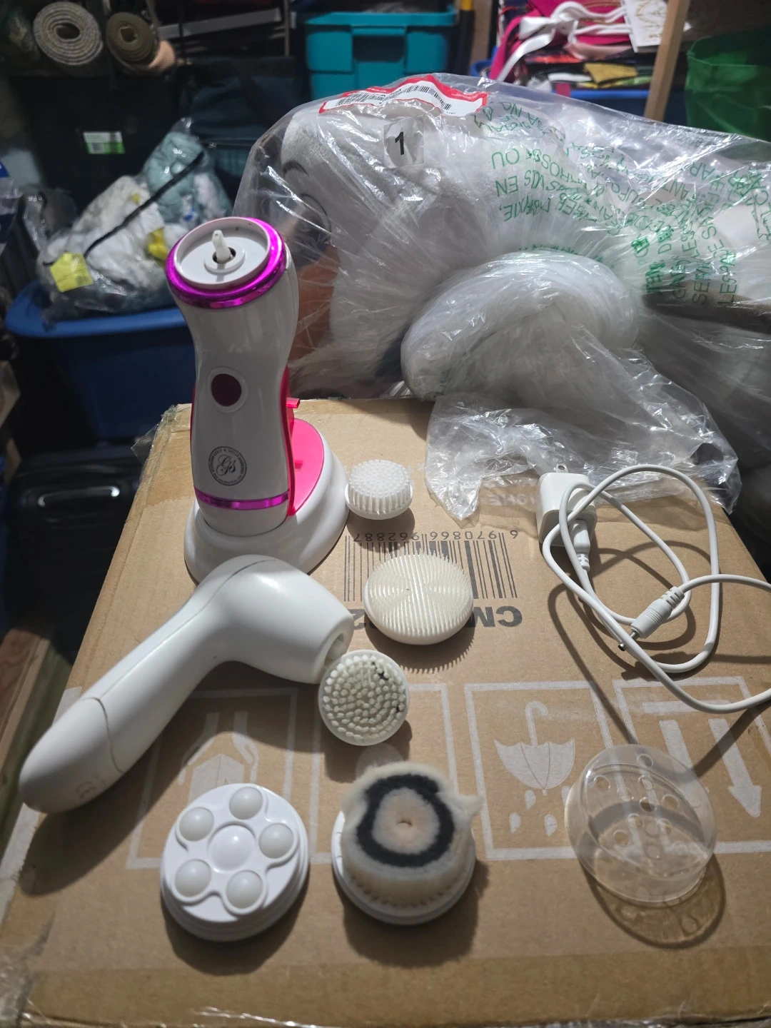 This 3-in-1 waterproof pro exfoliating spin brush is a cleansing system that removes dirt, exfoliates, and smooths skin. It comes with 4 attachments: 2 soft bristle brush heads, 1 silicone brush head, 1 massage ball brush head, a USB charger, and a charging stand. It has 2 speed functions and up to 2 hours of continuous spinning action with a full USB charge.