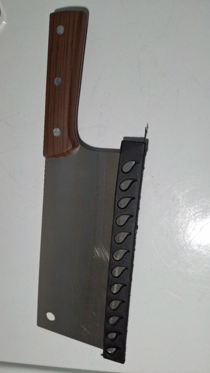 A metal cleaver with a wooden handle. It's got a protective black sheath for the blade. This knife is great for chopping meats and vegetables.