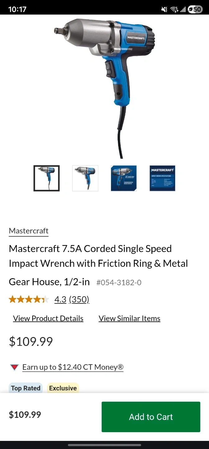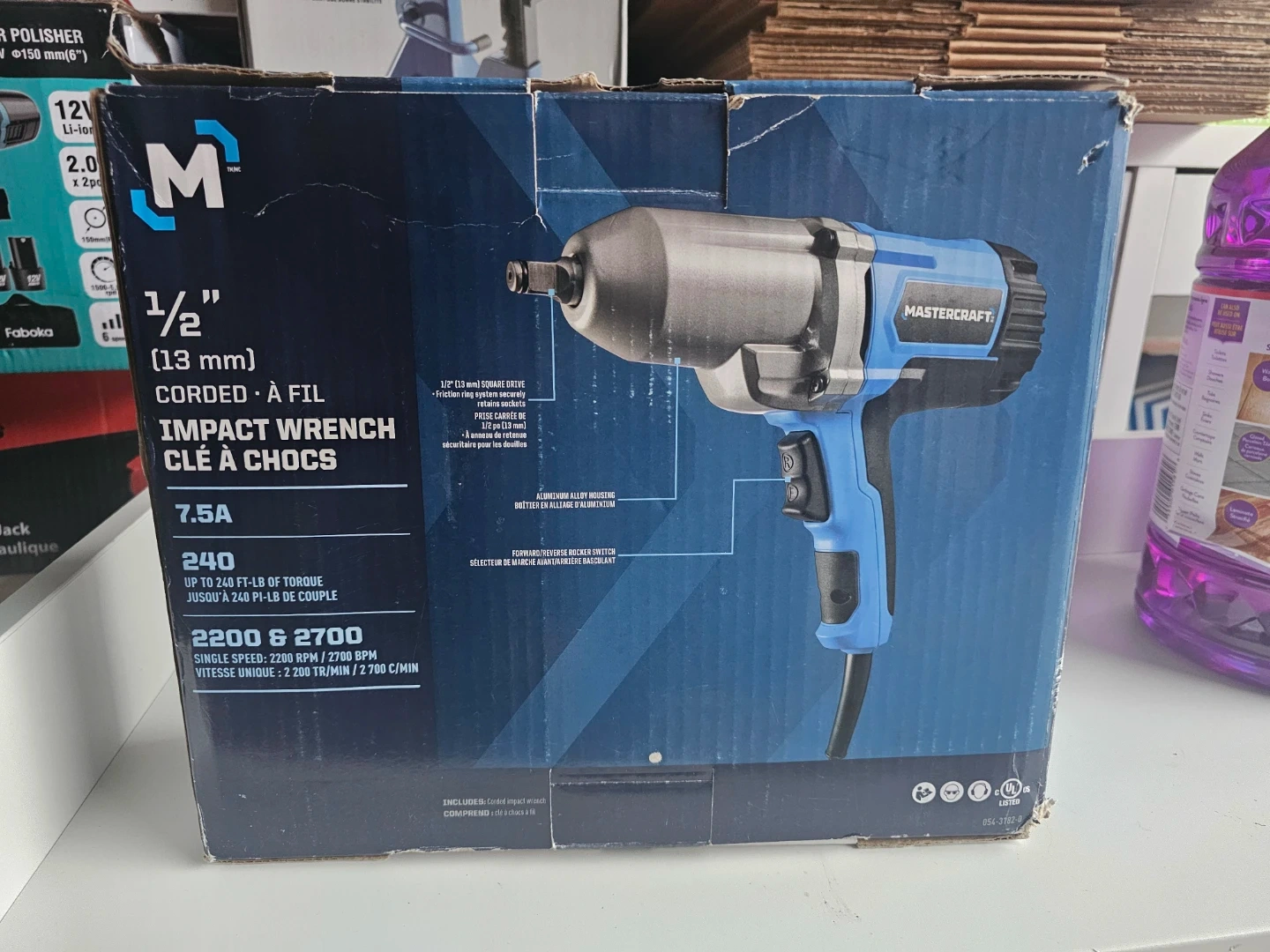 Mastercraft 7.5A corded single speed impact wrench. It's a 1/2-inch drive with a friction ring and metal gear house. Provides up to 240 ft-lb of torque and 2200/2700 RPM. Brand new never used.