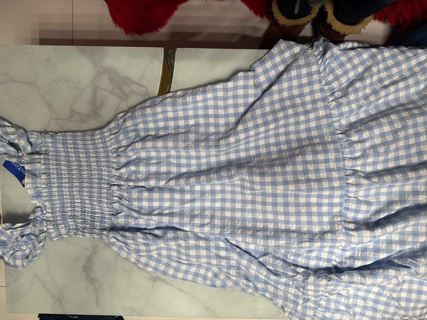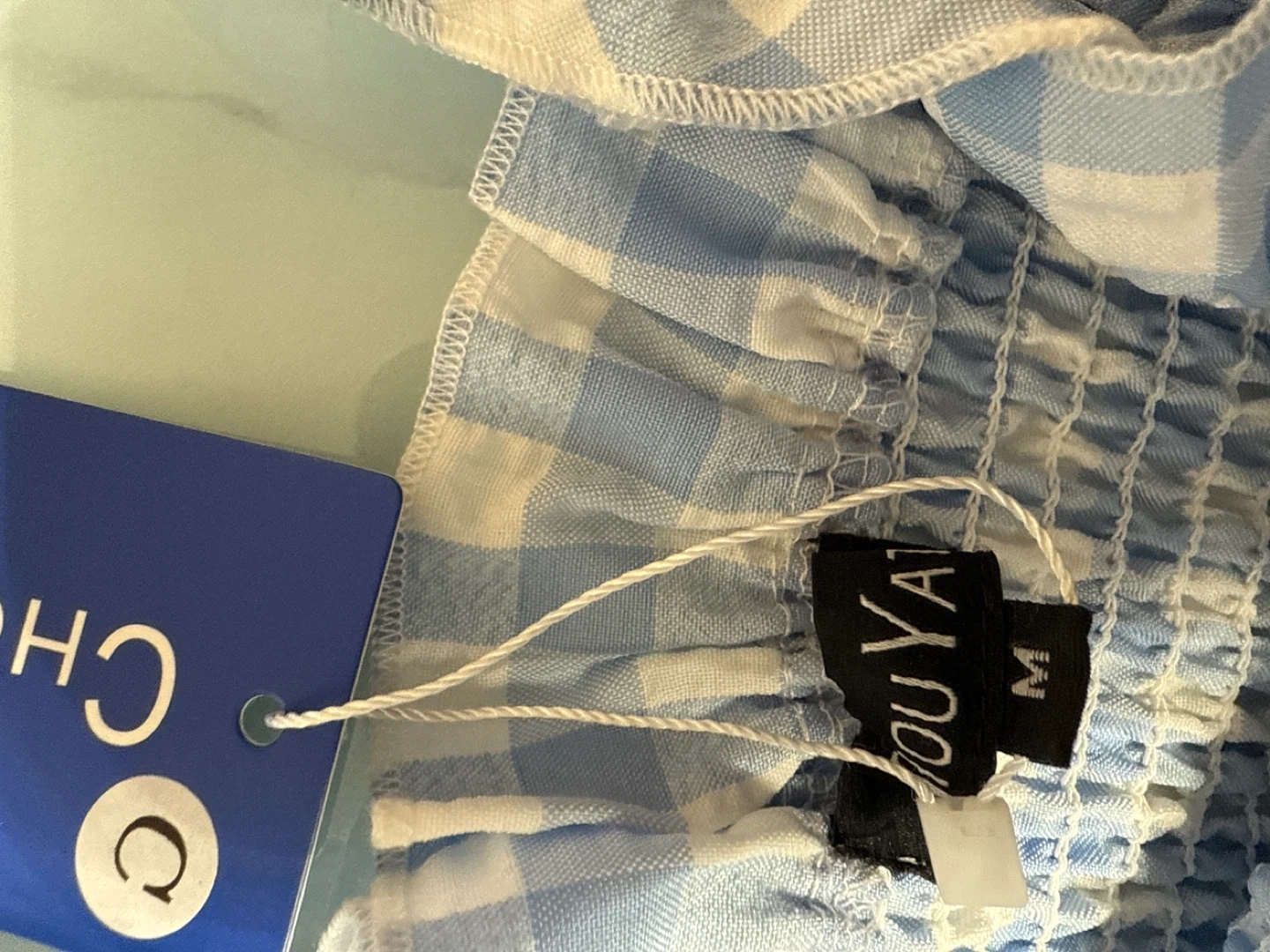 Selling a cute Chouyatou dress in a blue and white gingham pattern! It's a size medium and has a smocked bodice for a comfortable fit