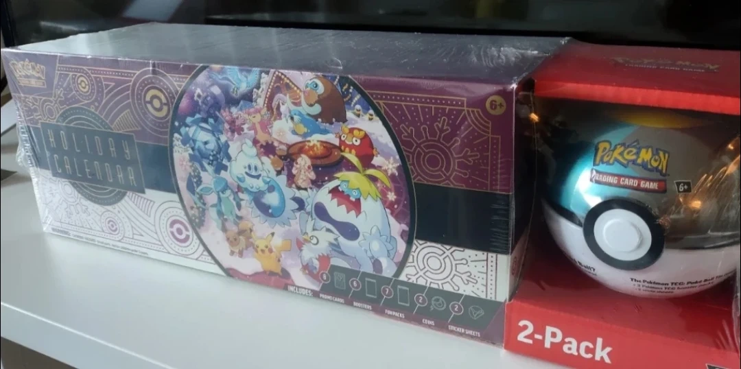 I'm selling TWO brand new Pokémon Holiday Calendar and Poké Ball Tin special combo packs! The Holiday Calendar includes promo cards, boosters, fun packs, coins, and sticker sheets. The Poké Ball Tins each contain 3 Pokémon TCG booster packs and 2 sticker sheets. Great for any Pokémon fan!